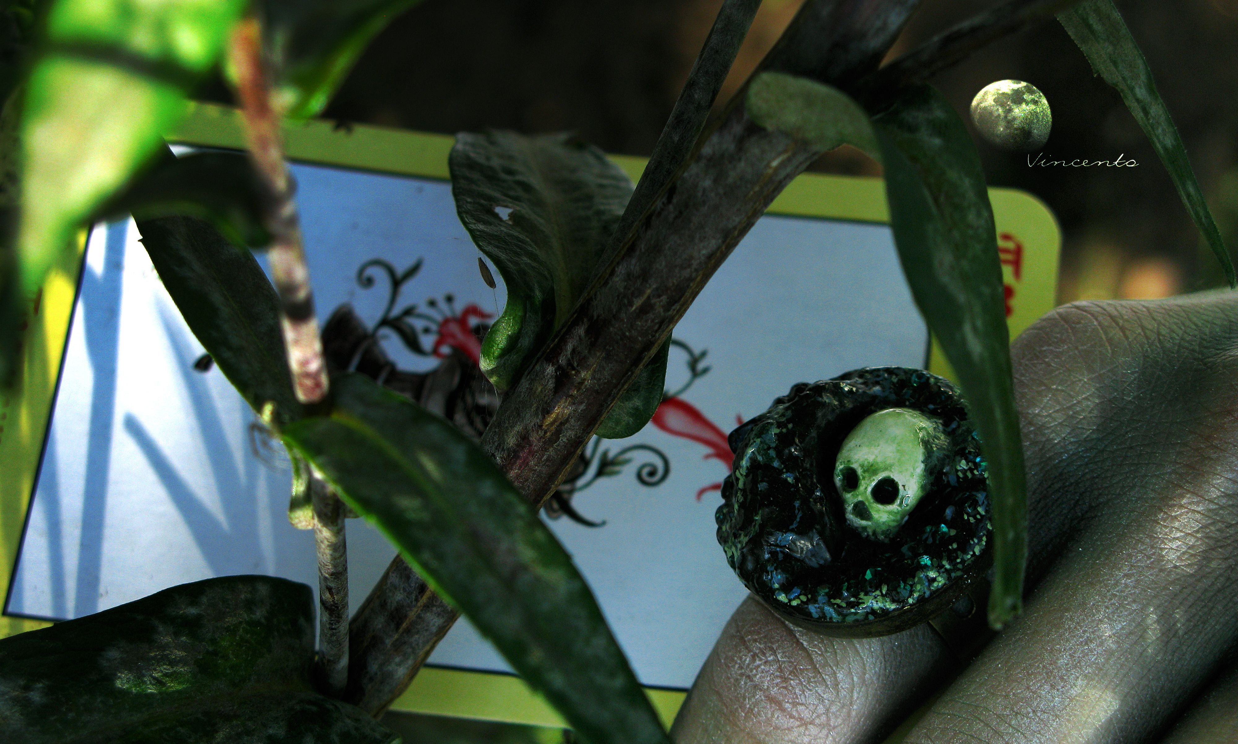 - Центральный элемент - миниатюрный череп (полностью ручная работа), усыпанный "сокровищами" - мерцающими стразами Сваровски.