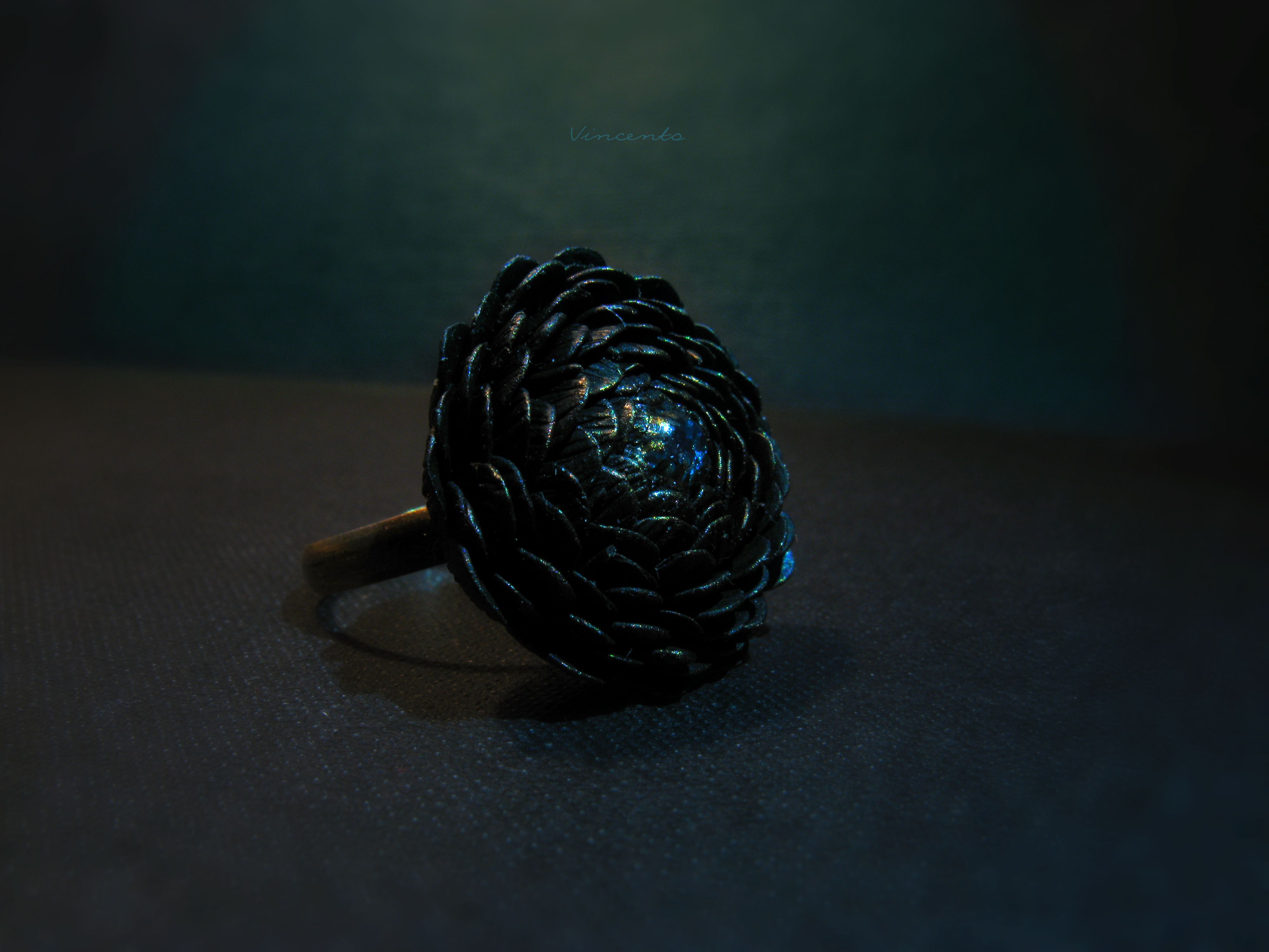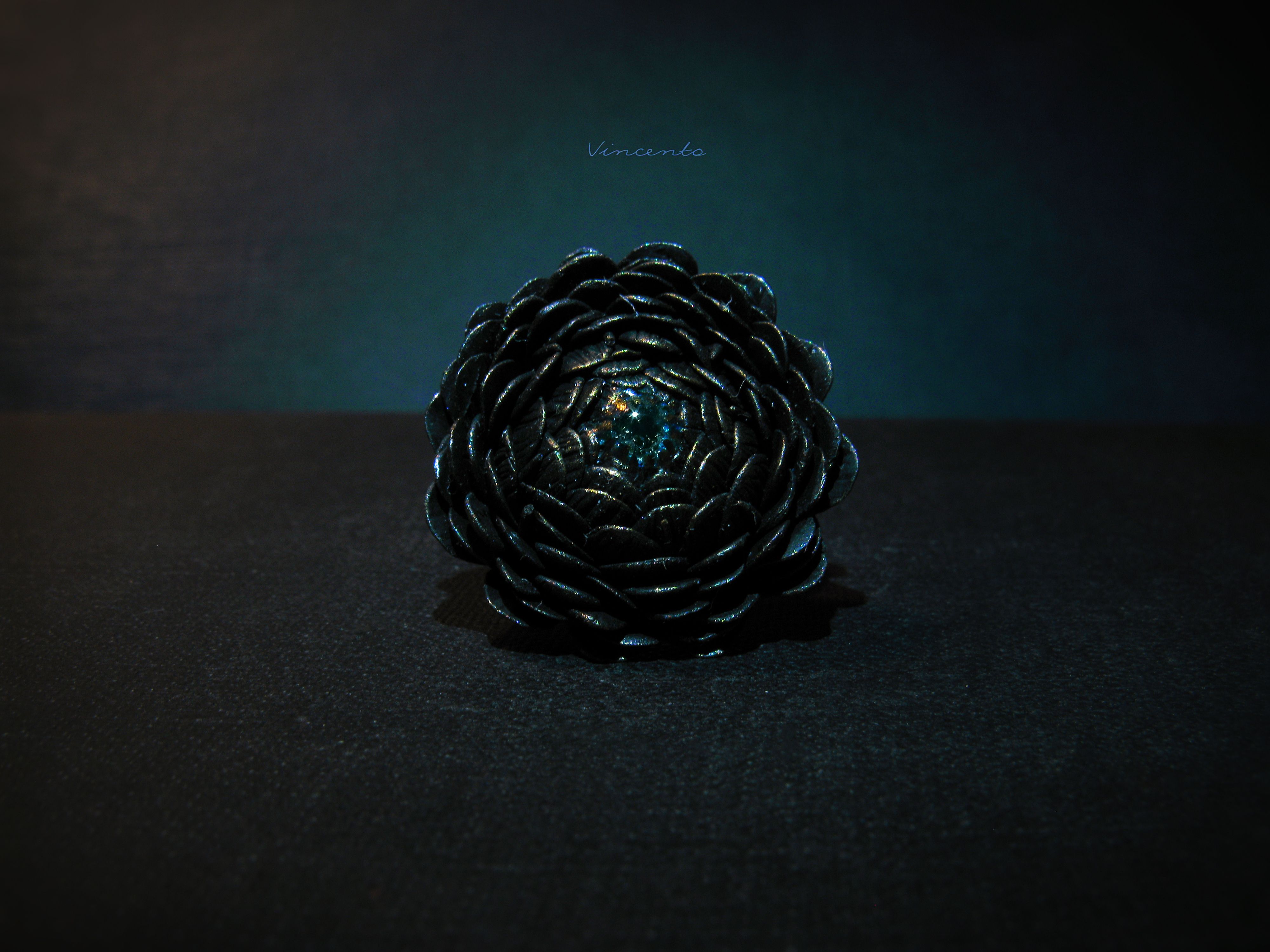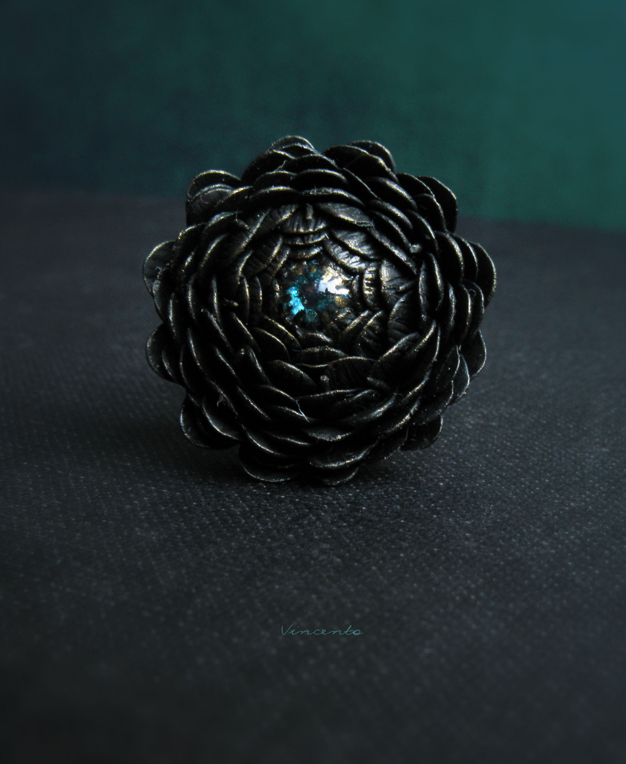 - "Око Ворона" - эффектное готическое кольцо в виде фэнтезийного цветка с тонкими чёрными лепестками и мистической сине-зелёной сердцевинкой.