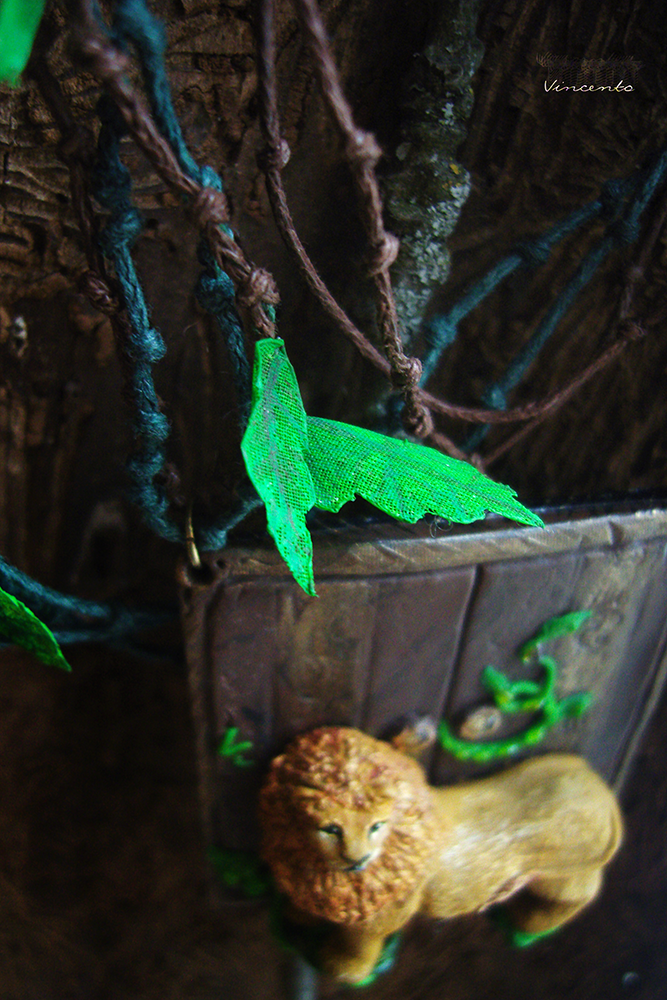 - В центре - подвеска в виде царственного льва Аслана. Позади него - старинный шкаф, дверцы которого поросли лесными травами с капельками прозрачной росы...