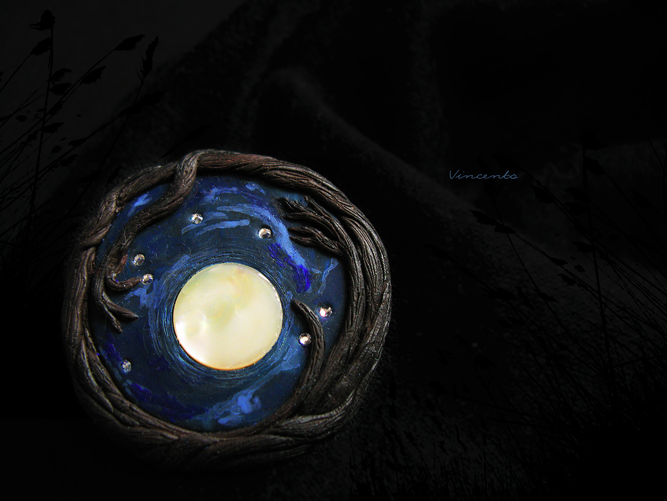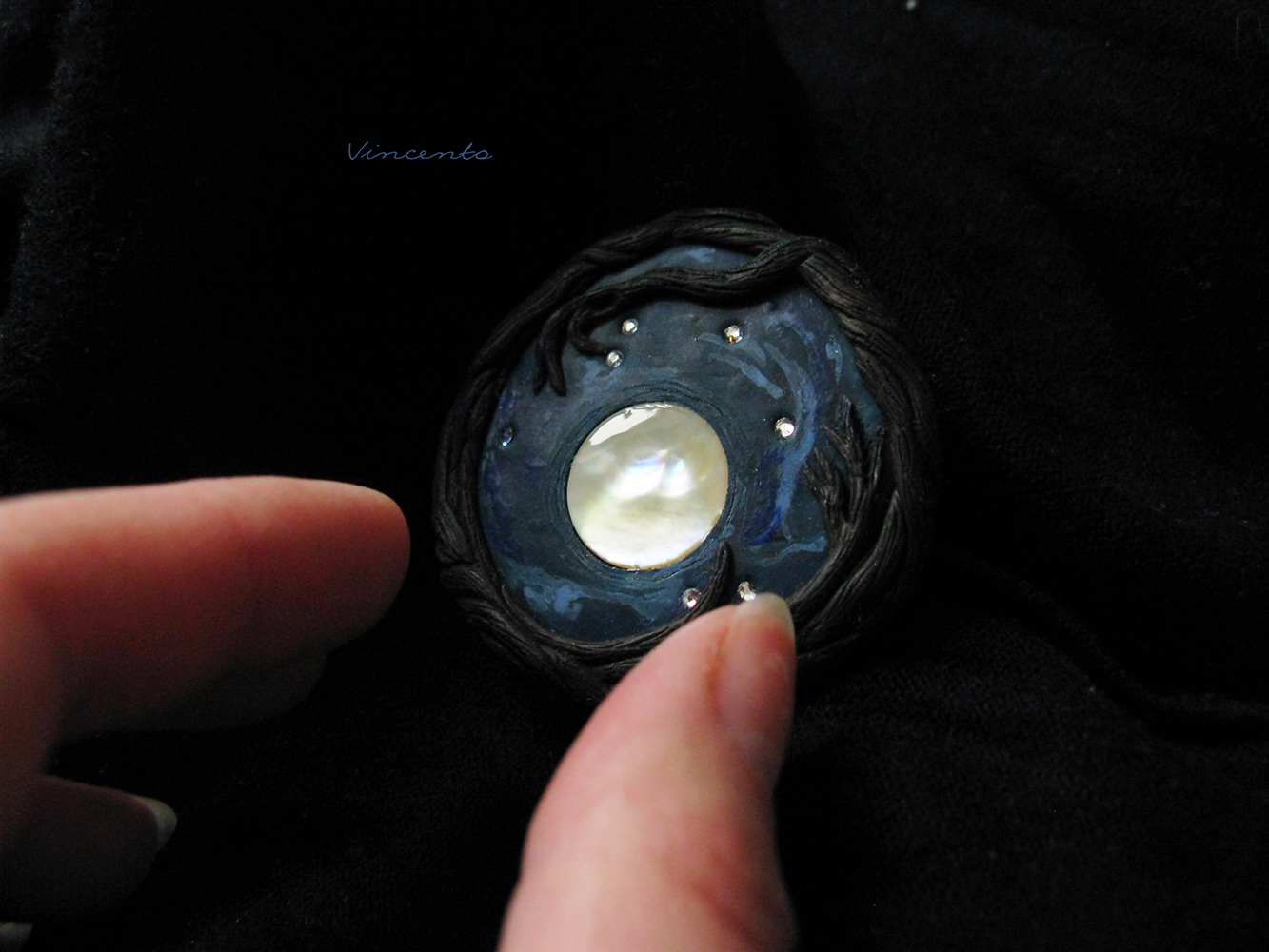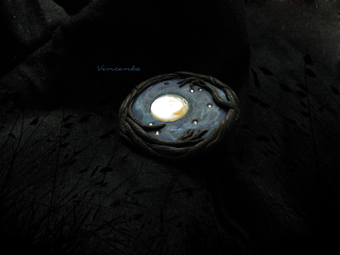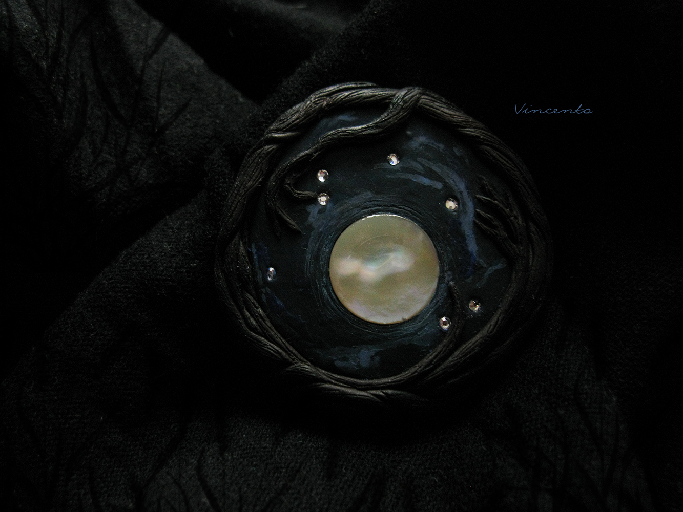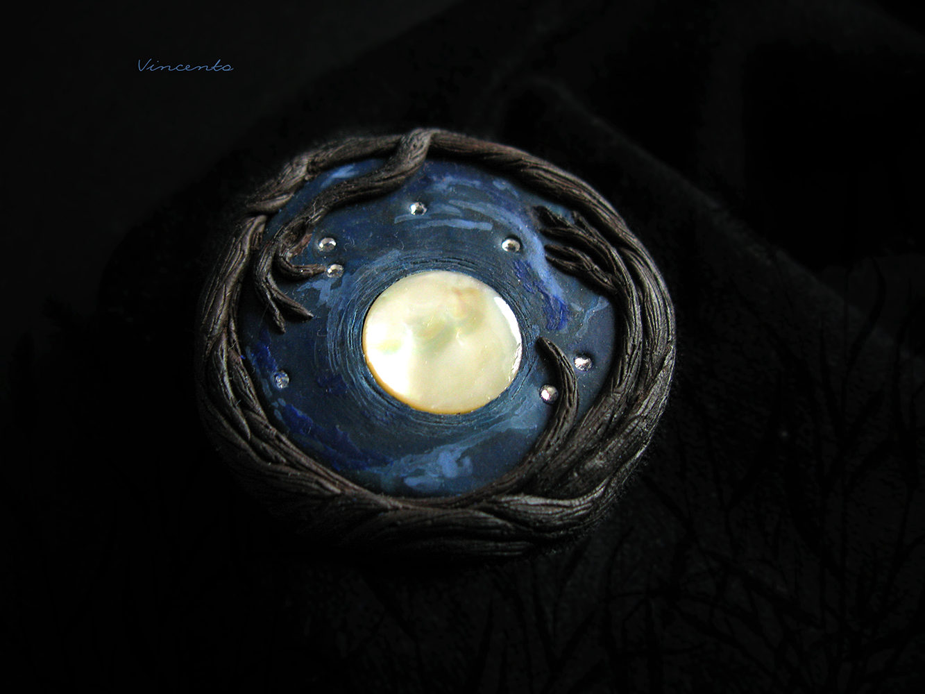 Однажды в полнолуние... Авторская брошь из полимерной глины с винтажным перламутром и стразами Swarovski