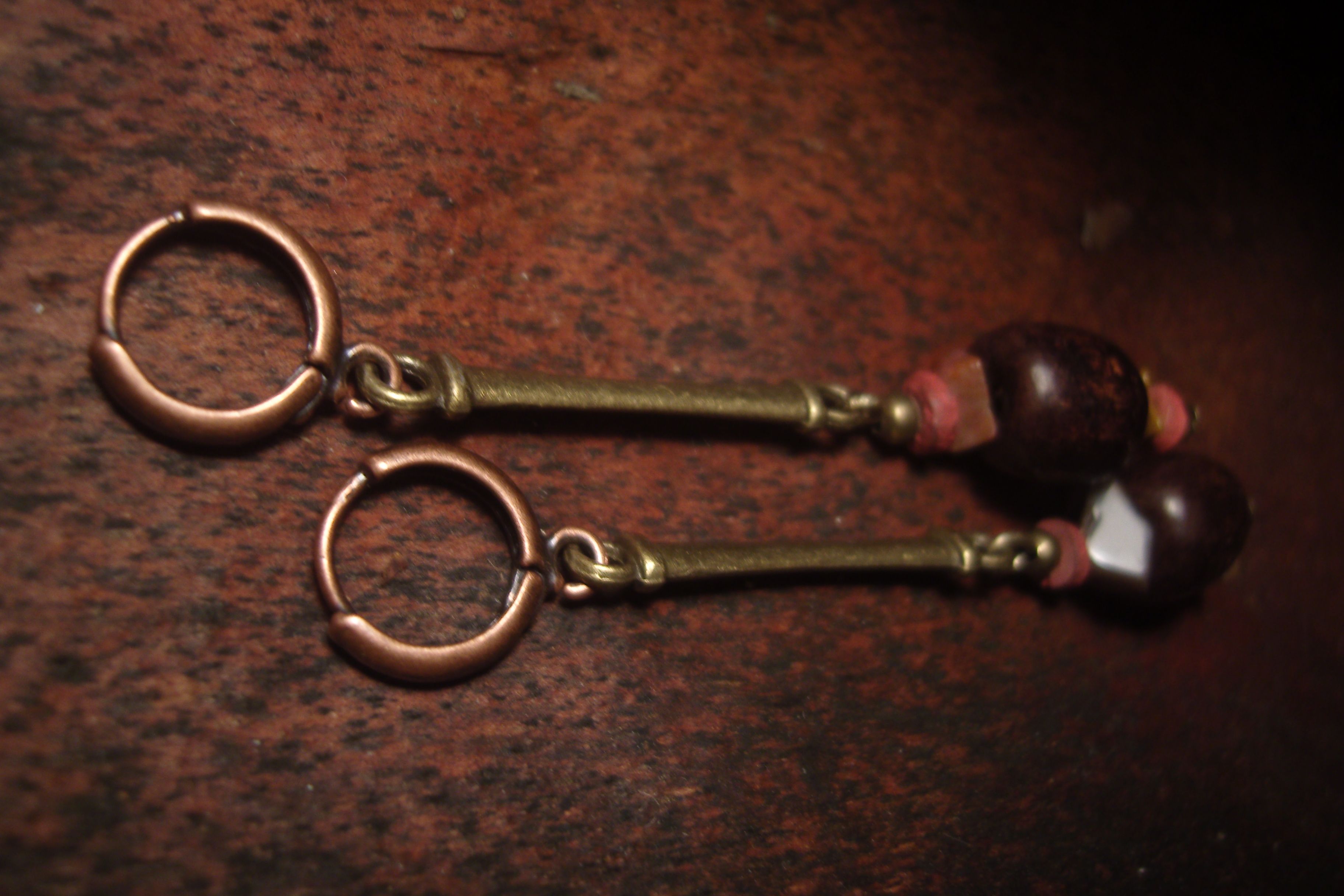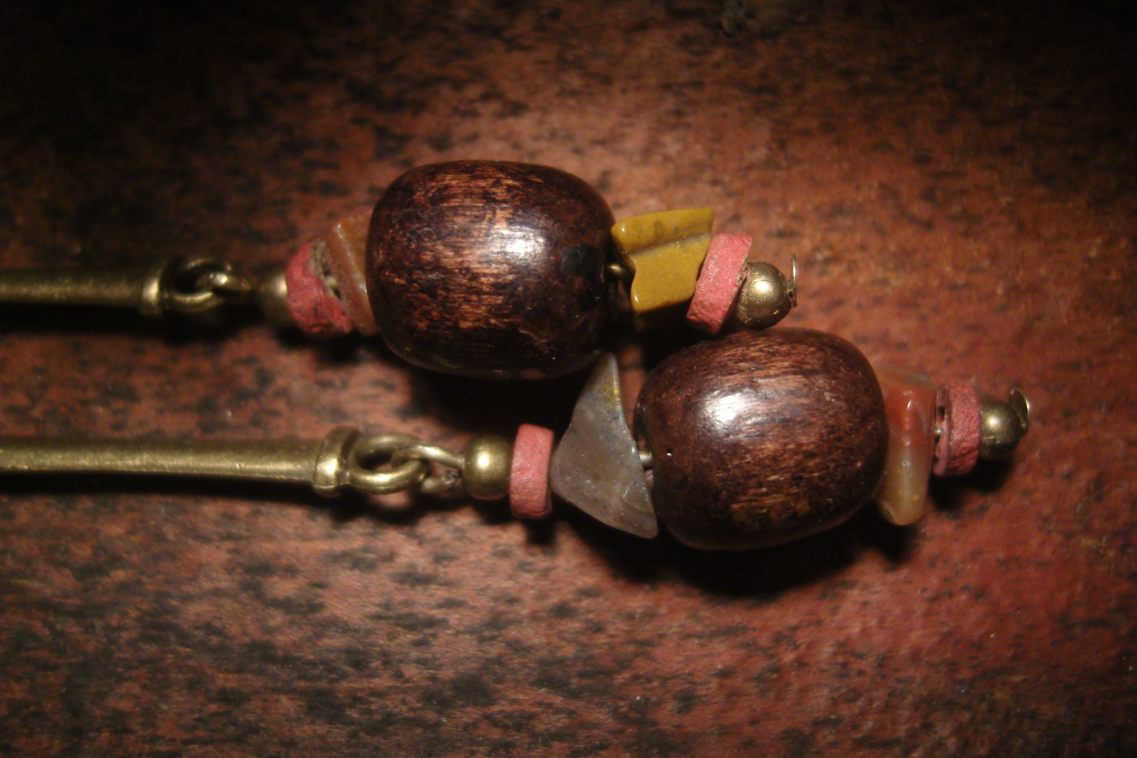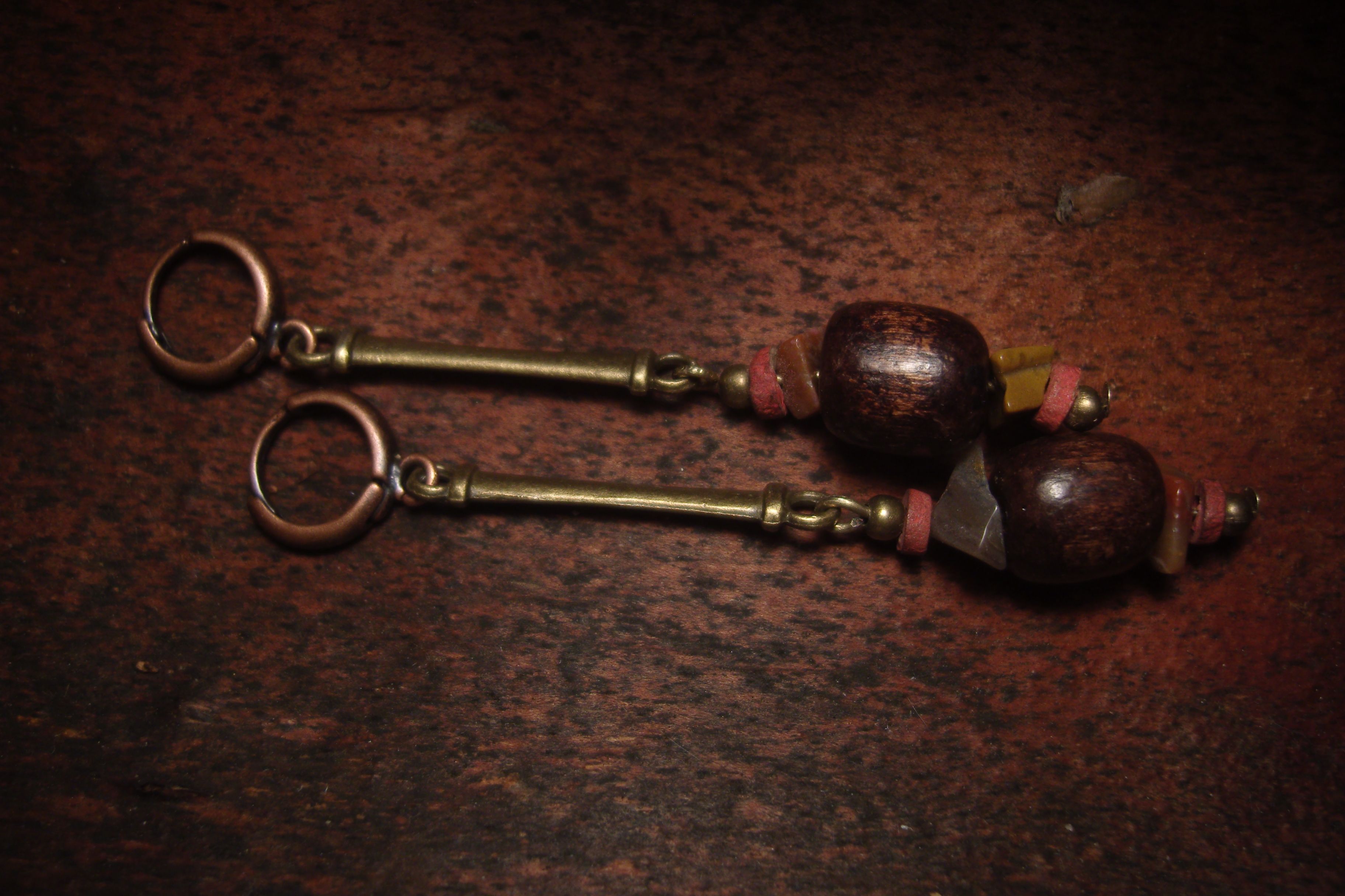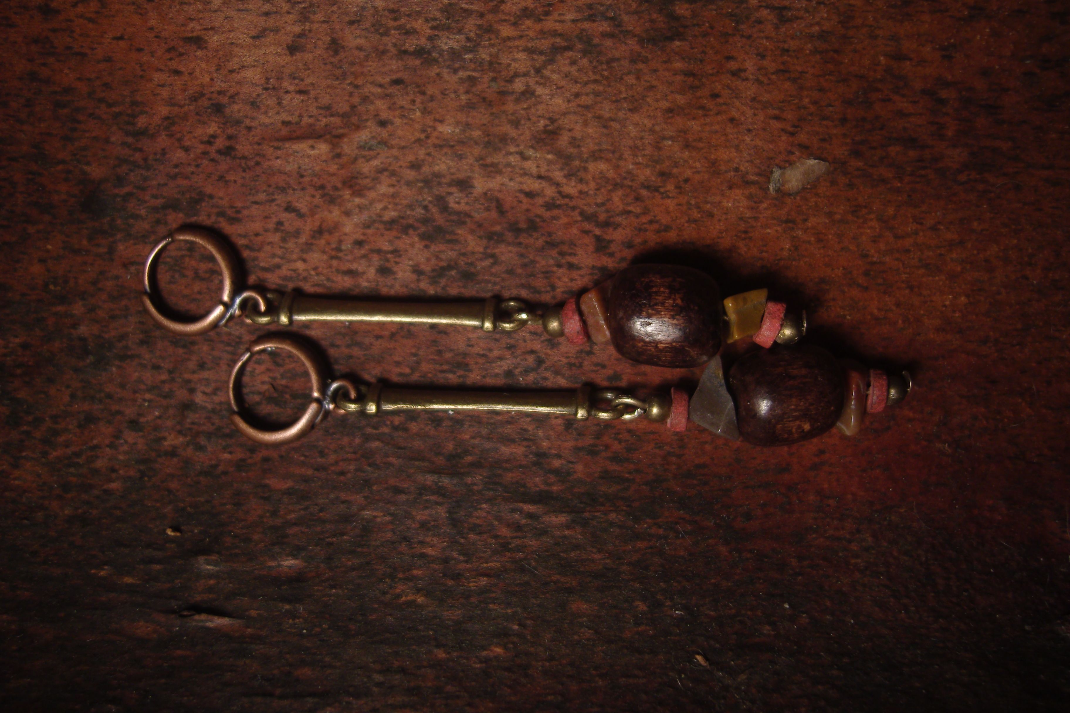 - Необычные бохо-серьги на лесную тематику из цветных металлов (бронзовое и медное покрытие) с красивыми деревянными бусинами и натуральным кварцем.