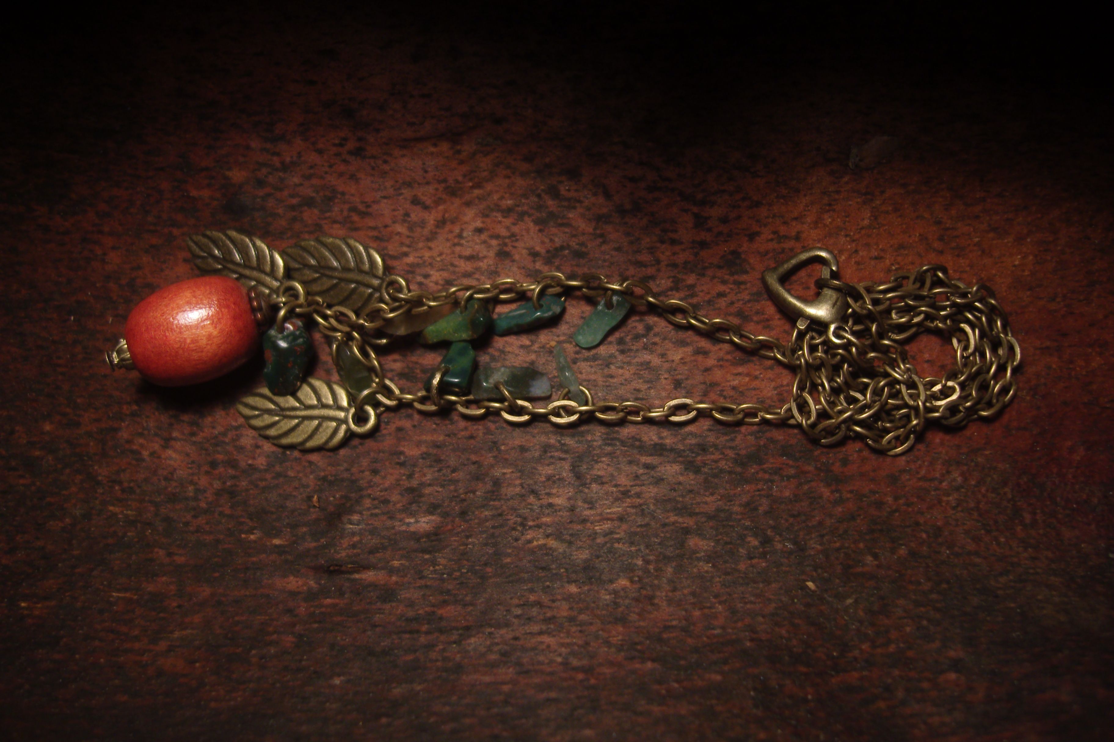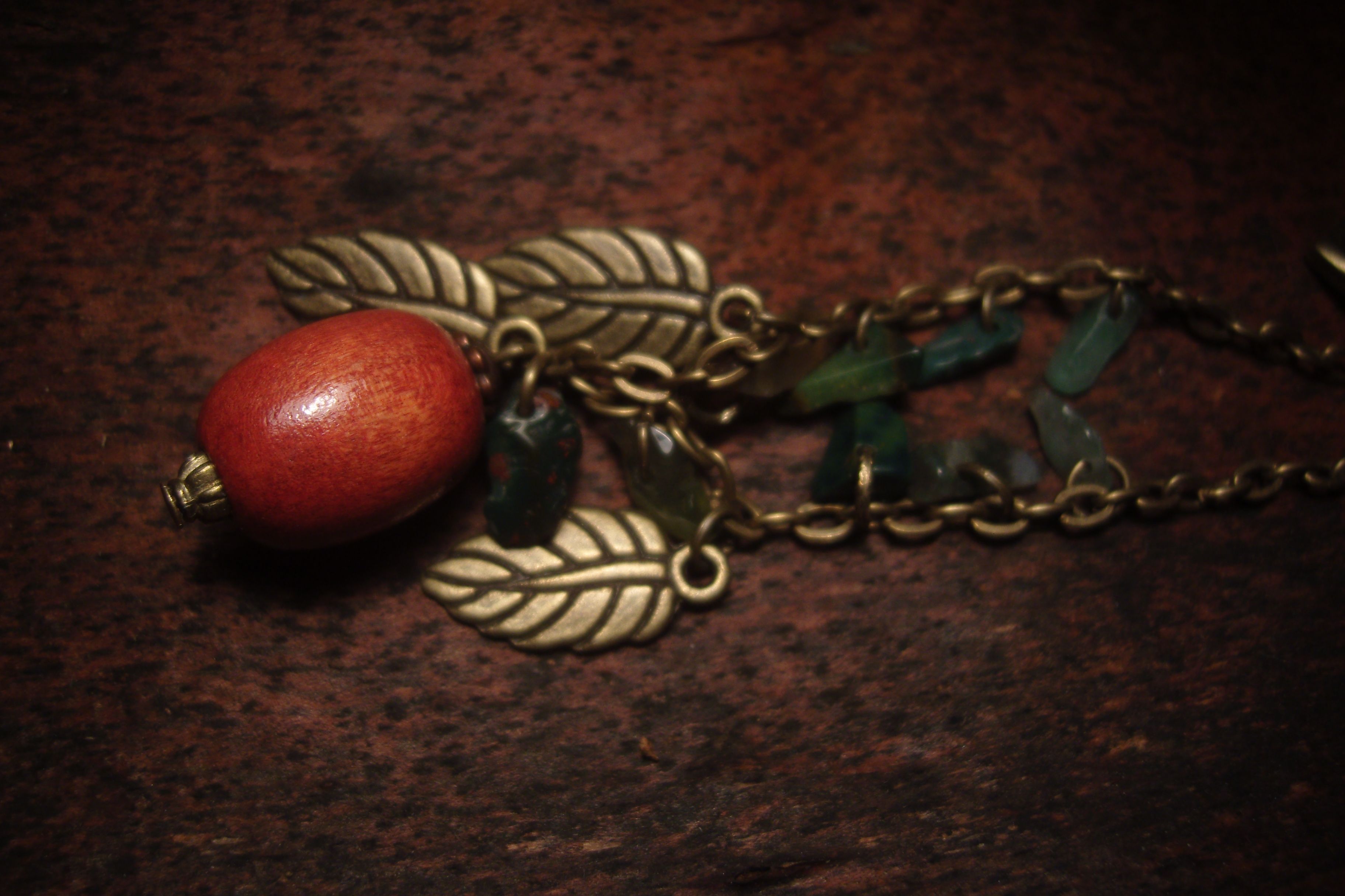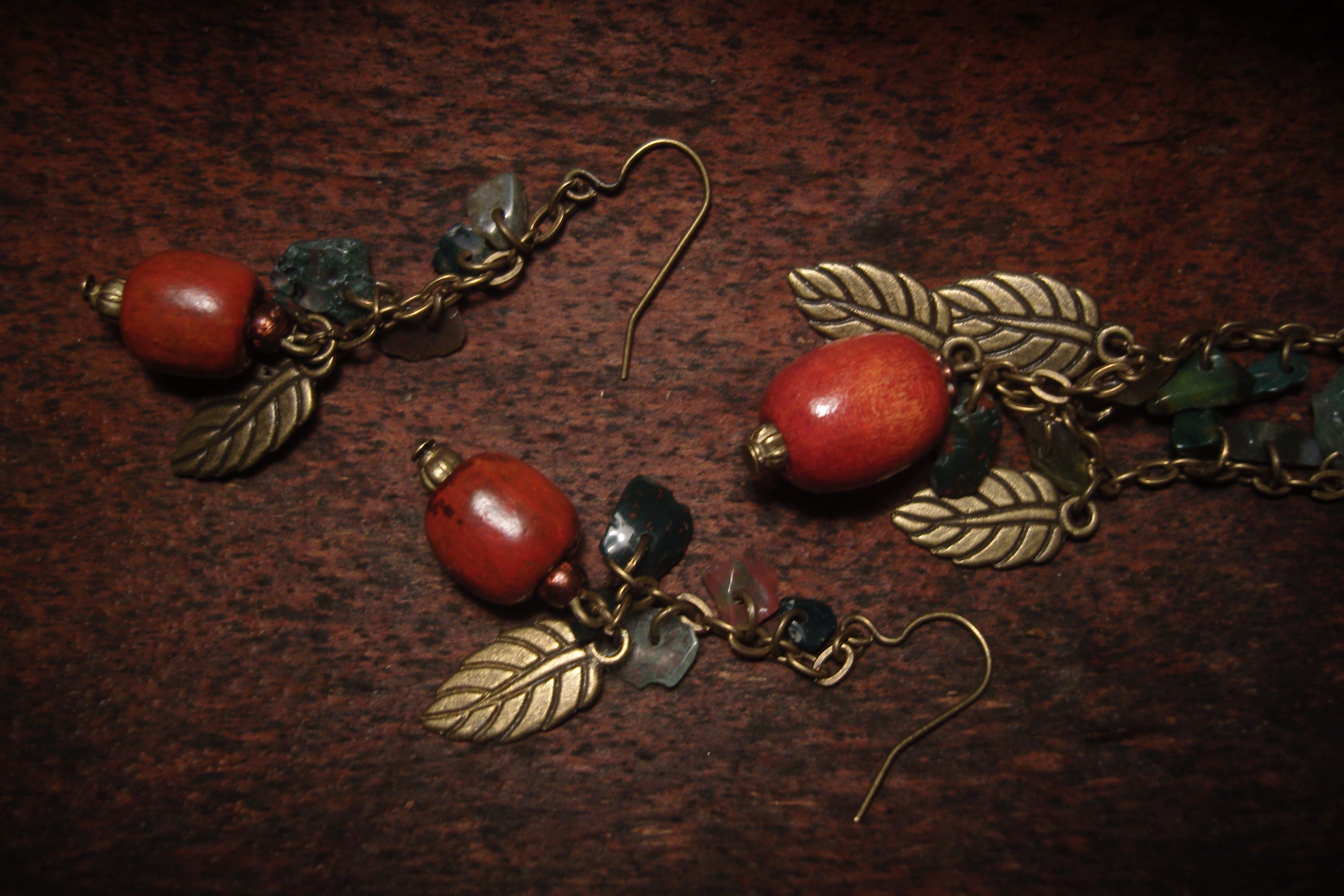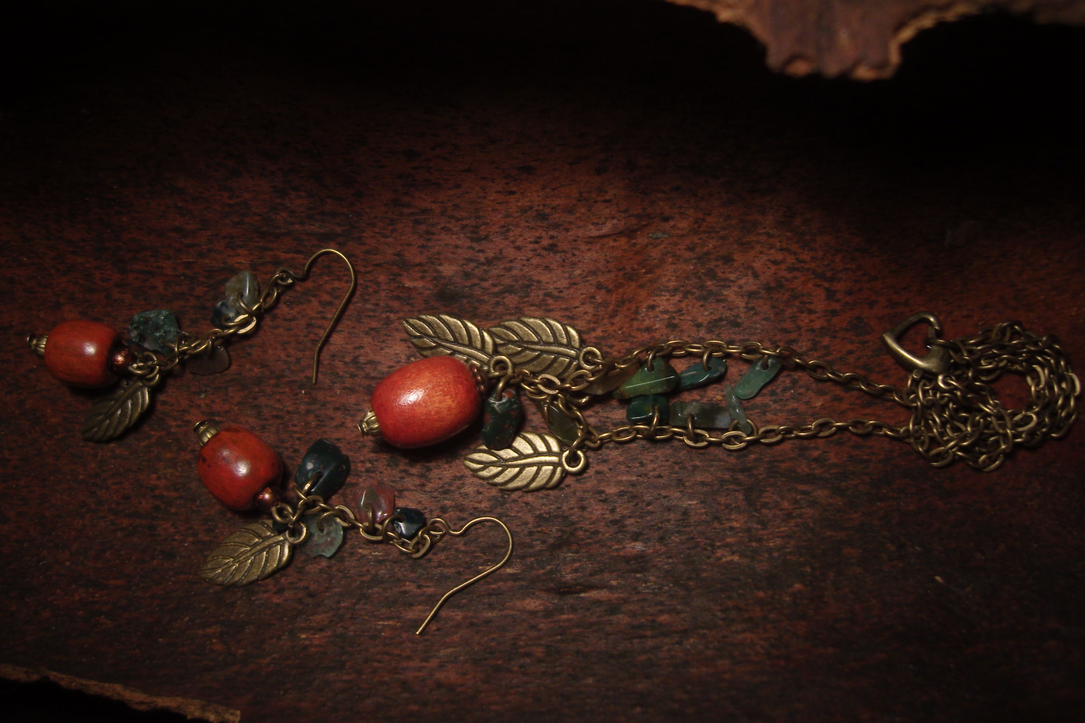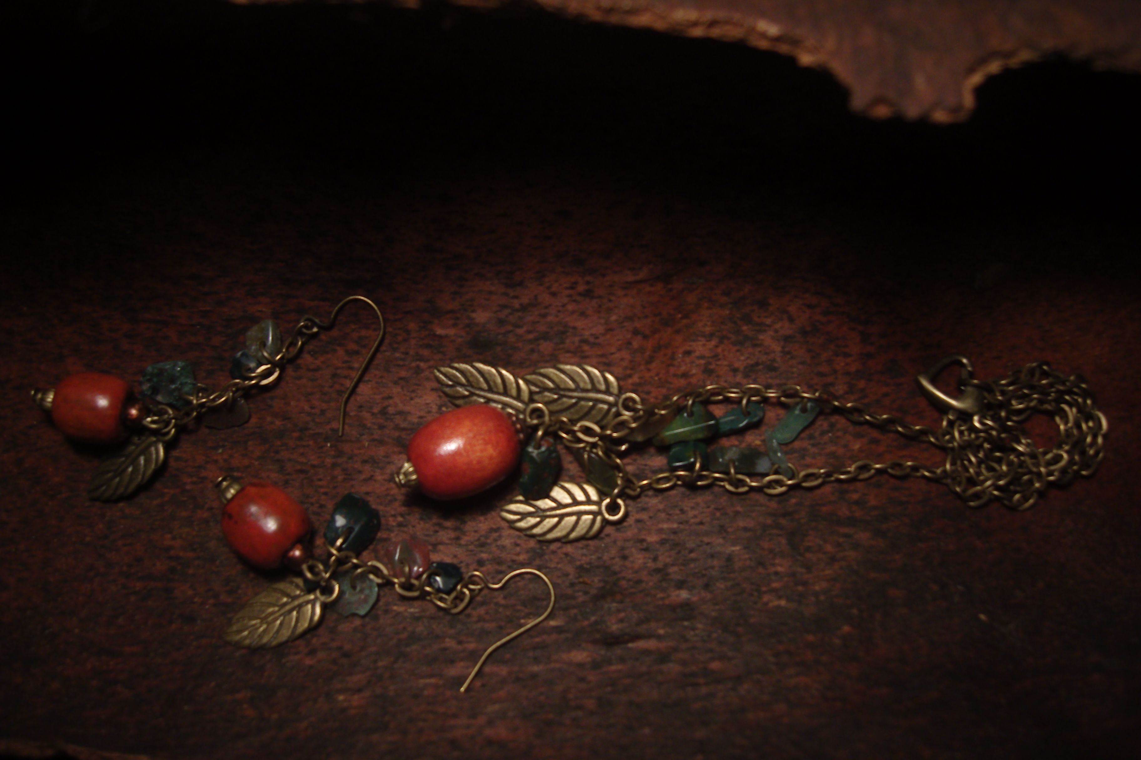 - Красивый комплект украшений на осенне-лесную тематику: здесь и плоды шиповника, и бронзовые листья, и цветные кусочки натурального кварца. Серьги и подвеска.