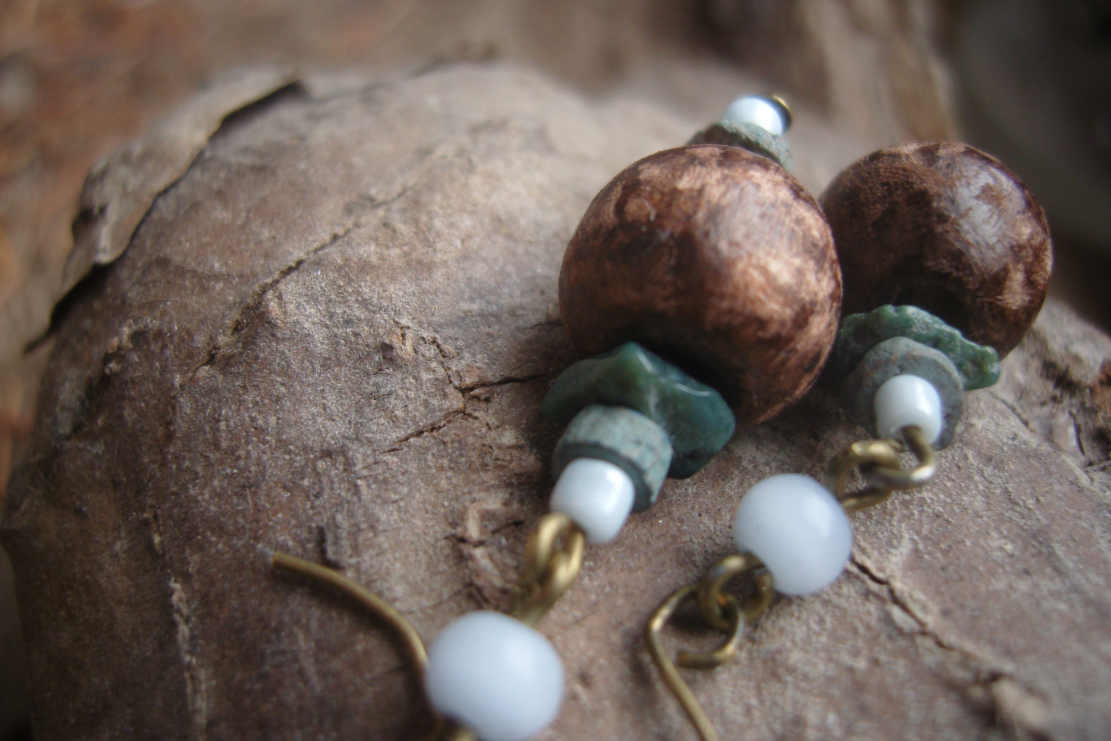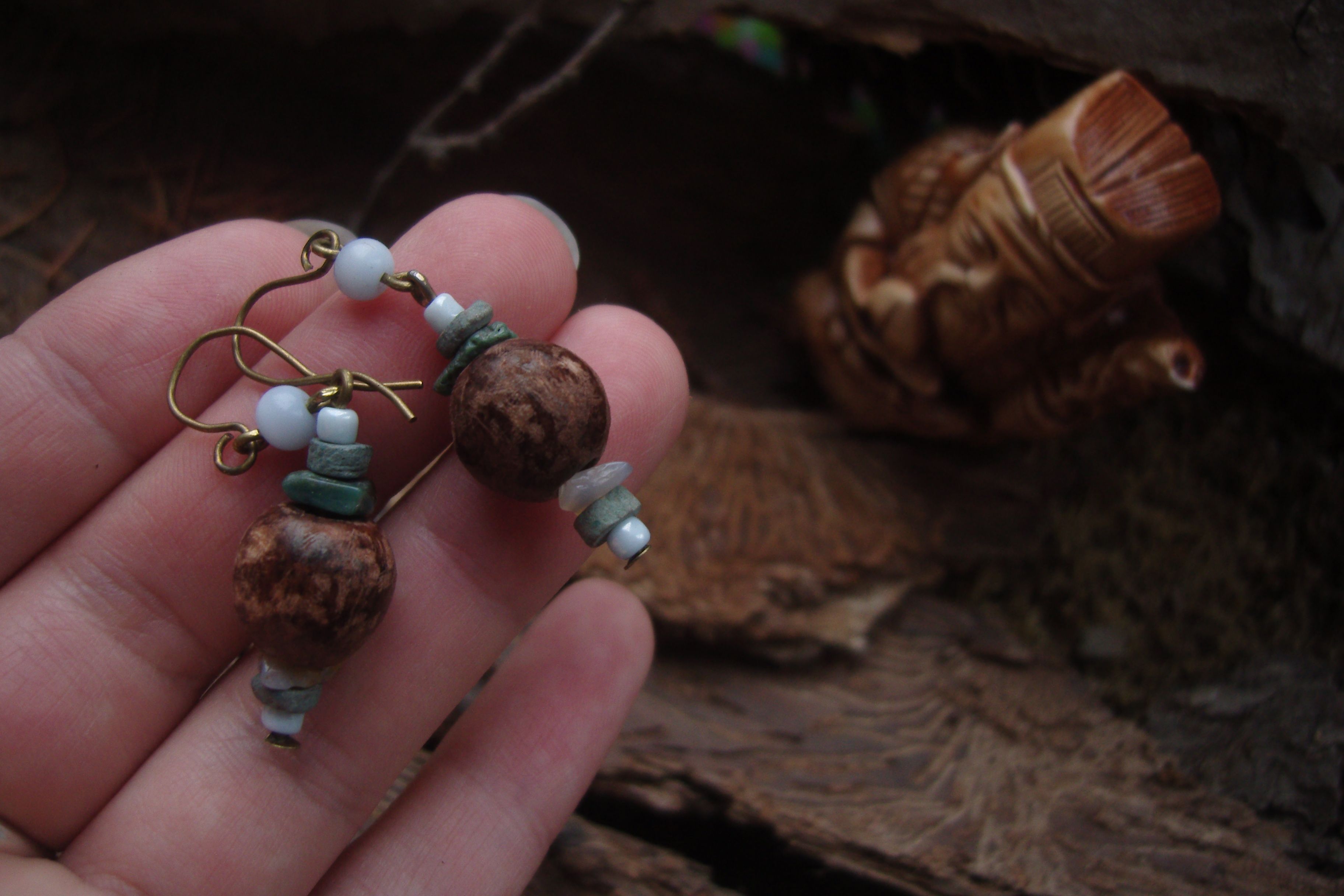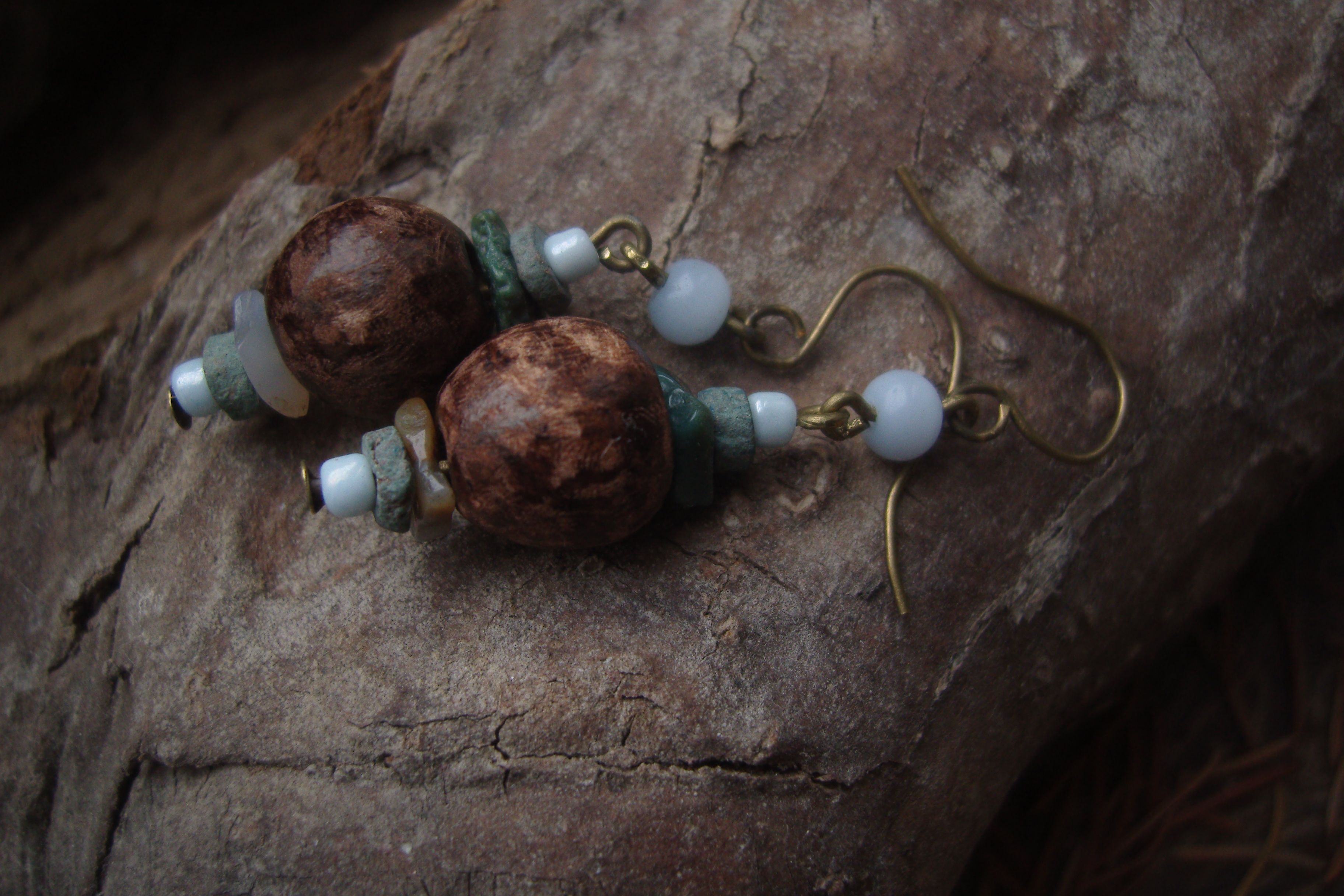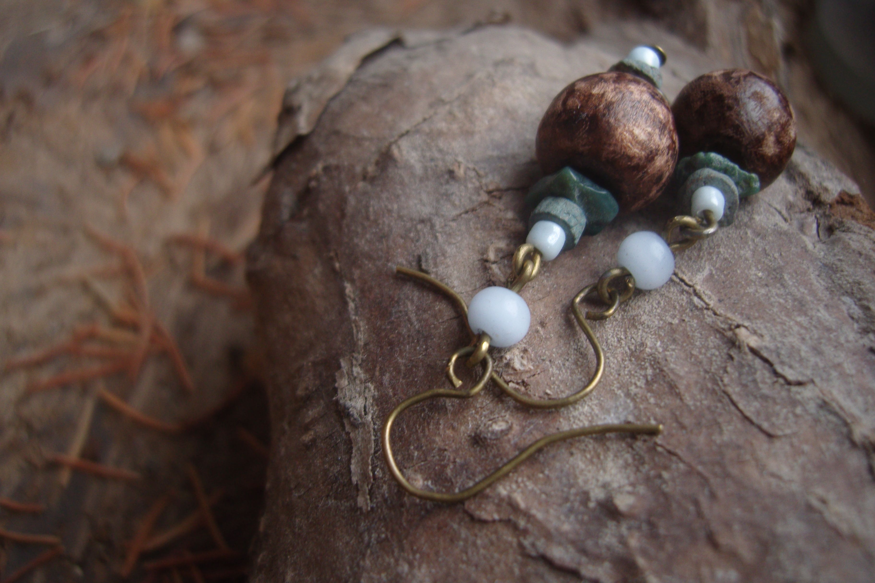 - Колоритные этно-серёжки (которые, впрочем, можно отнести и к популярному ныне стилю бохо) на лесную тематику с деревянными бусинами и натуральными камнями.