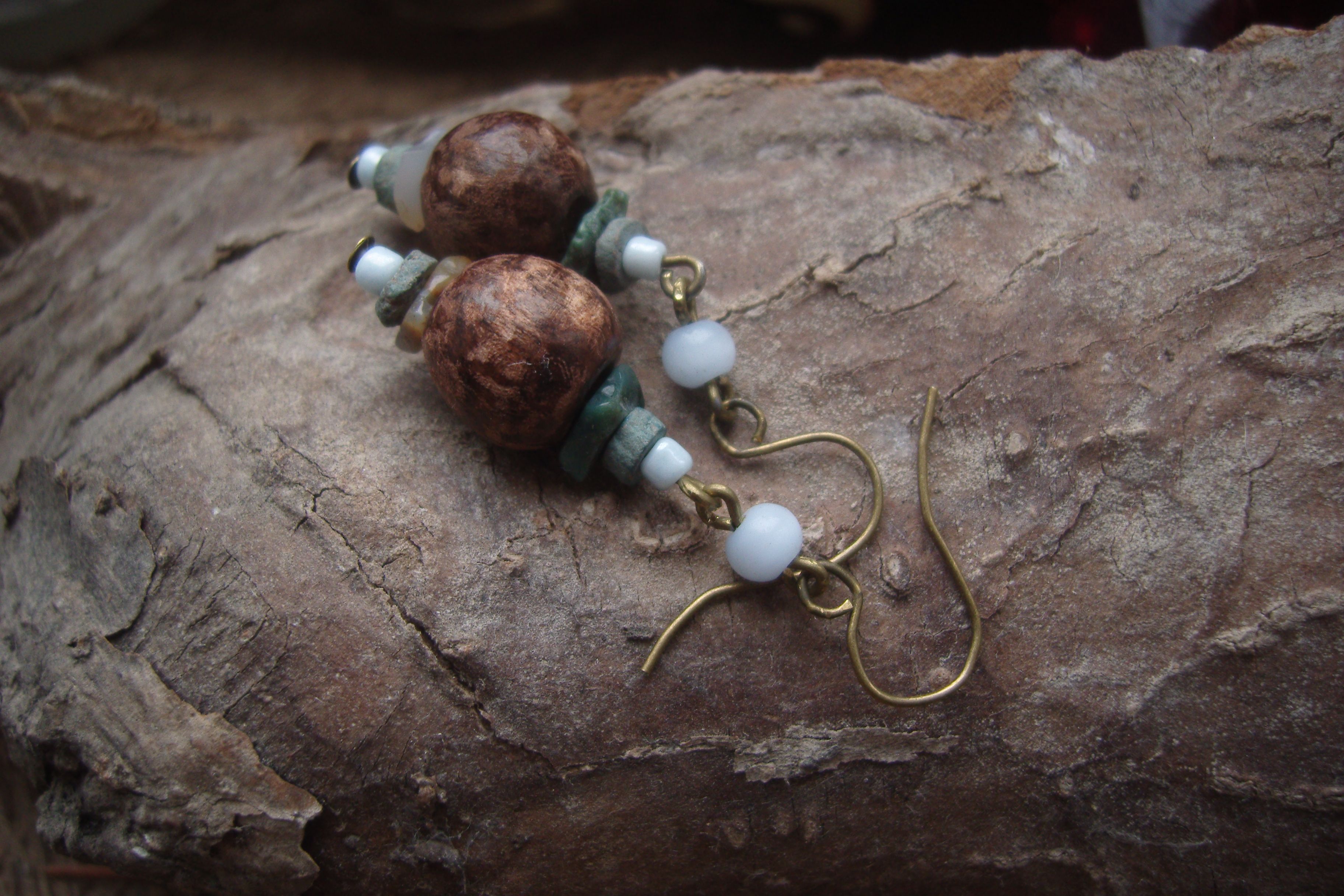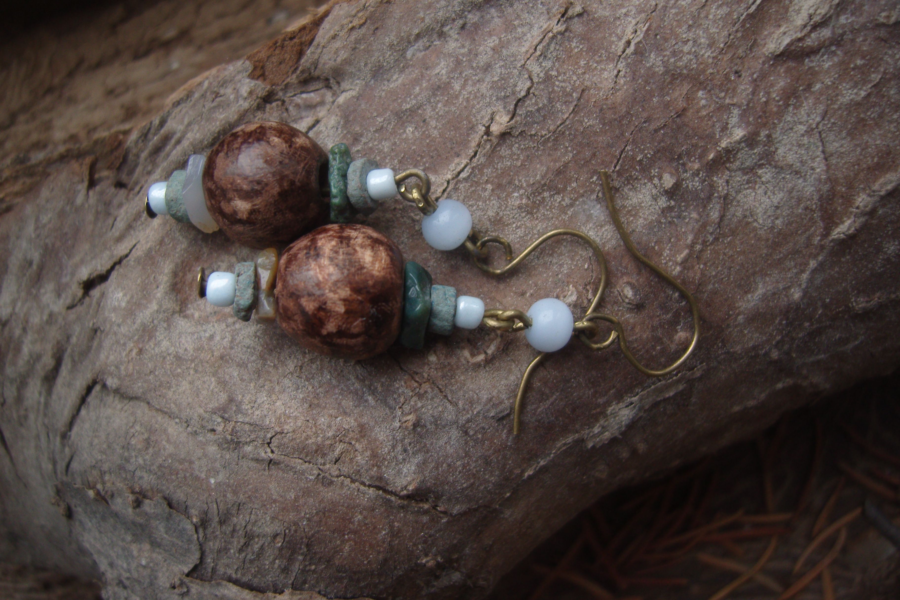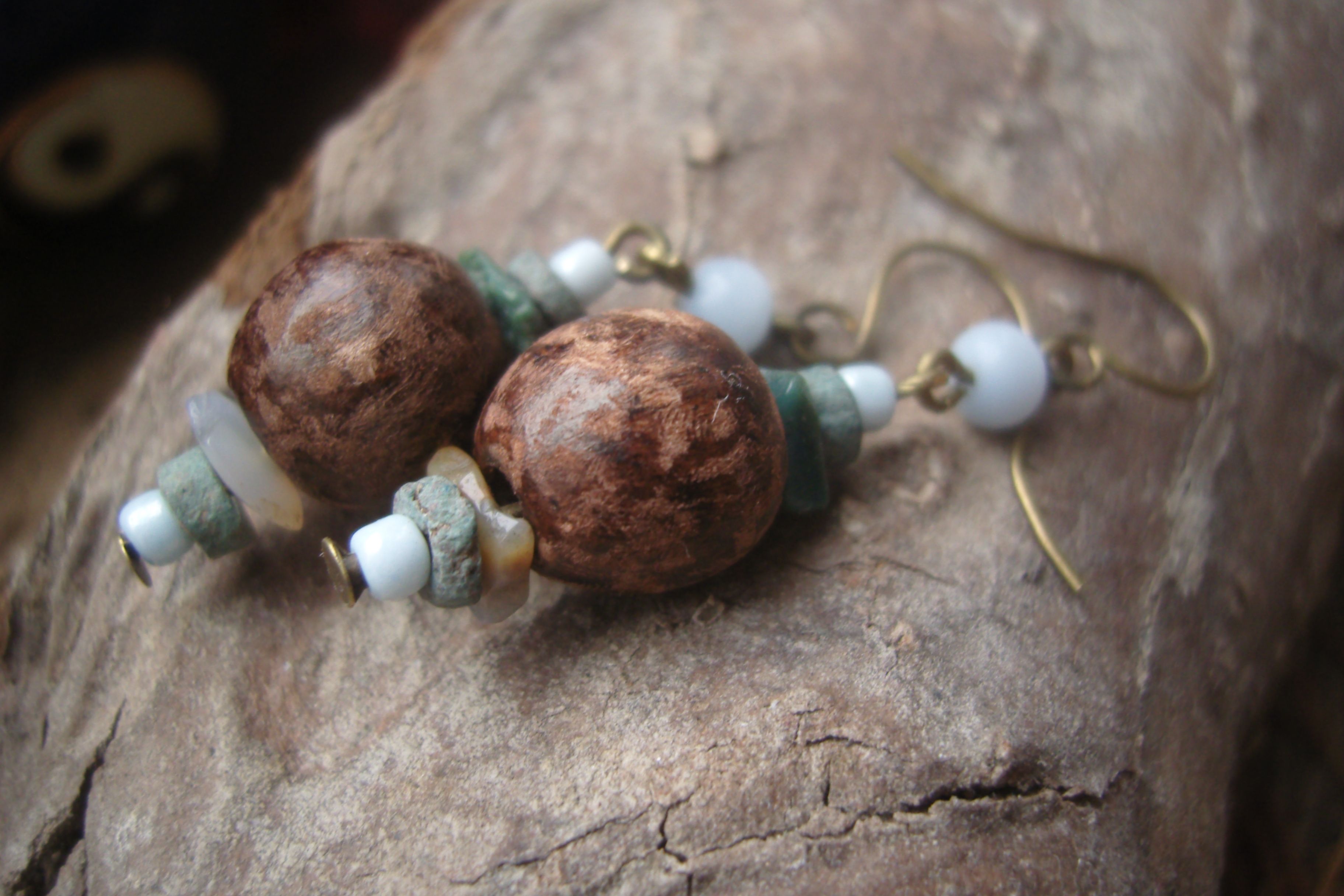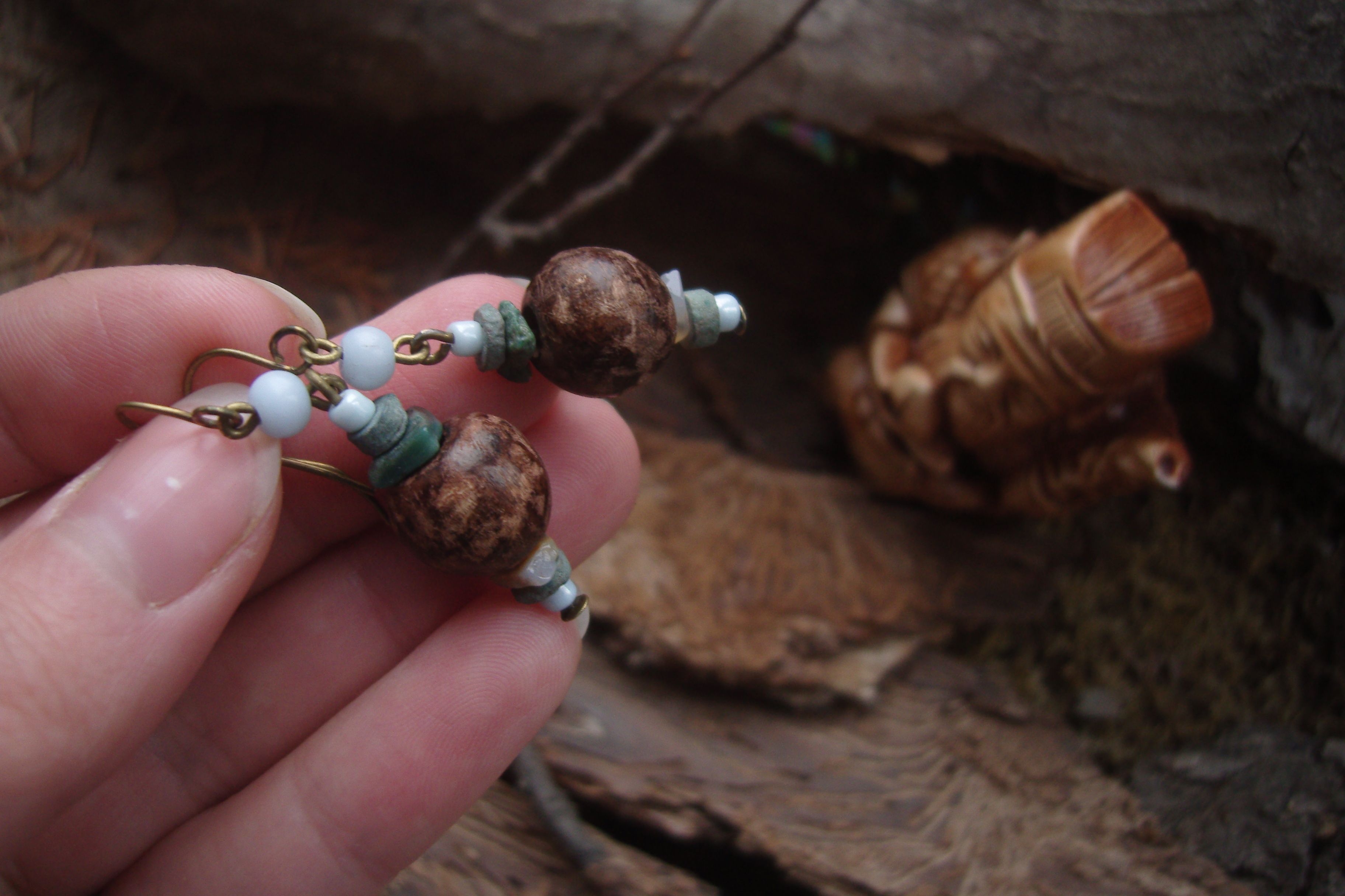 - Колоритные этно-серёжки (которые, впрочем, можно отнести и к популярному ныне стилю бохо) на лесную тематику с деревянными бусинами и натуральными камнями.