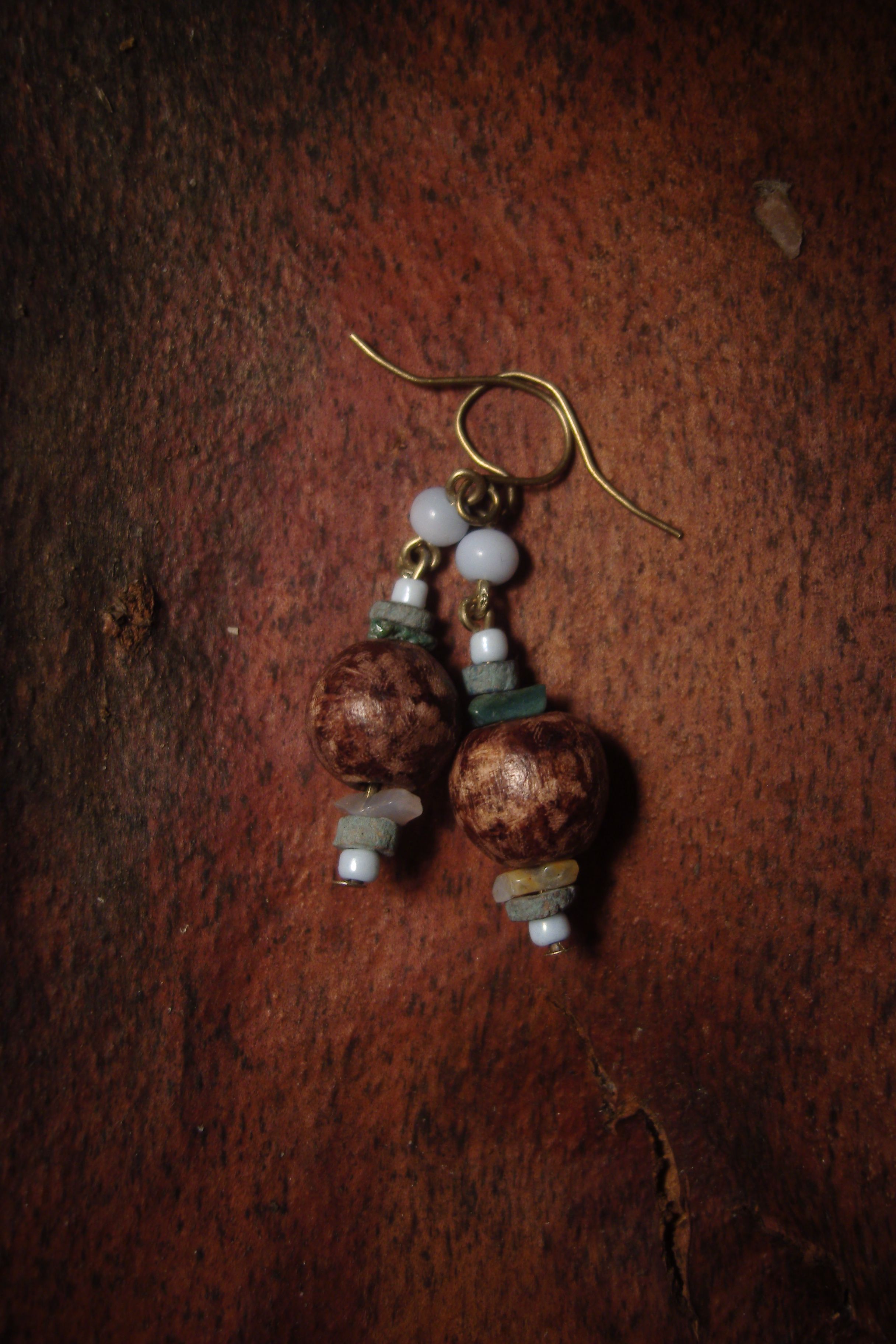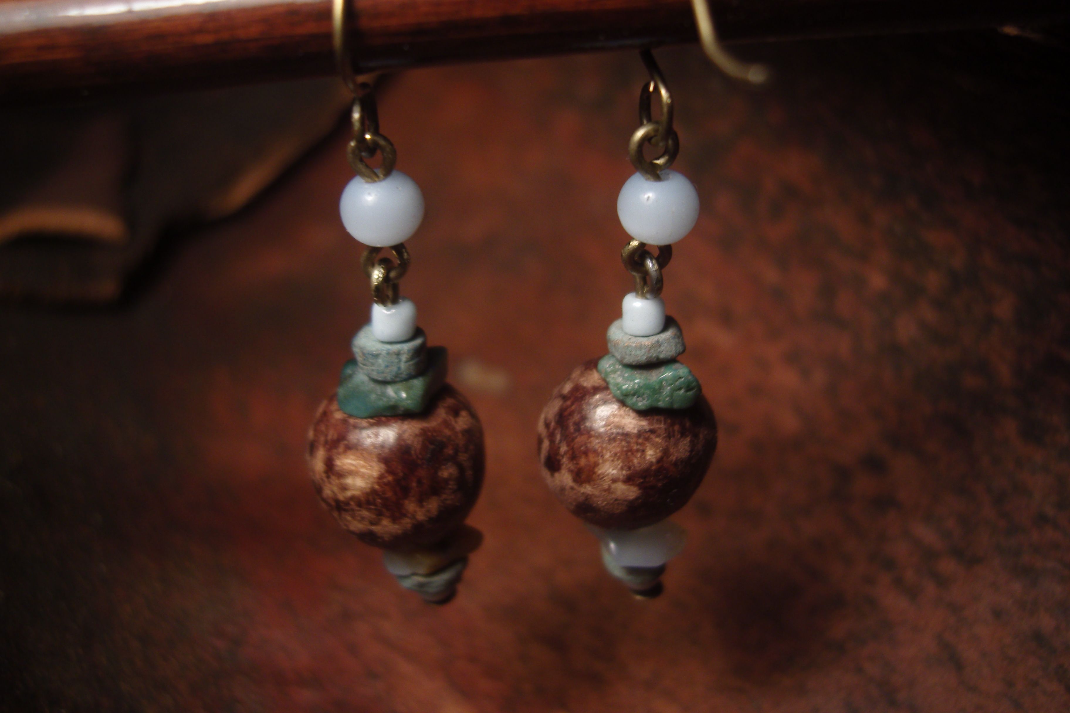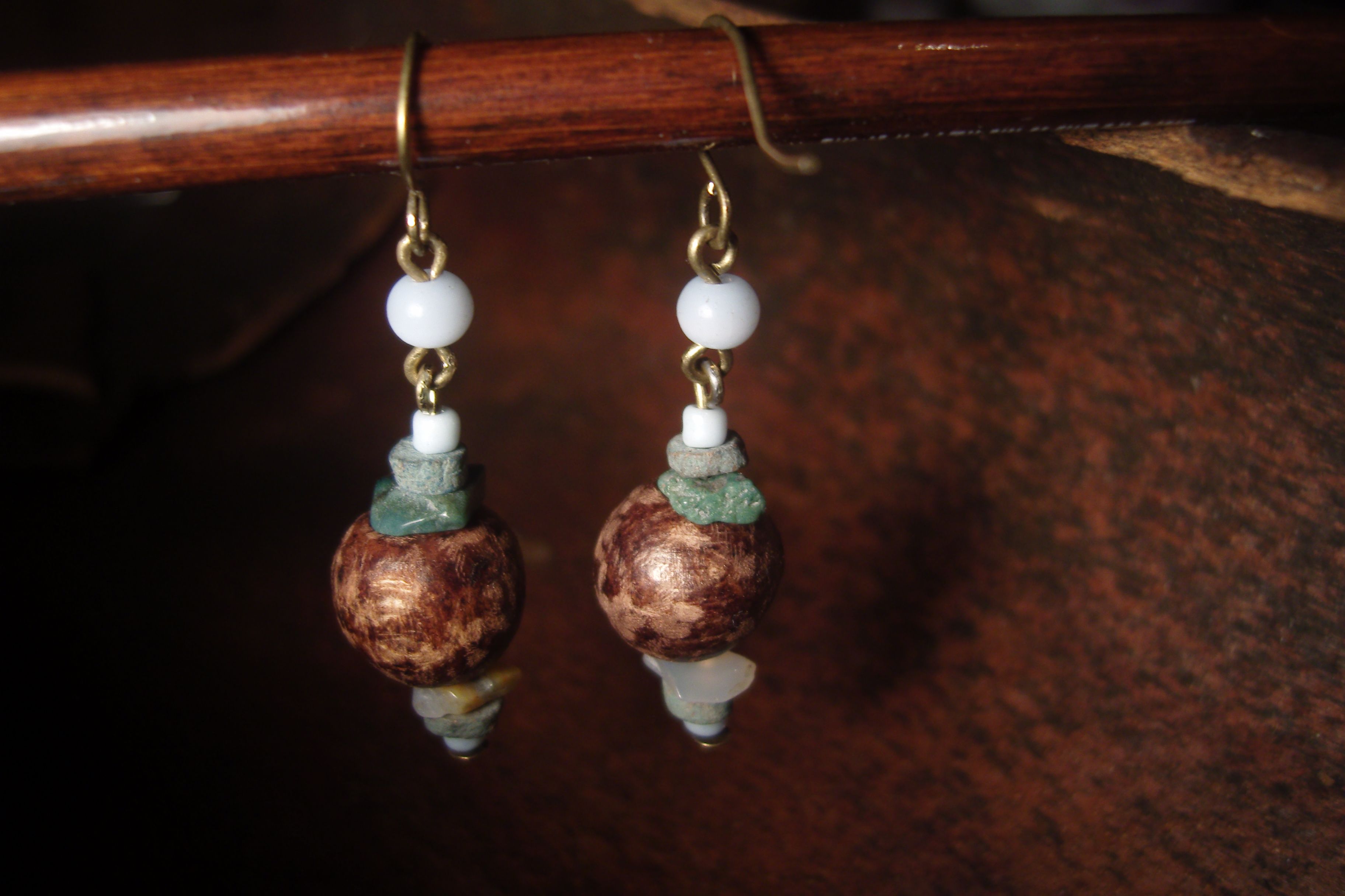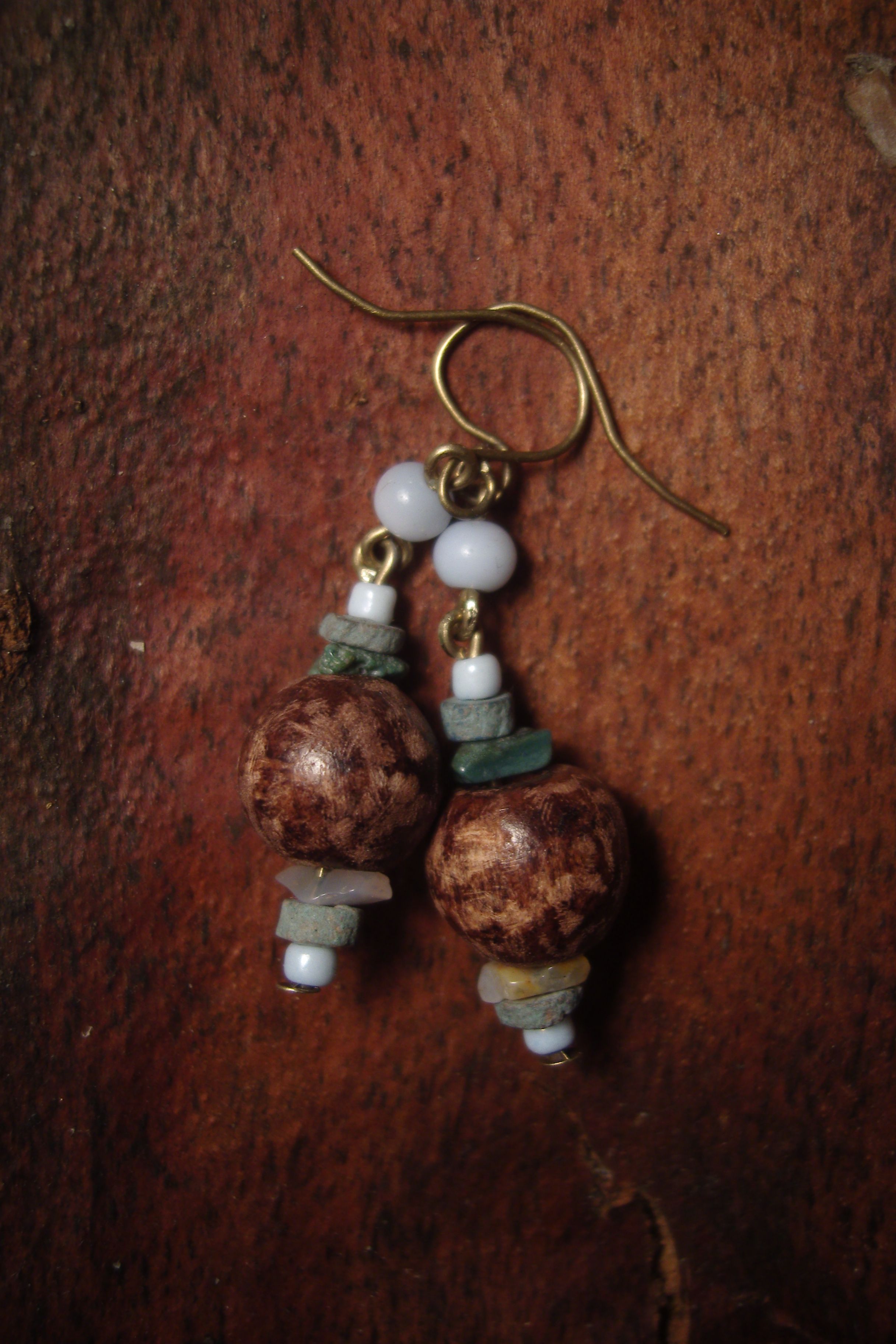 - Колоритные этно-серёжки (которые, впрочем, можно отнести и к популярному ныне стилю бохо) на лесную тематику с деревянными бусинами и натуральными камнями.