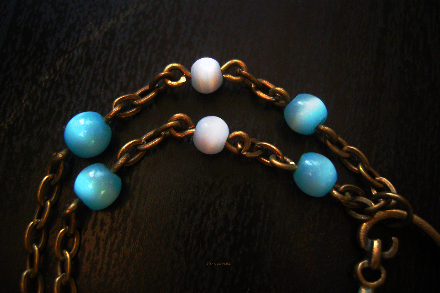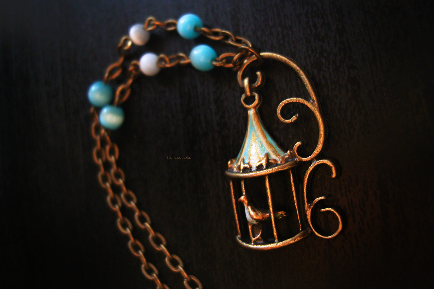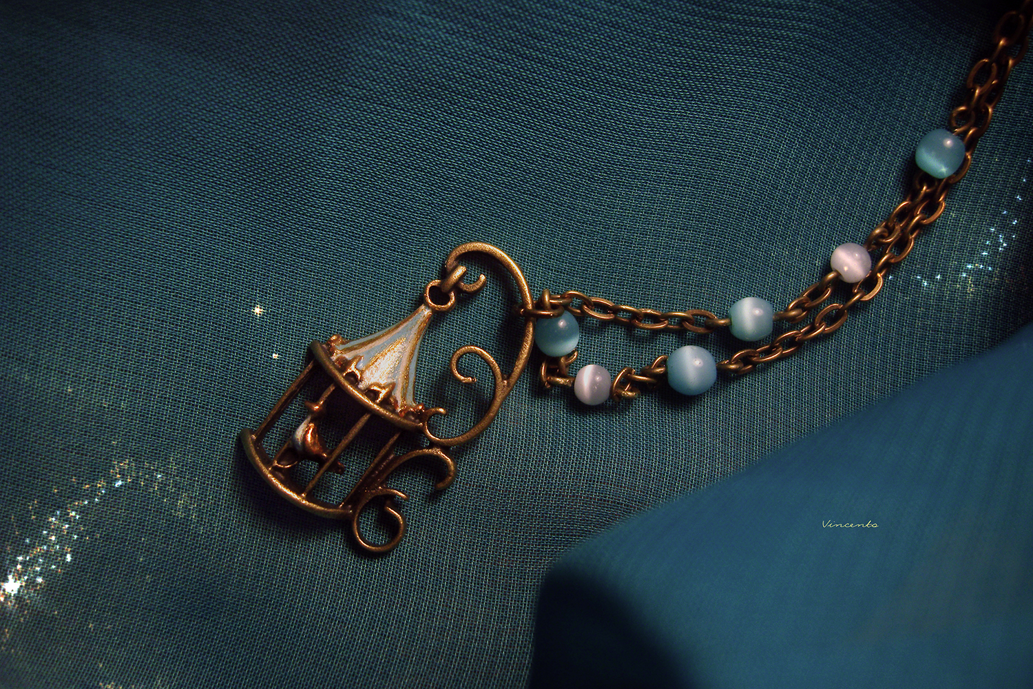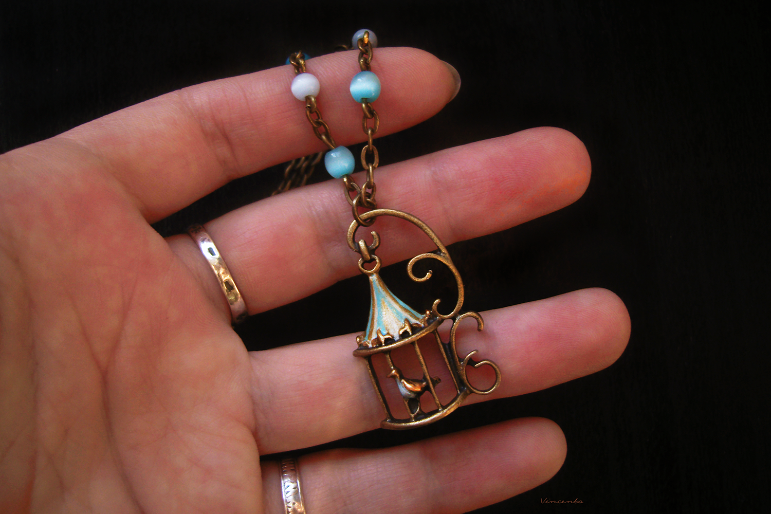- Основной цвет — бронза, камешки кошачьего глаза (молочно-серые с едва различимым синеватым отливом и ярко-голубые, ближе к тону морской волны) перекликаются с цветной росписью купола клетки и грудки нашей волшебной птички.
