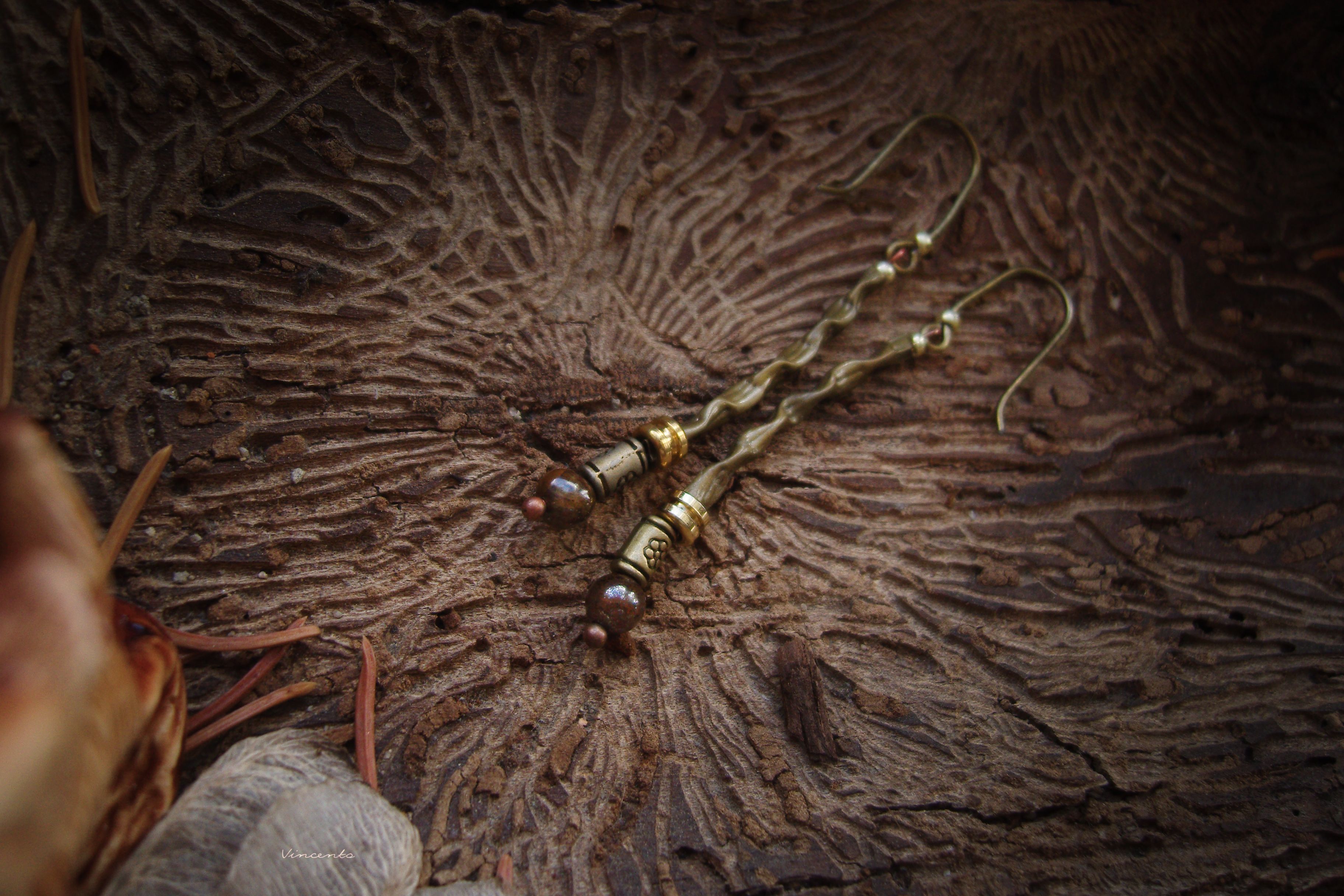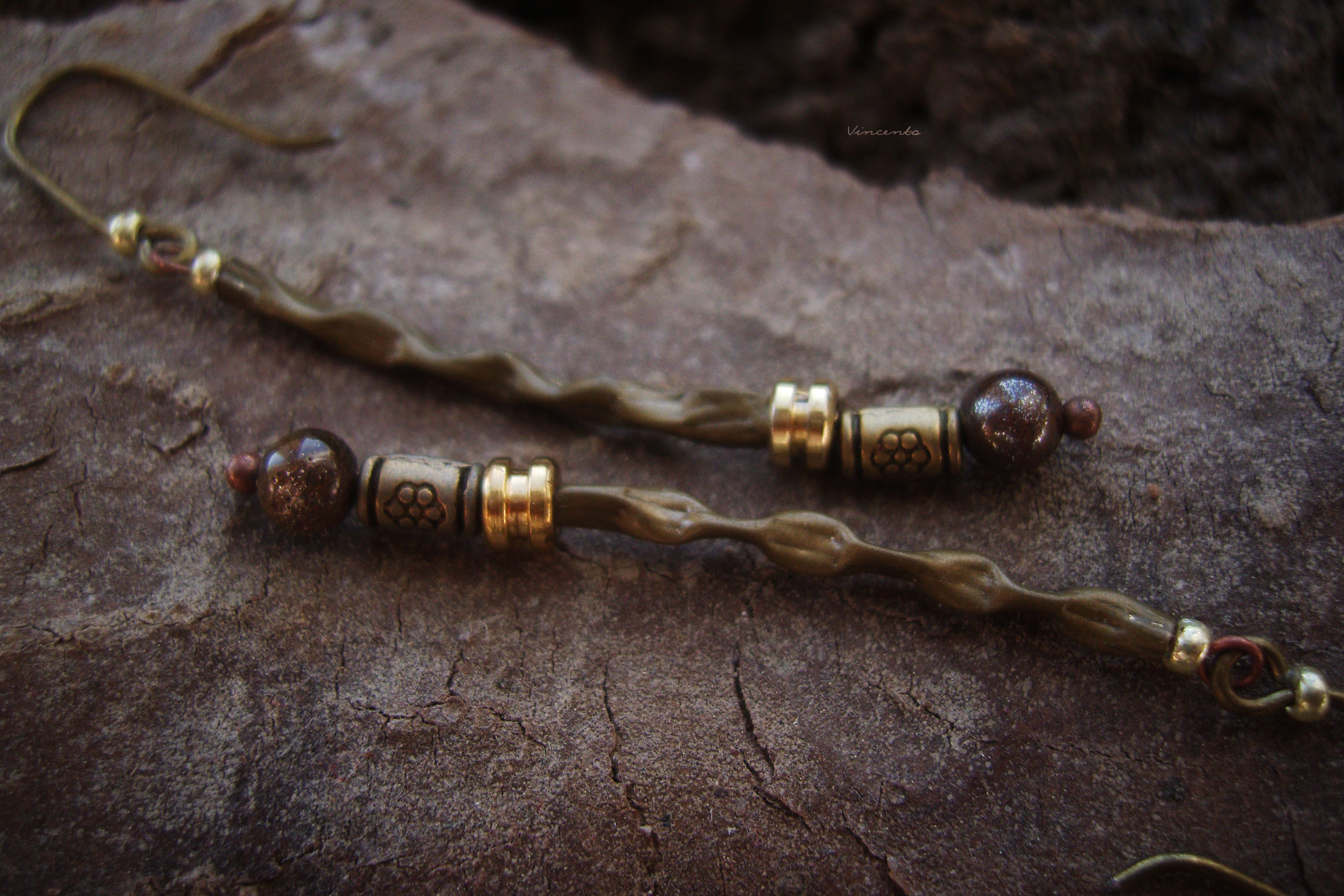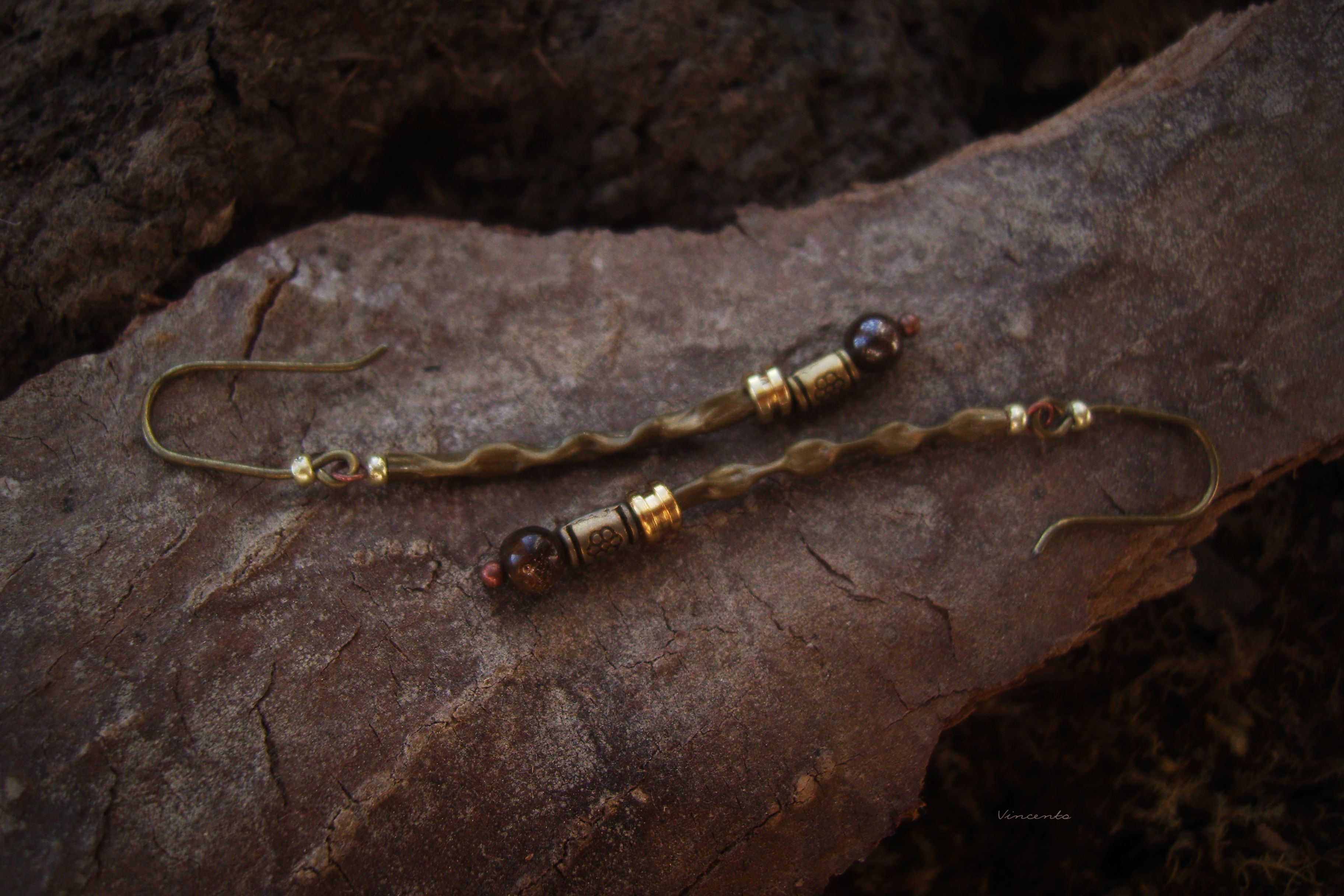 - Тонкие и лёгкие серёжки в стиле лесного бохо с бисером, бронзовыми бусинами и натуральными камнями тигрового глаза.