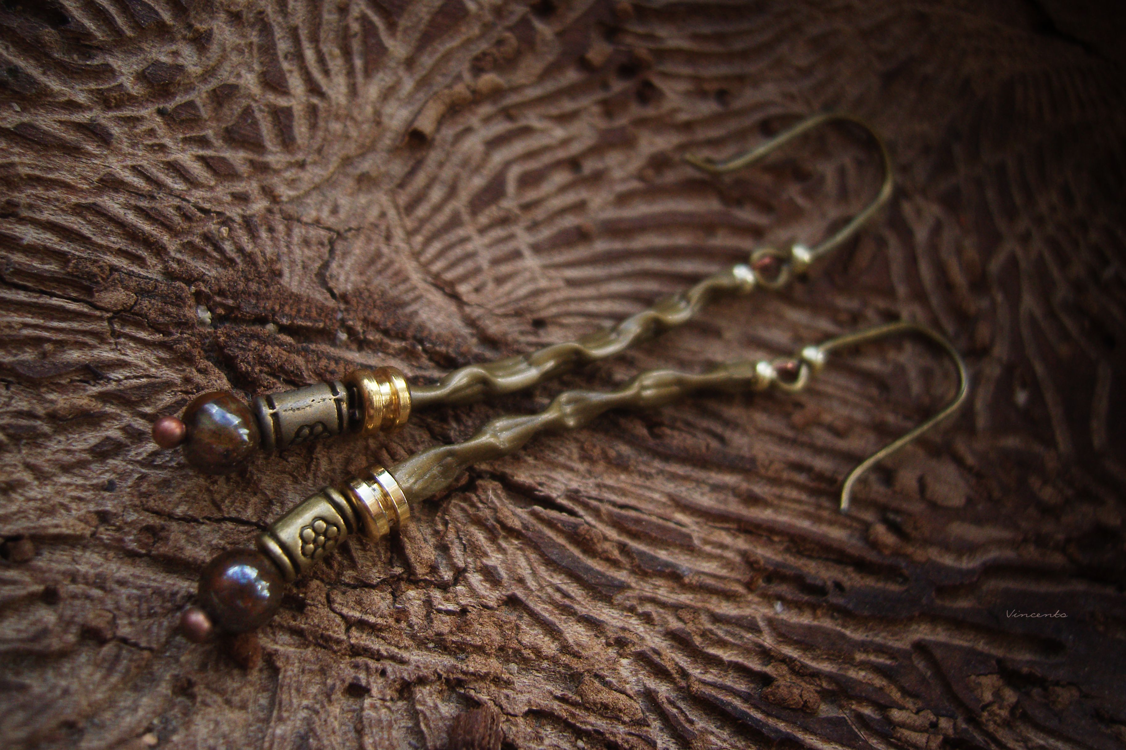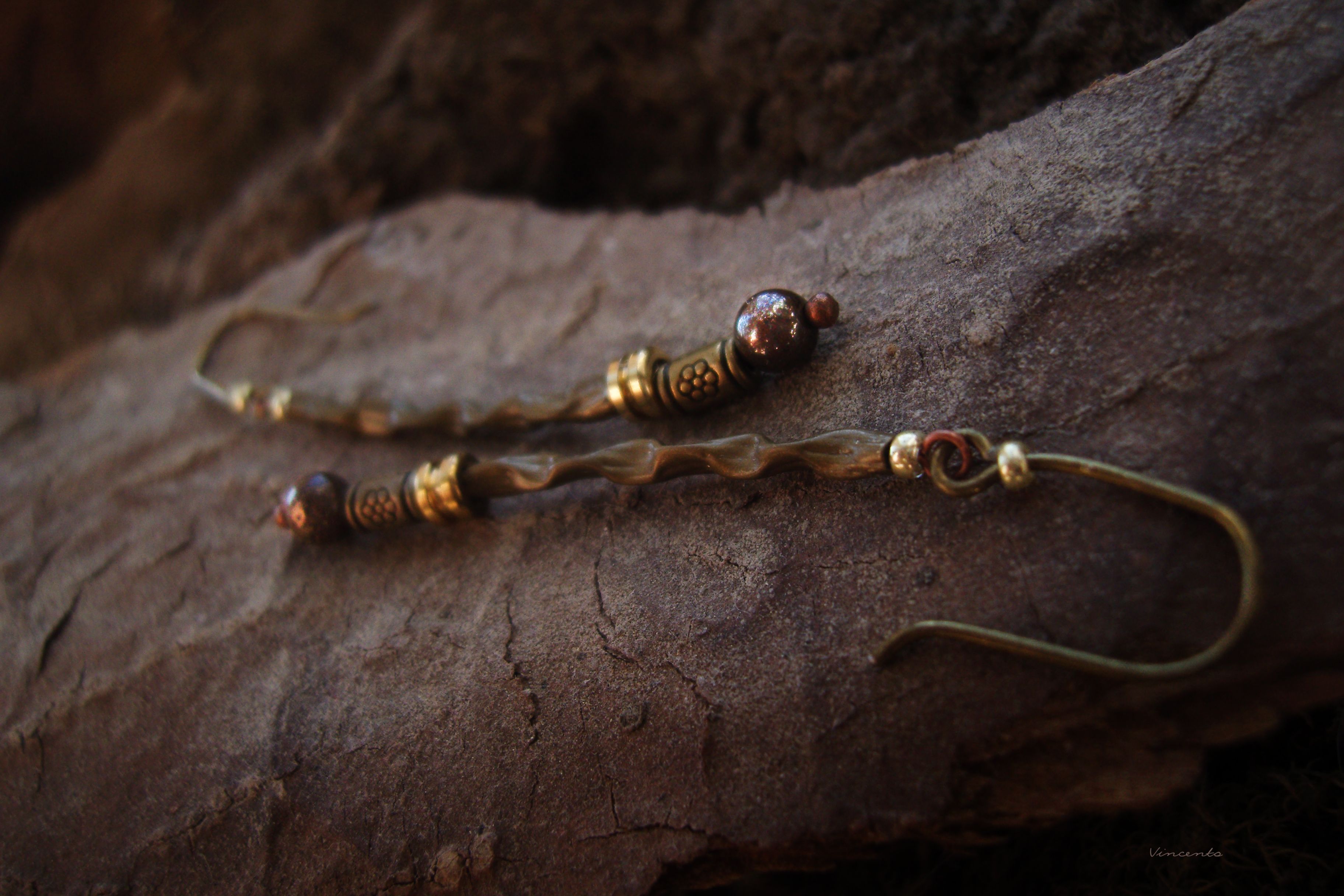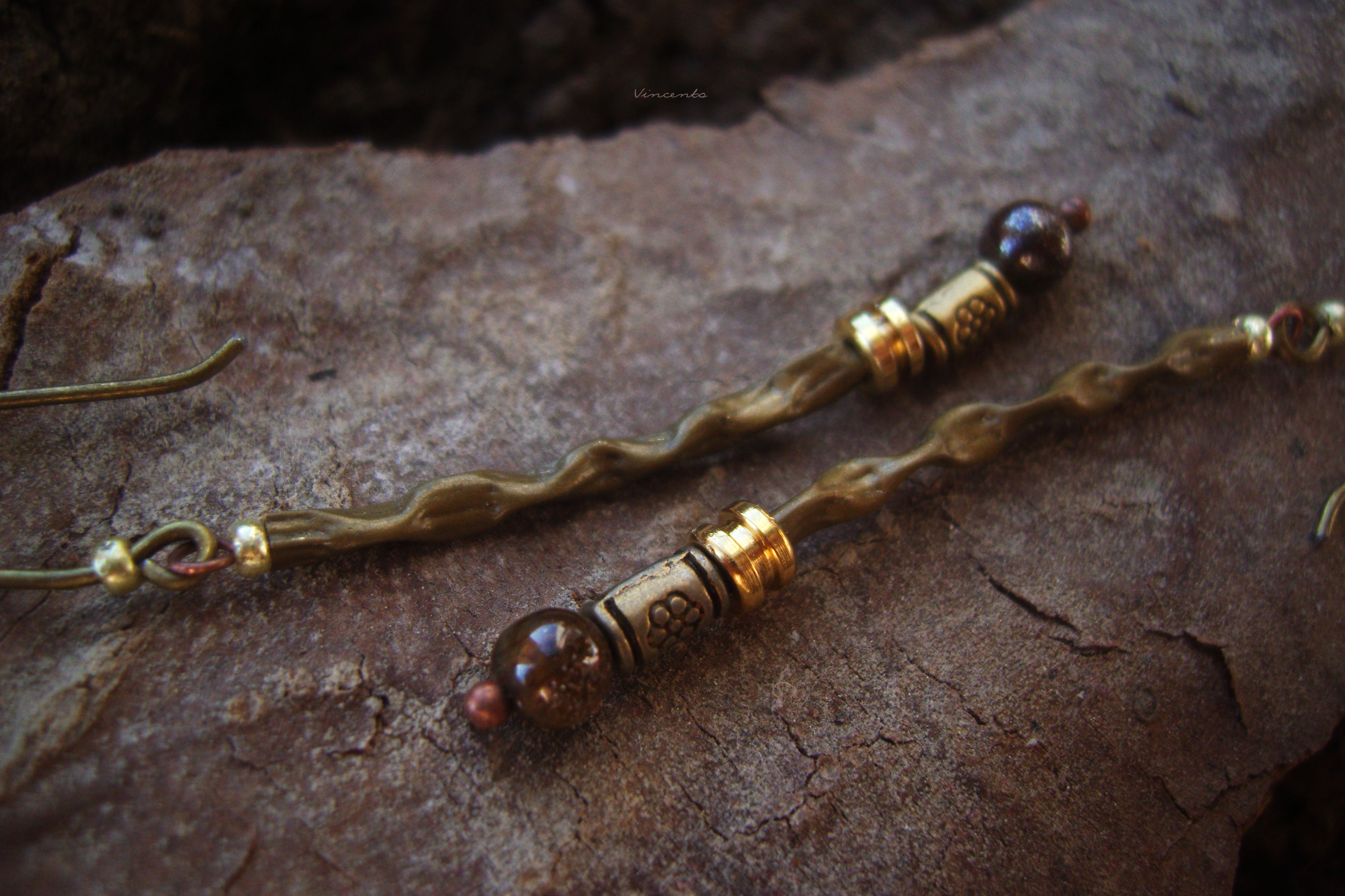 - Тонкие и лёгкие серёжки в стиле лесного бохо с бисером, бронзовыми бусинами и натуральными камнями тигрового глаза.