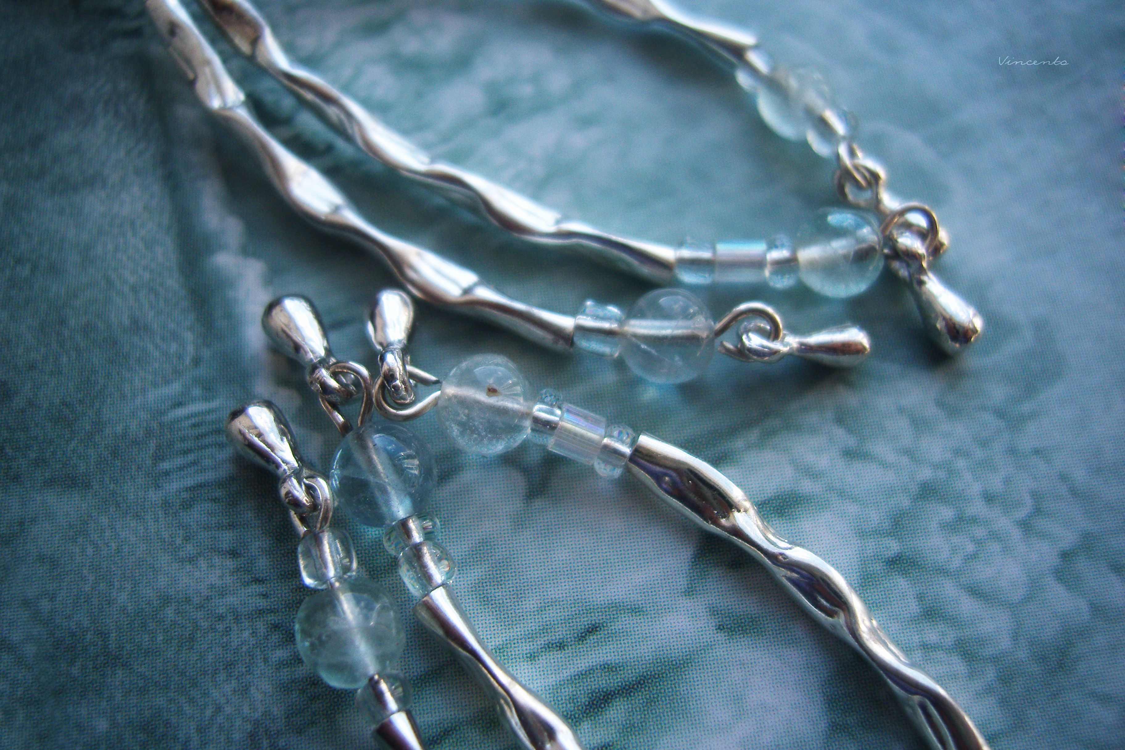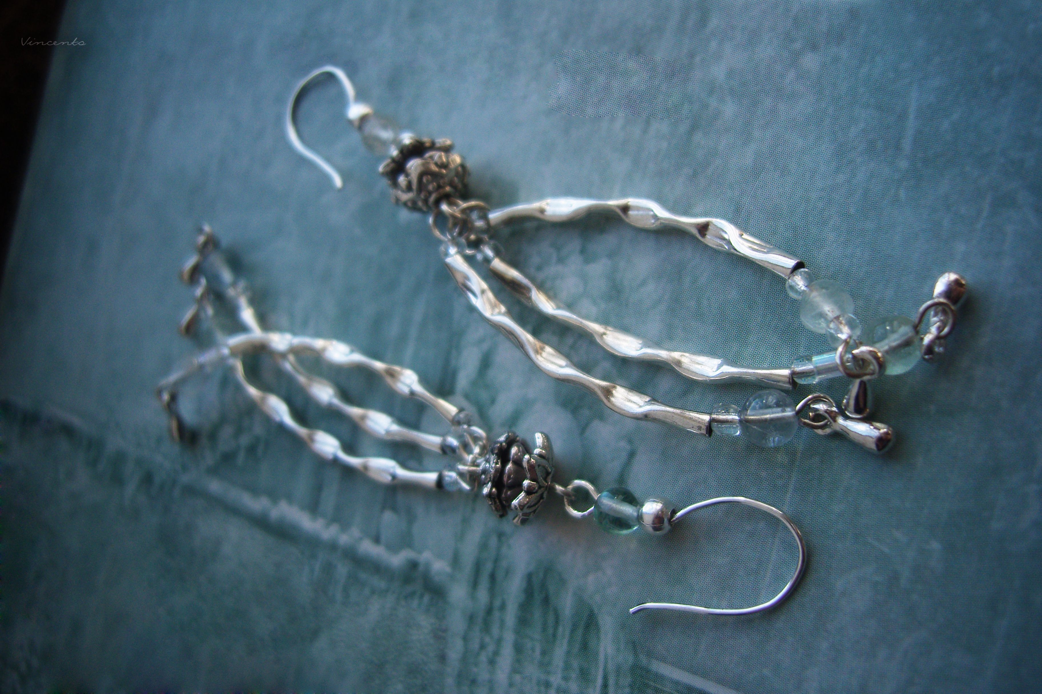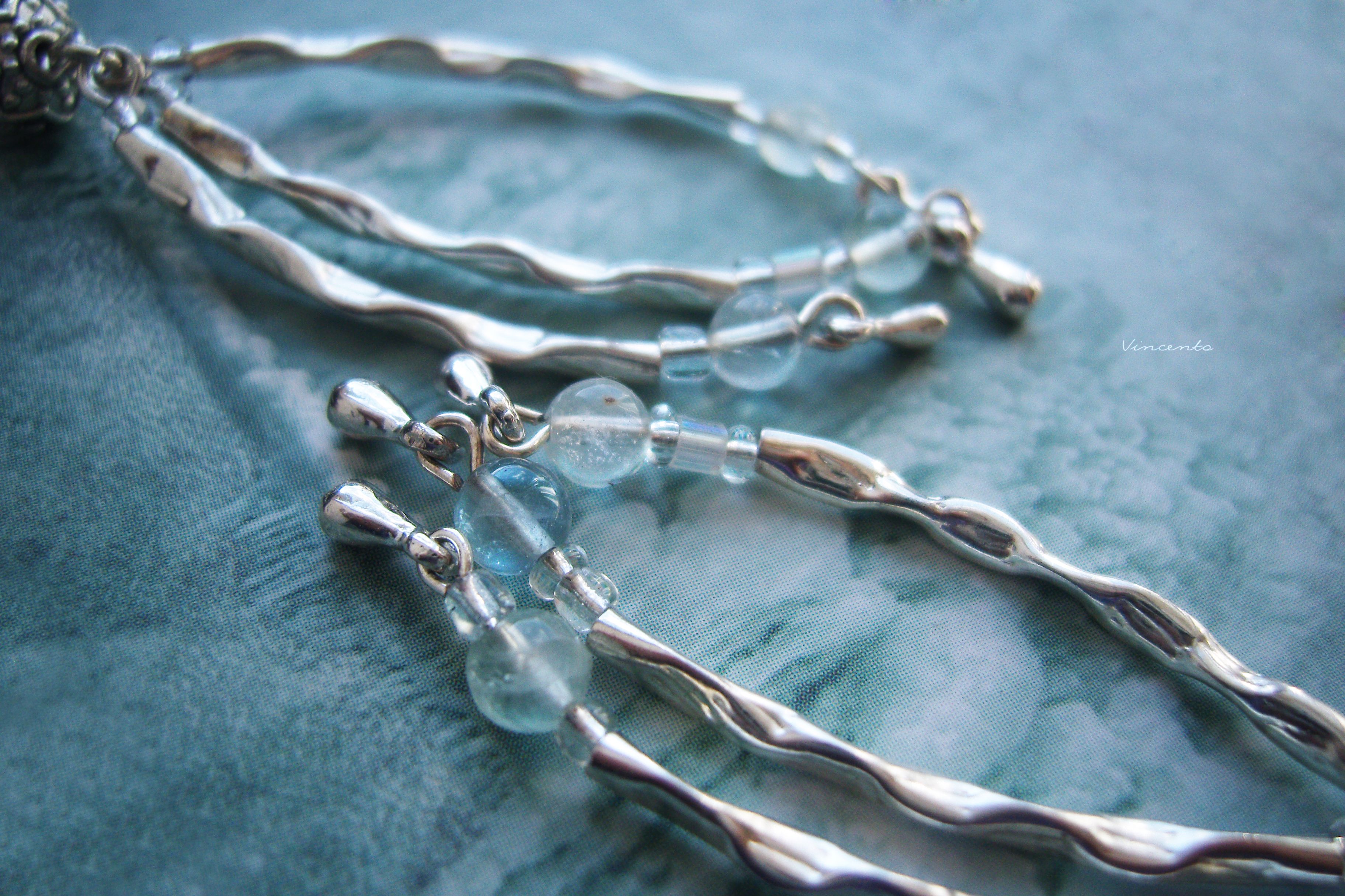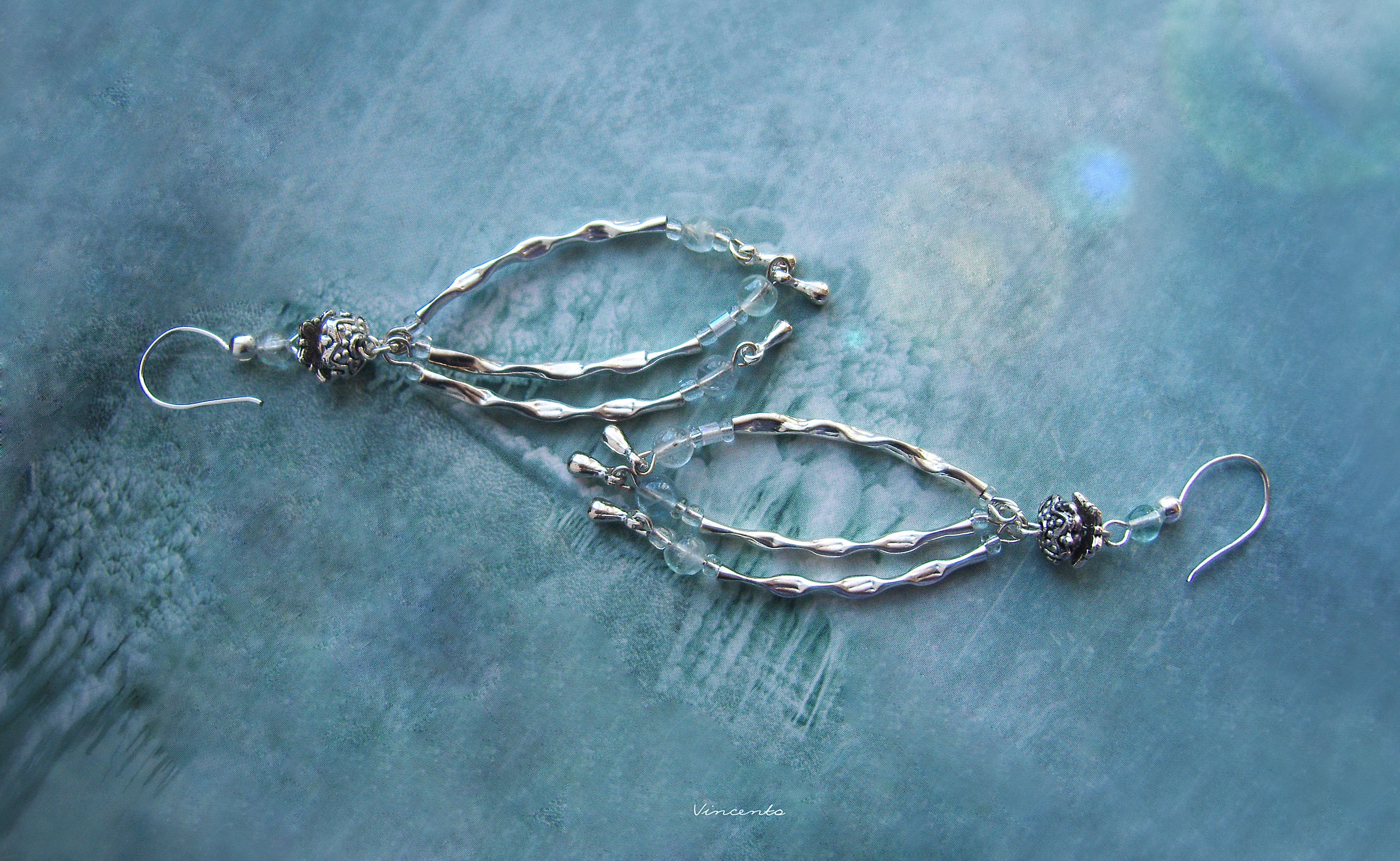 - Каждая серёжка состоит из трёх дугообразных "ручейков" - фактурных подвесок, напоминающих рябую поверхность бугщих вод. На их кончиках - серебристые капельки, закреплённые подвижно, так, чтобы красиво покачиваться при малейшем движении.