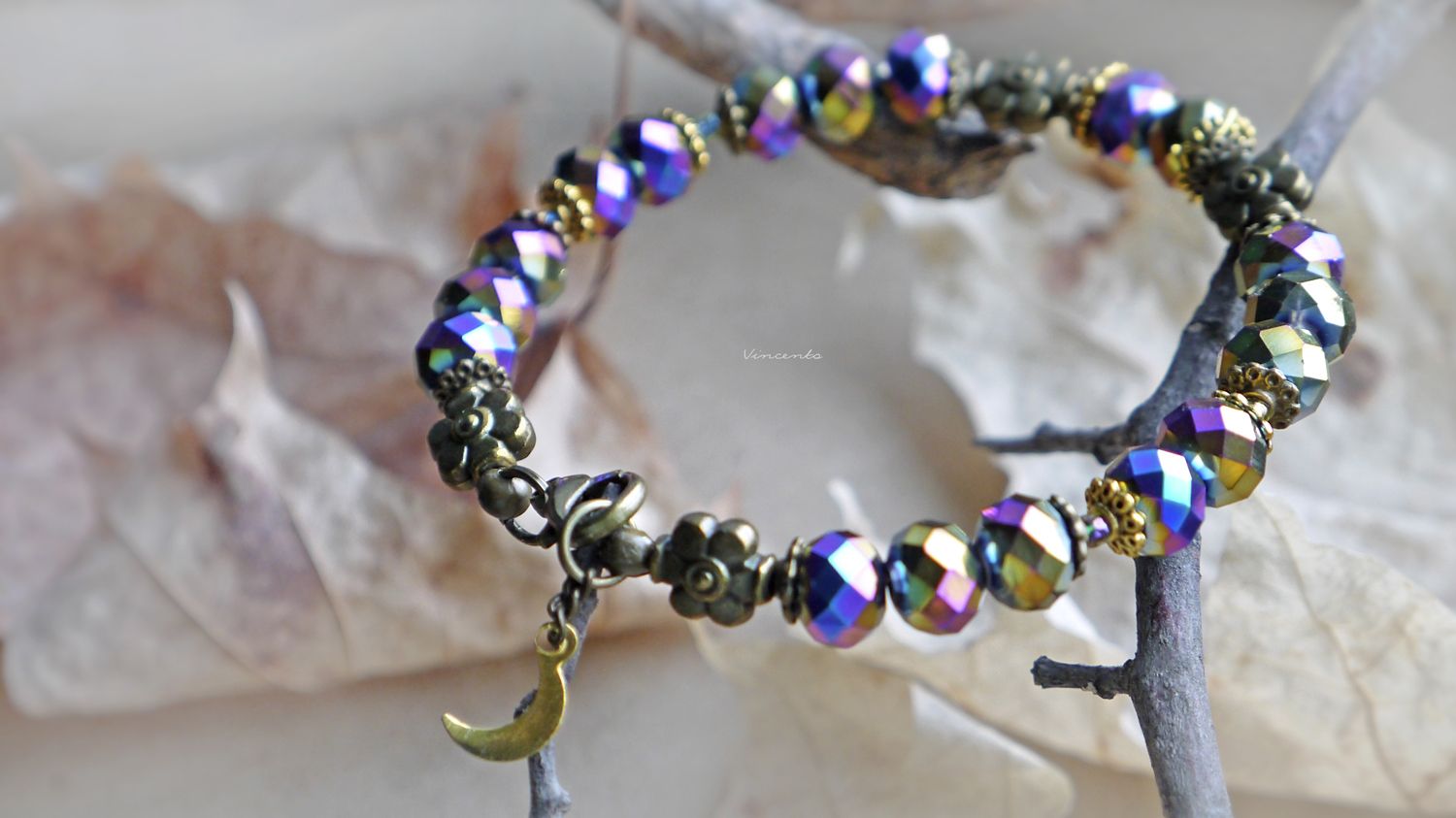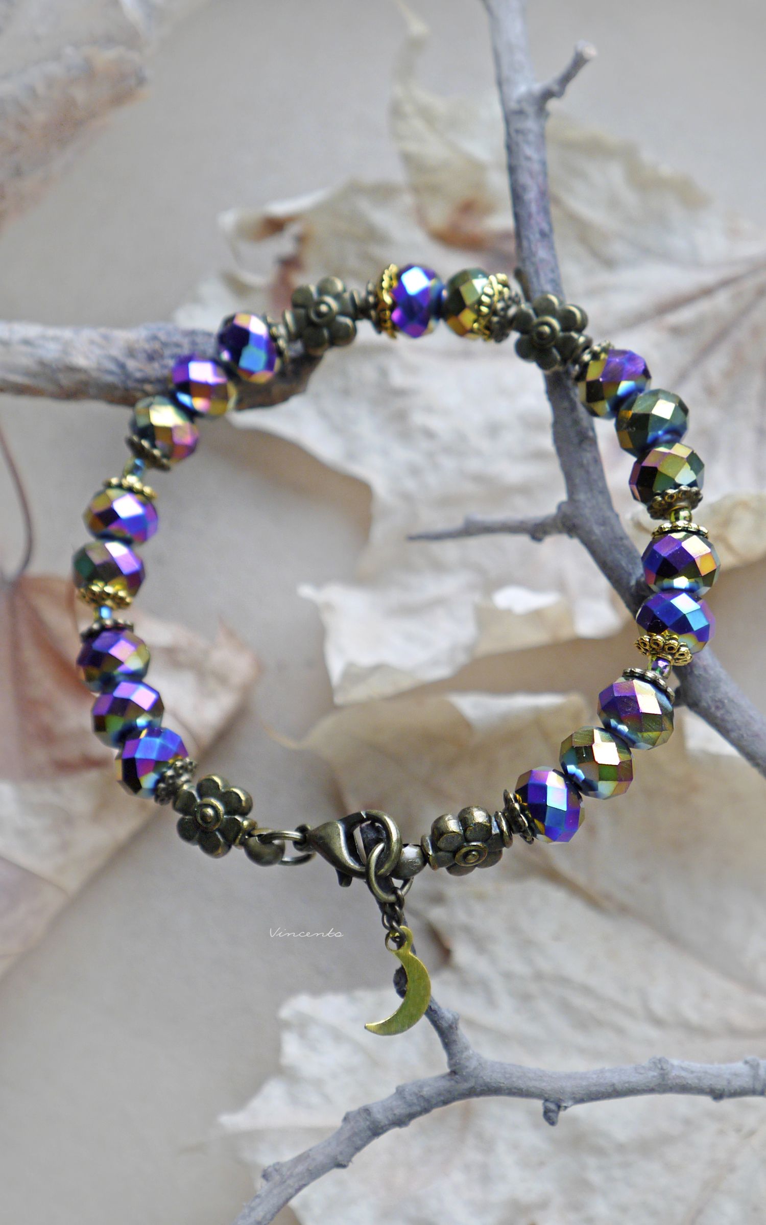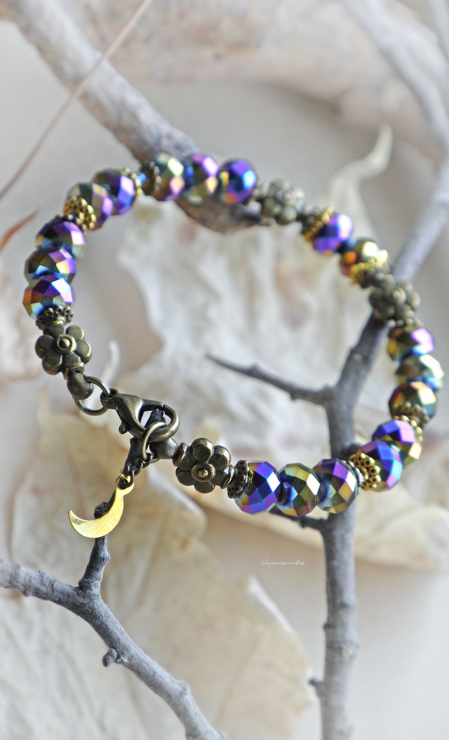 - Фантазийный браслет с гранёными радужными хрусталиками, бронзовыми цветочками, кружевными элементами и тоненьким месяцем-подвеской.