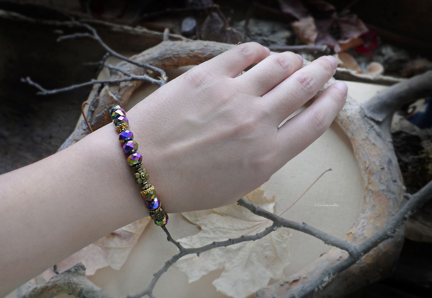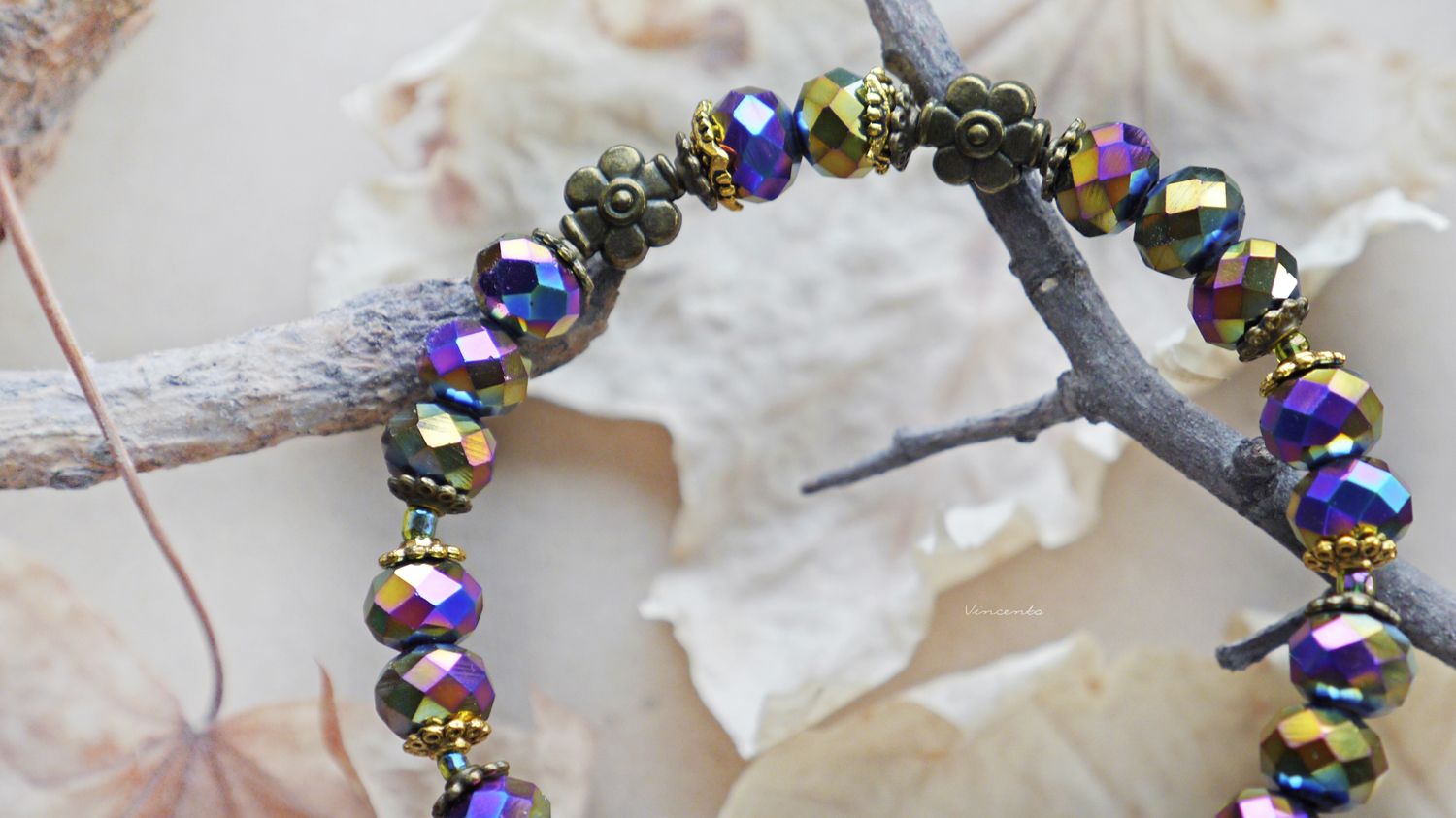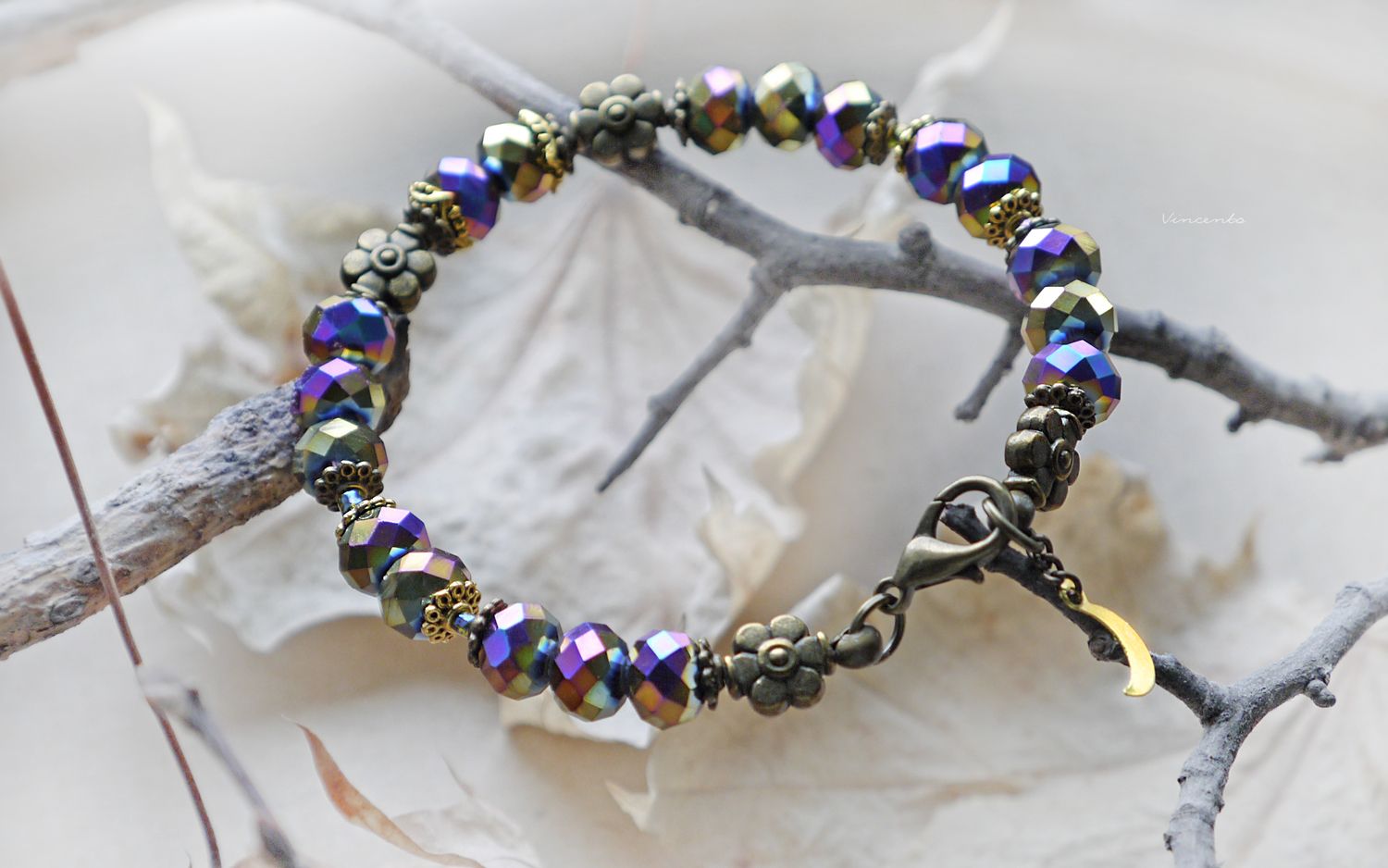 - Фантазийный браслет с гранёными радужными хрусталиками, бронзовыми цветочками, кружевными элементами и тоненьким месяцем-подвеской.