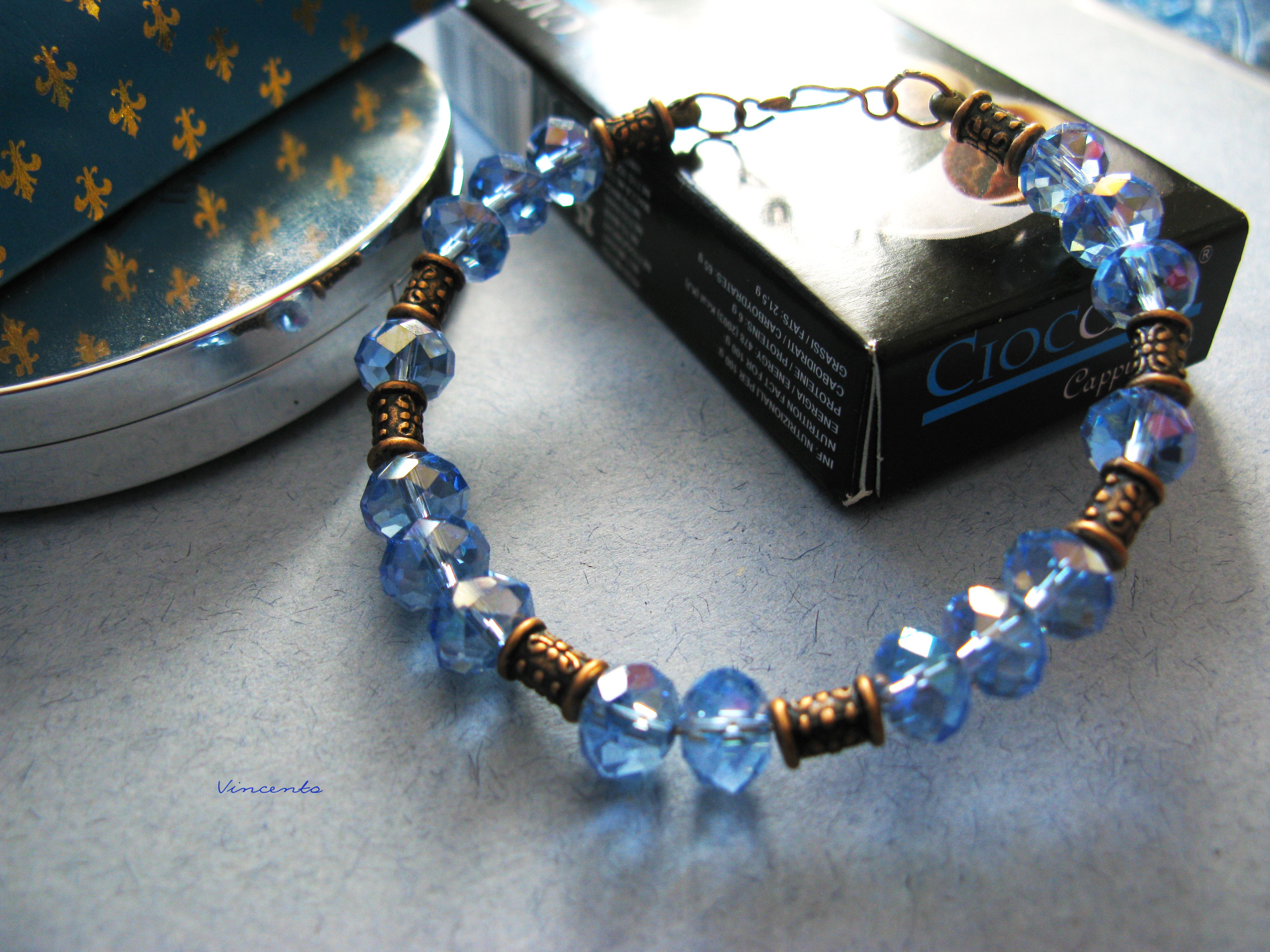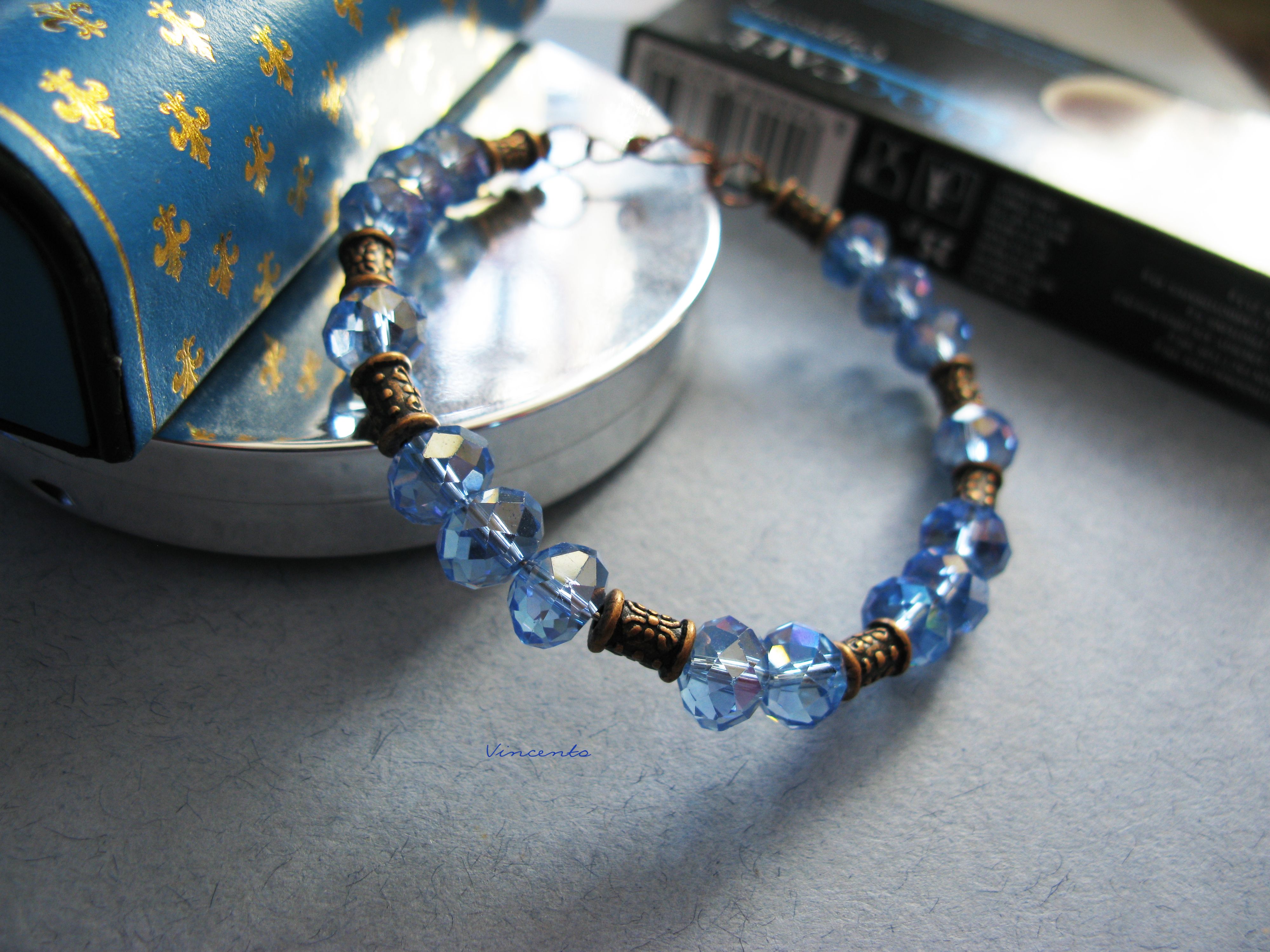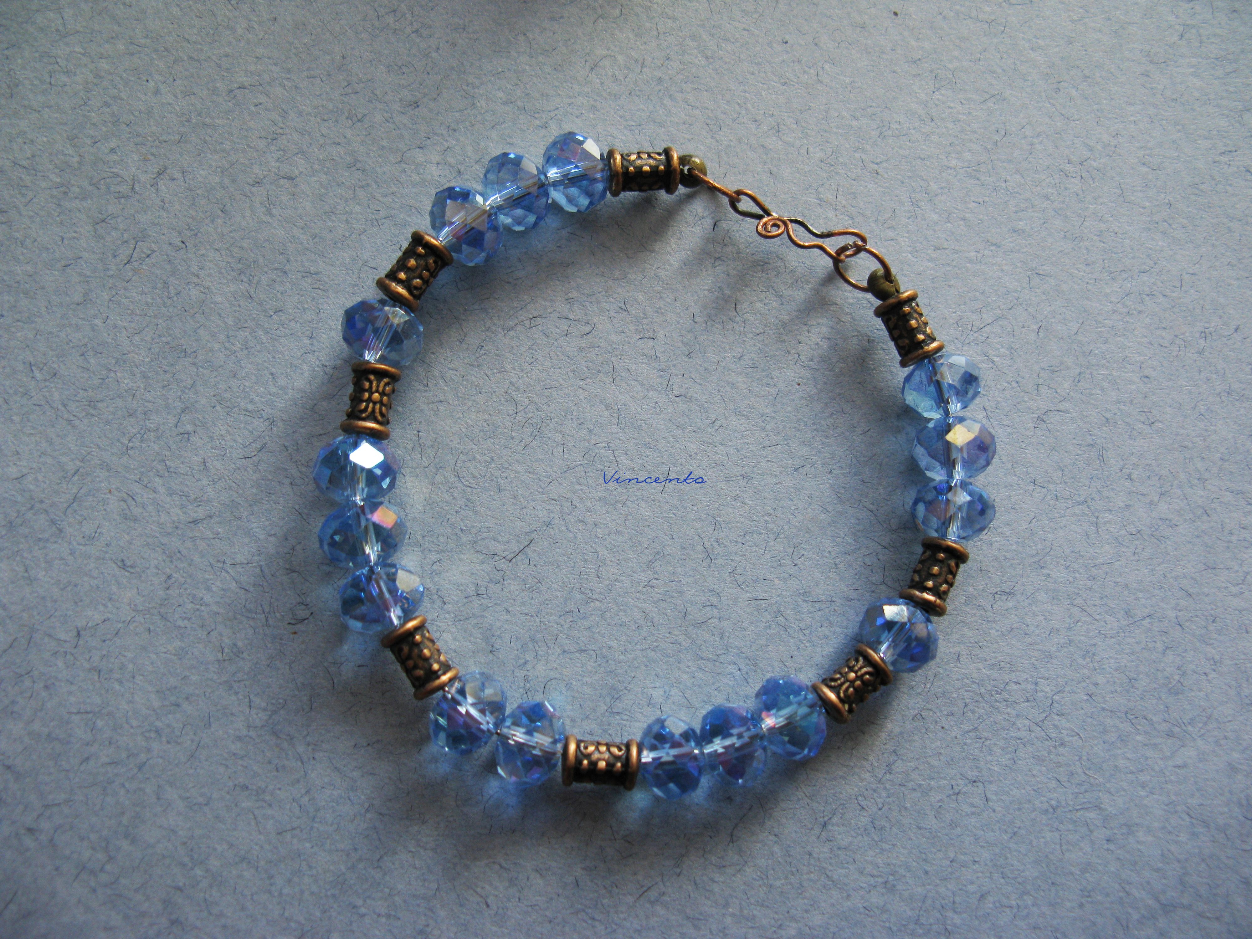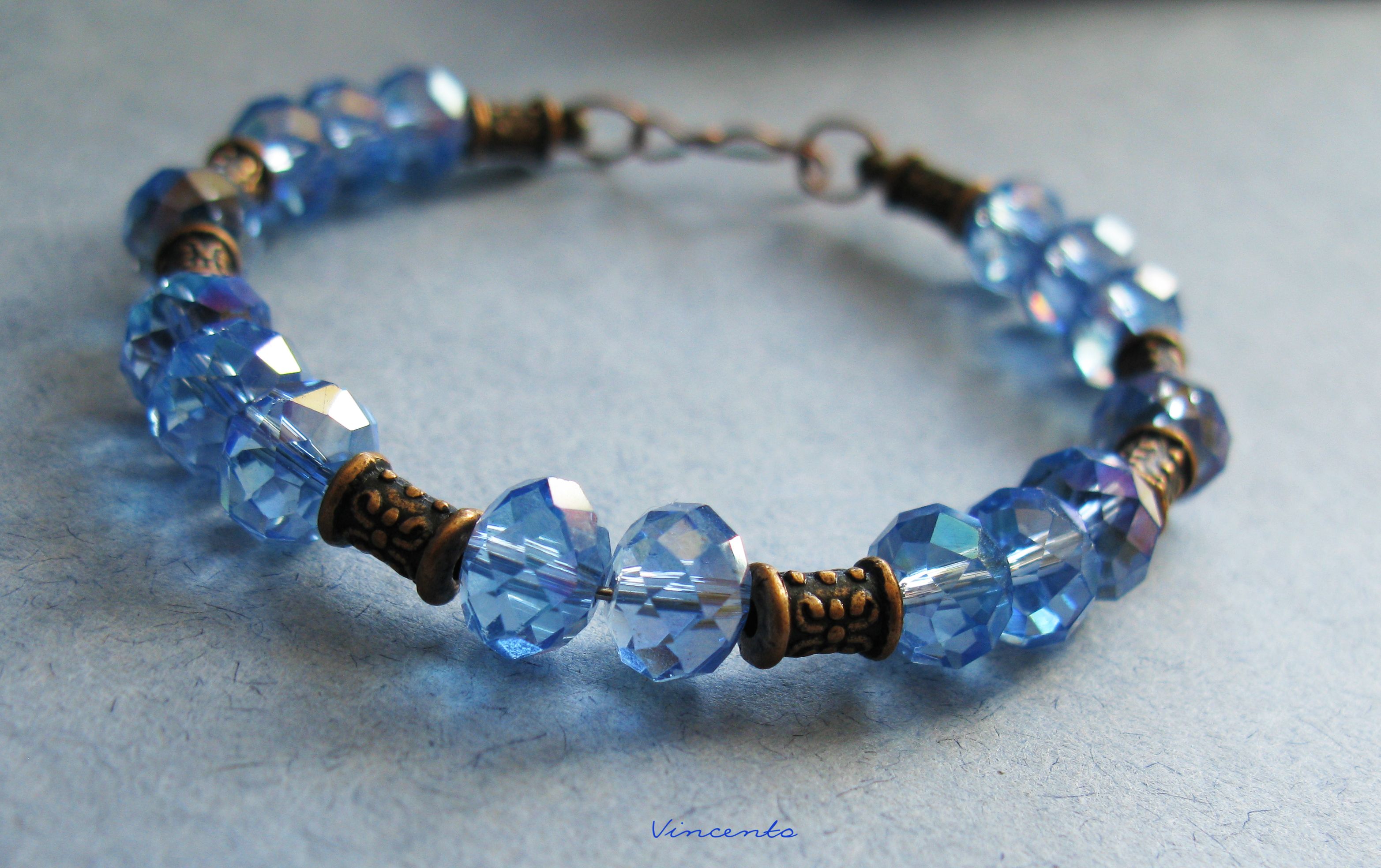 - Красивый браслет ручной сборки в греческом стиле с гранёными голубыми кристаллами и фактурными медными бусинами.