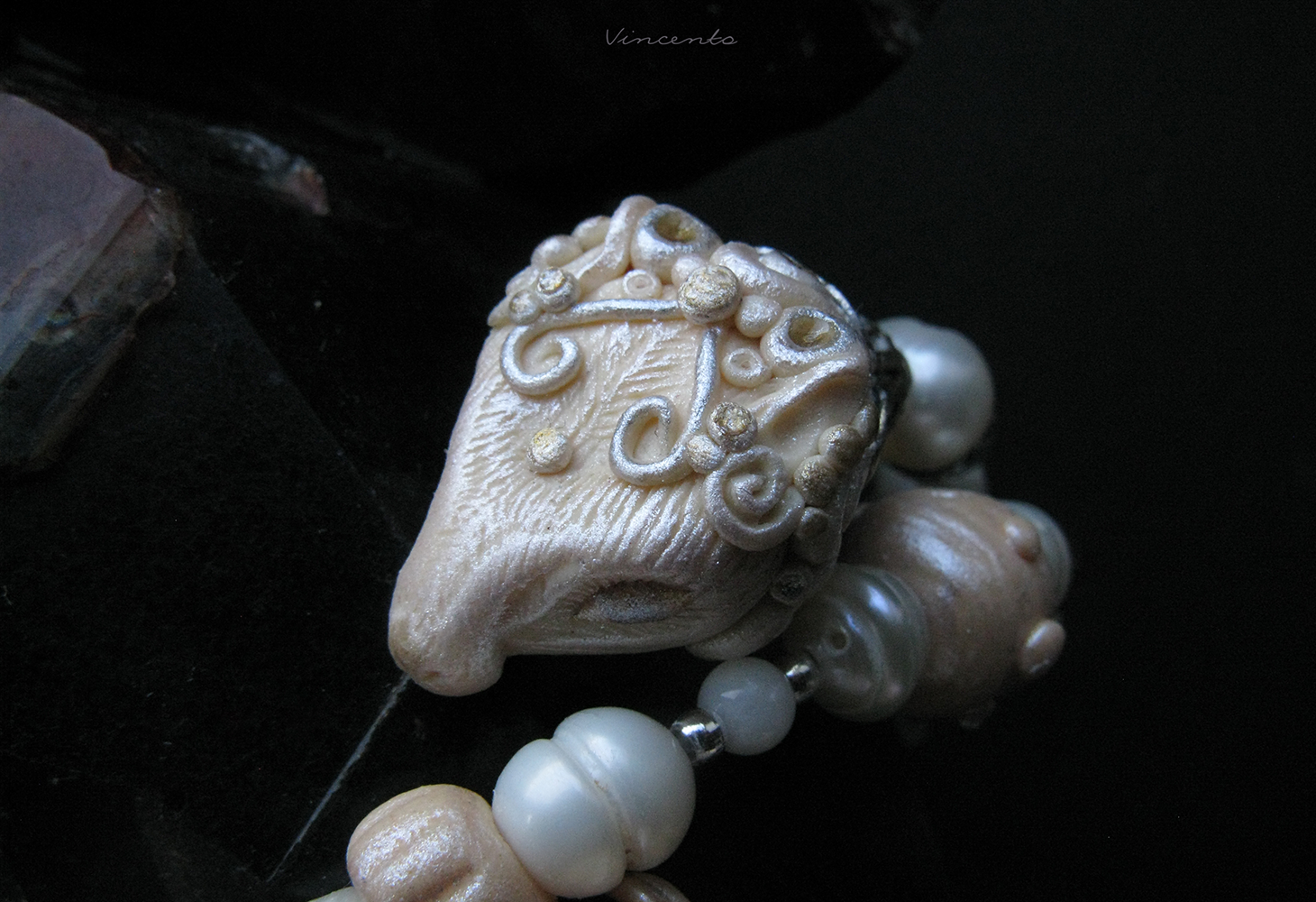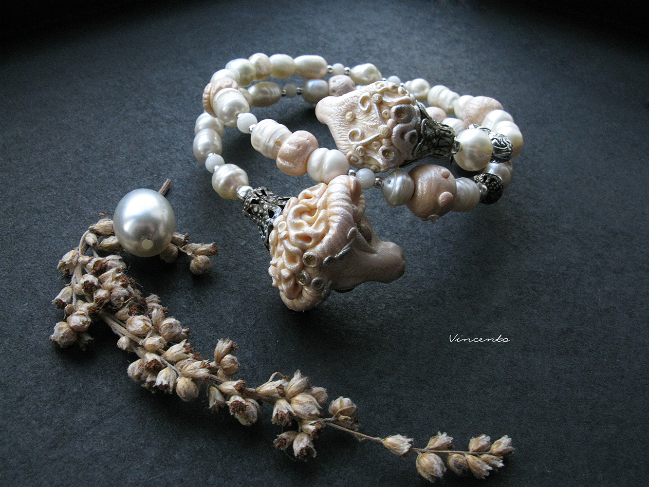 - Материалы: экоглина, жемчуг, коралл, металлическая фурнитура, пигменты, лаки.