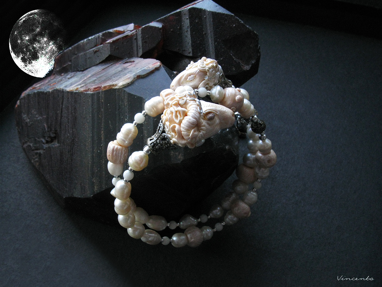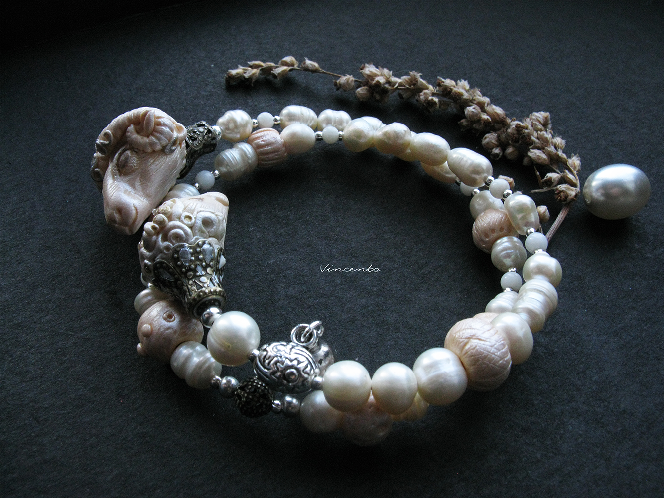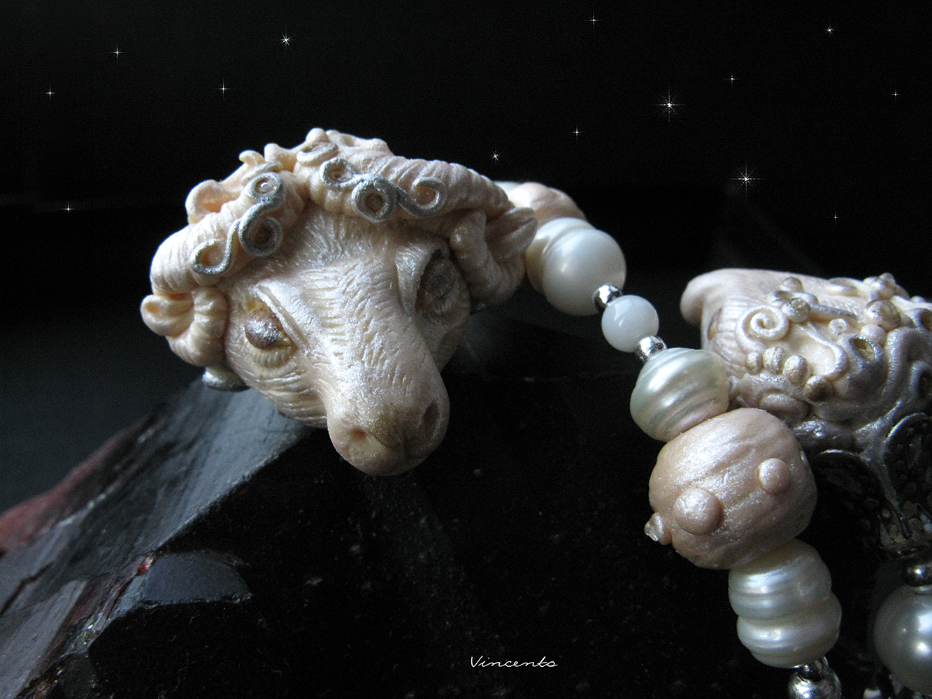 - Изысканный, невероятно нежный браслет с фактурными речными жемчужинами молочных тонов и авторскими бусинами, выполненными в технике скульптурной миниатюры, в виде овечки и барашка.