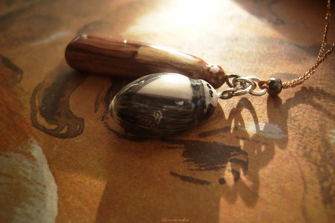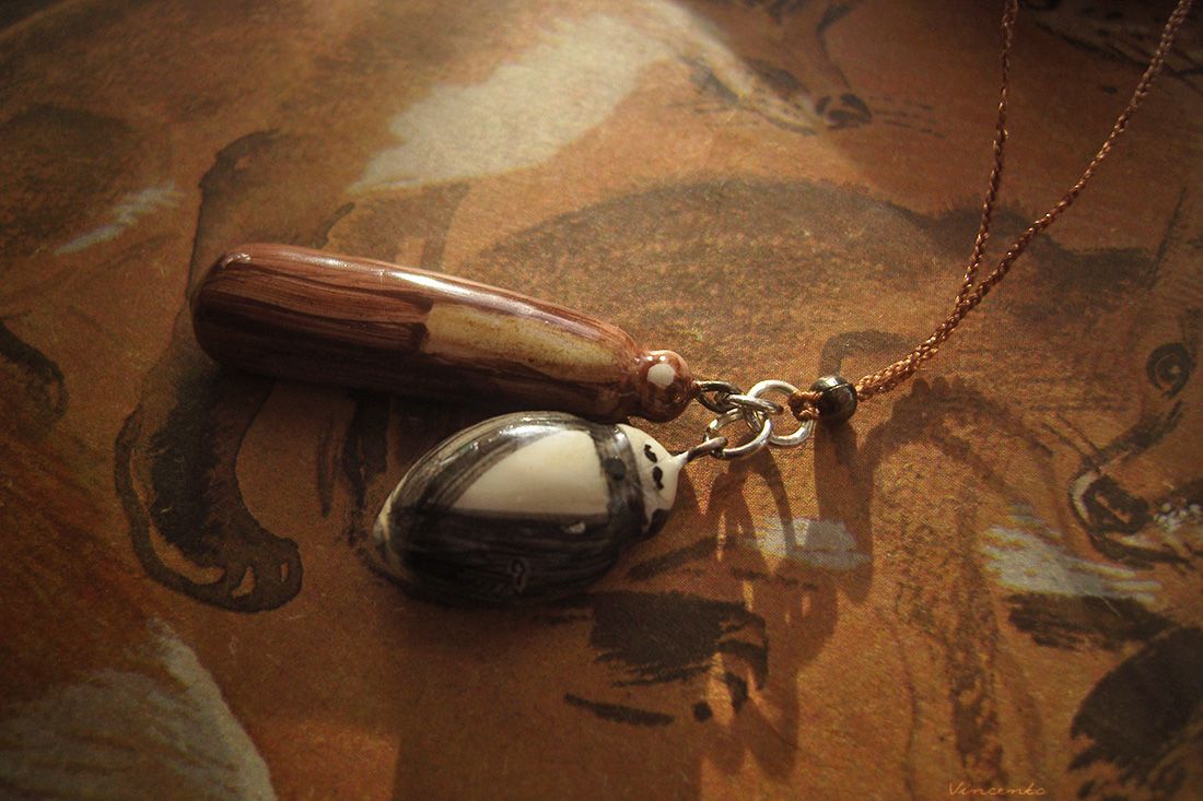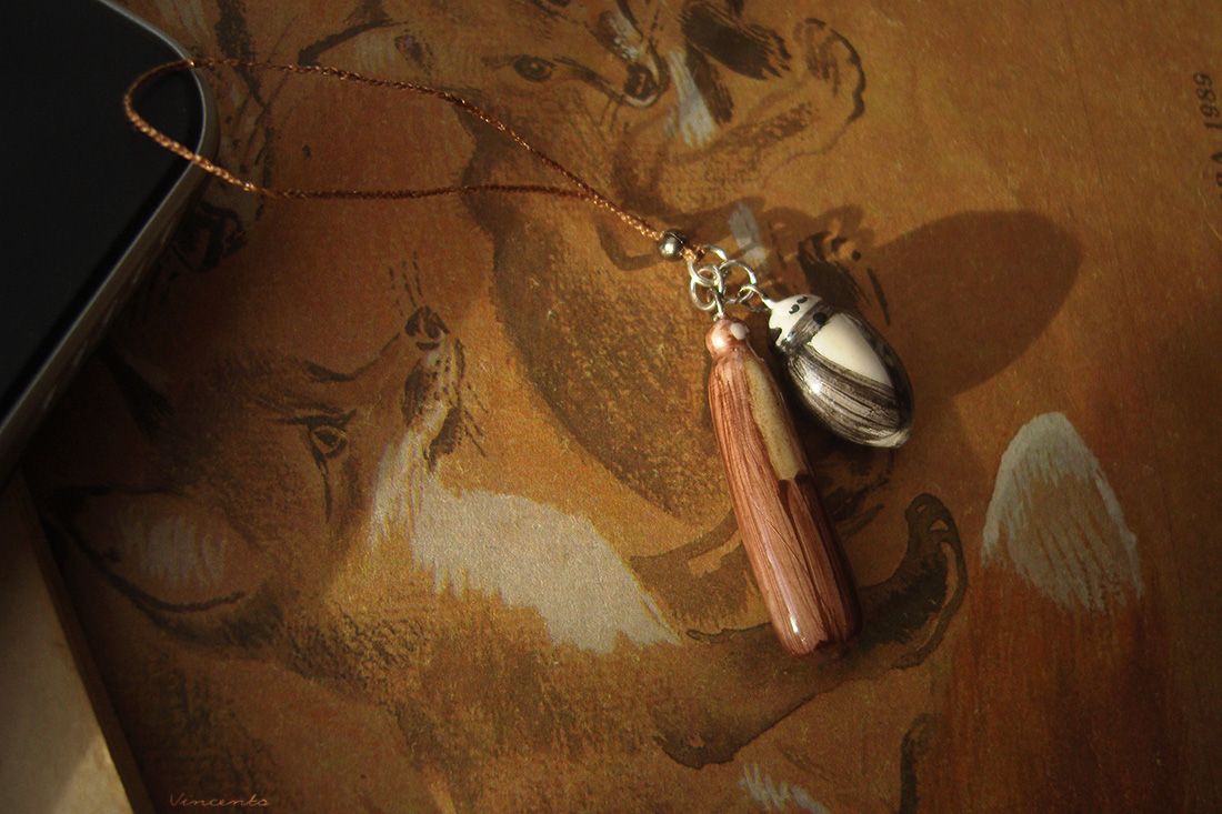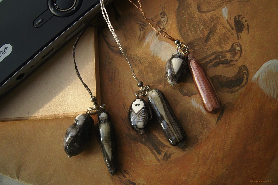 - Материалы: холодный фарфор, металлическая фурнитура, акриловые краски, лак, стекловидная масса, шёлковые нити.