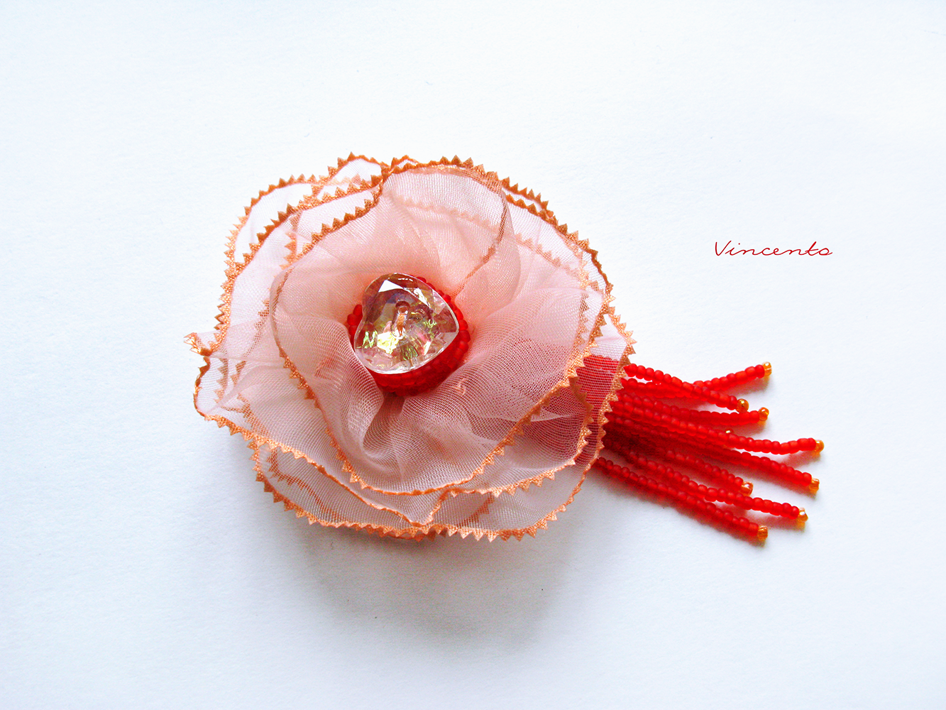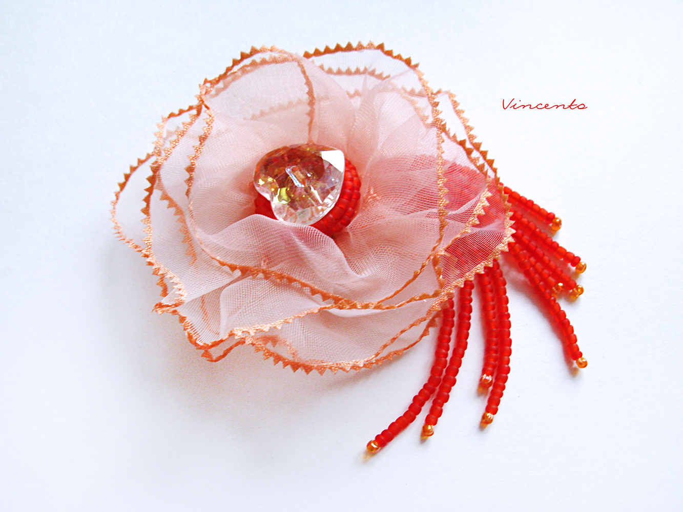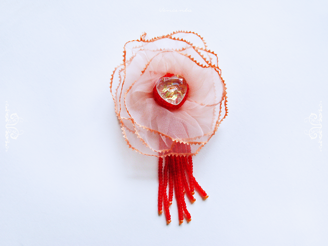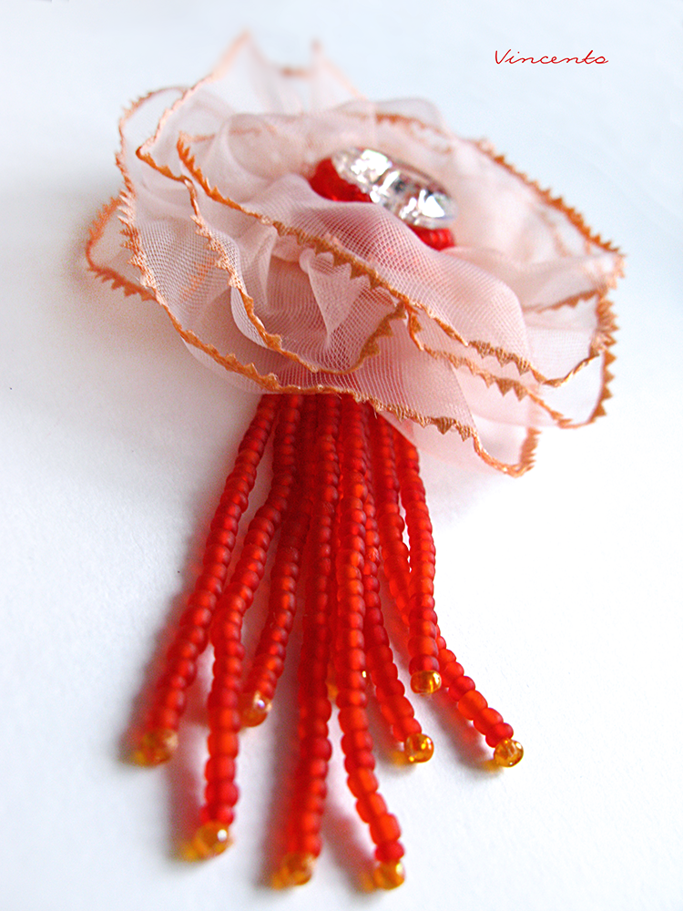 - Кокетливая брошь-цветок из органзы в парадной цветовой гамме: нежный розовый с матовым красным и искристым прозрачным сердцем с золотистым отливом...