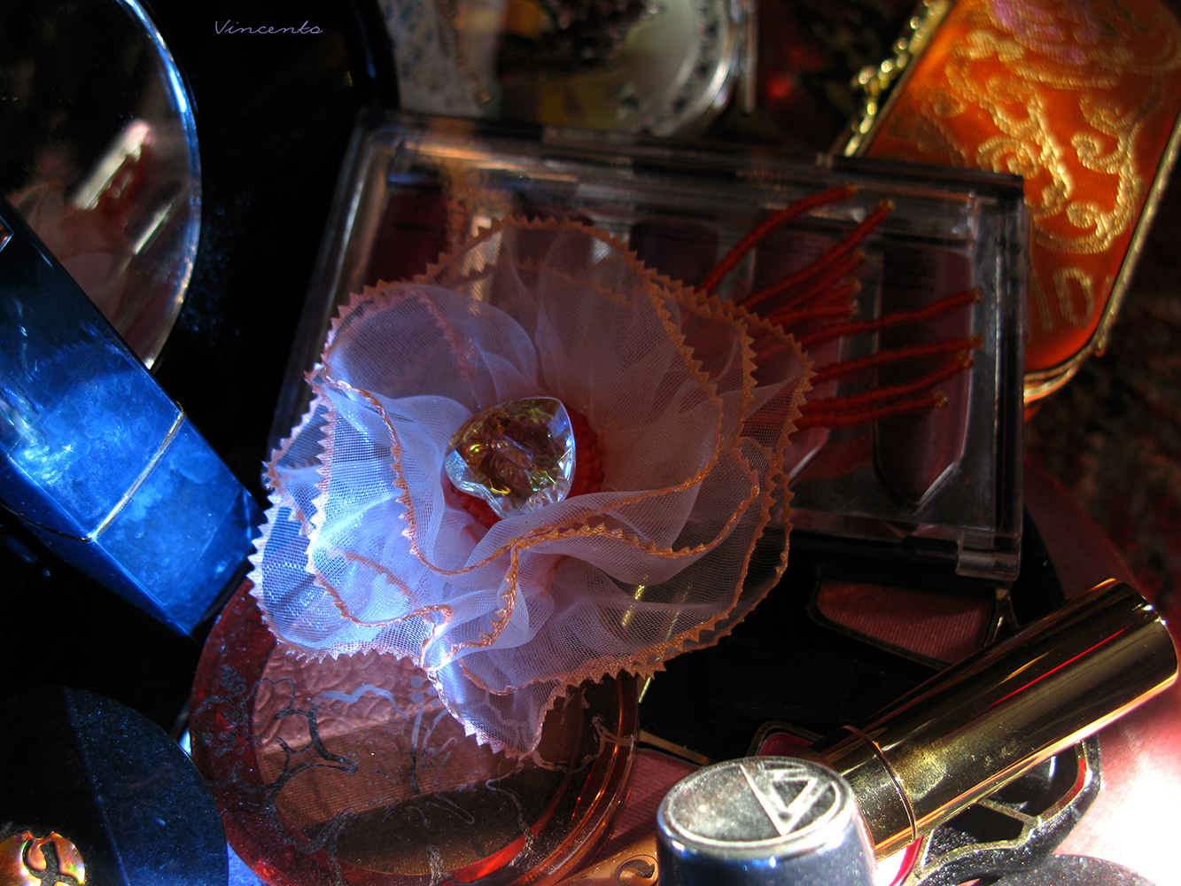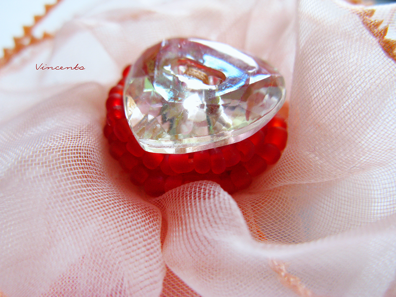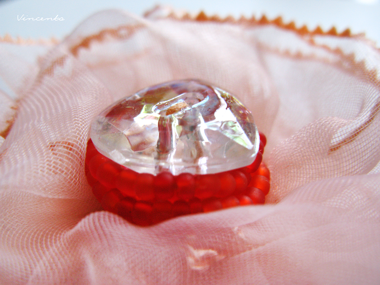 - Кокетливая брошь-цветок из органзы в парадной цветовой гамме: нежный розовый с матовым красным и искристым прозрачным сердцем с золотистым отливом...