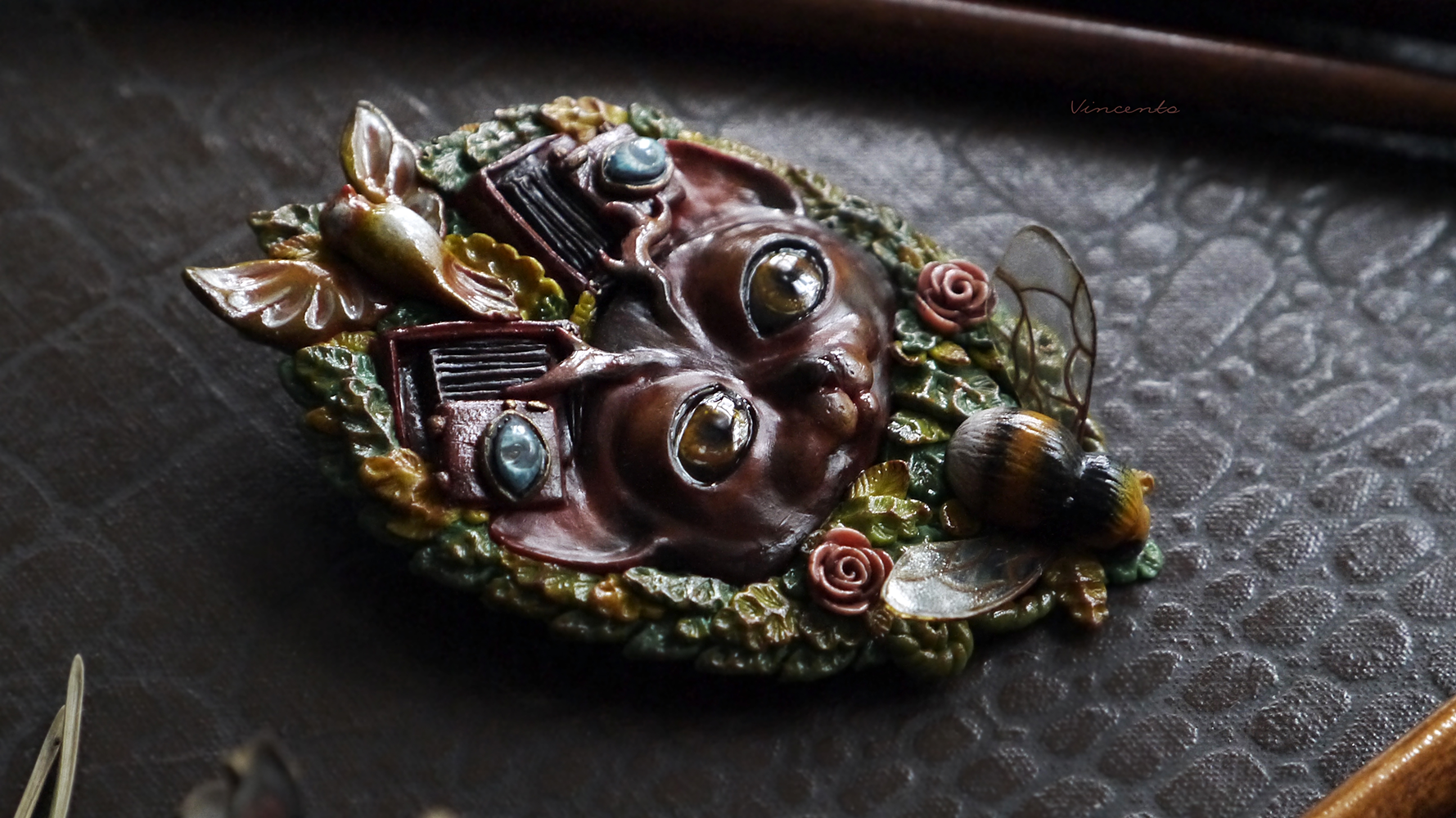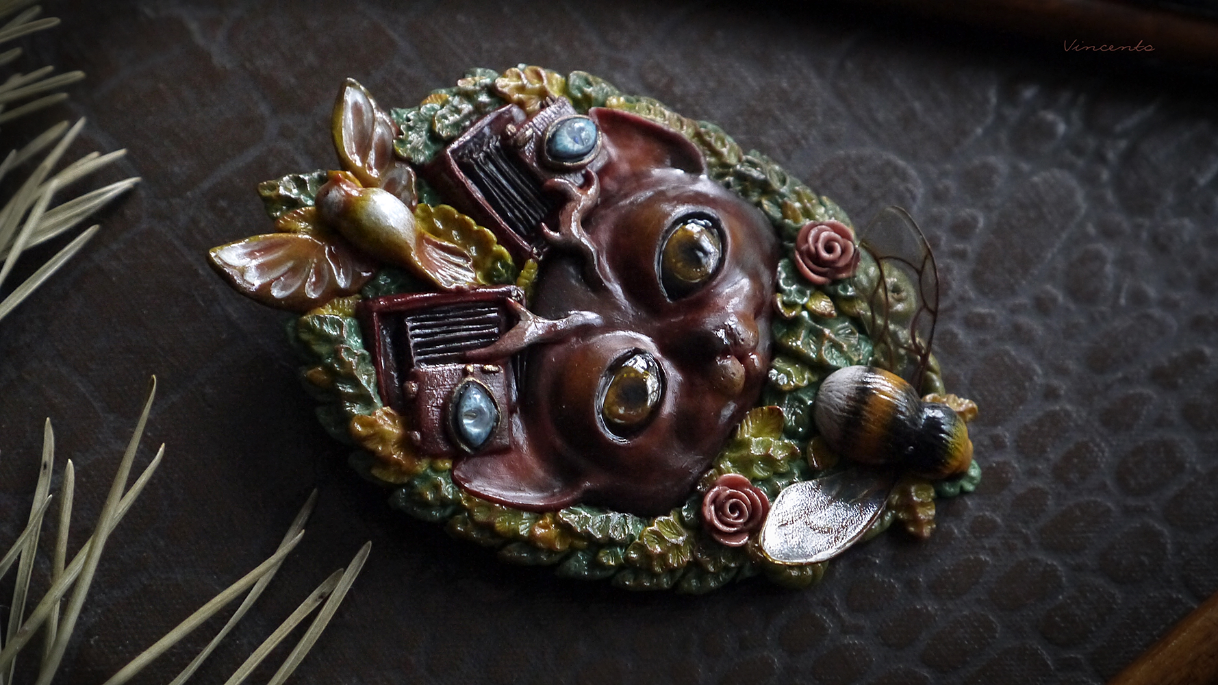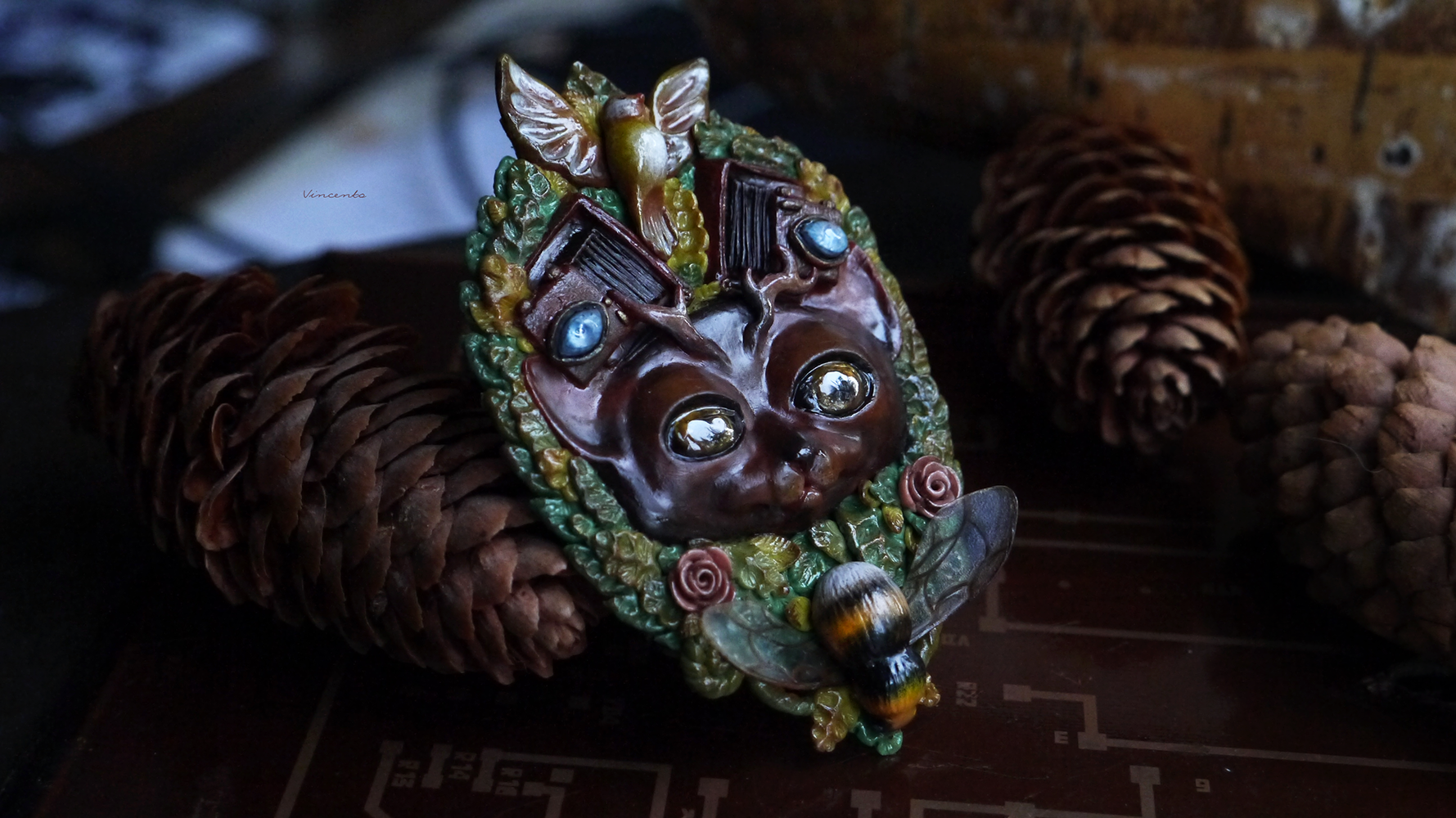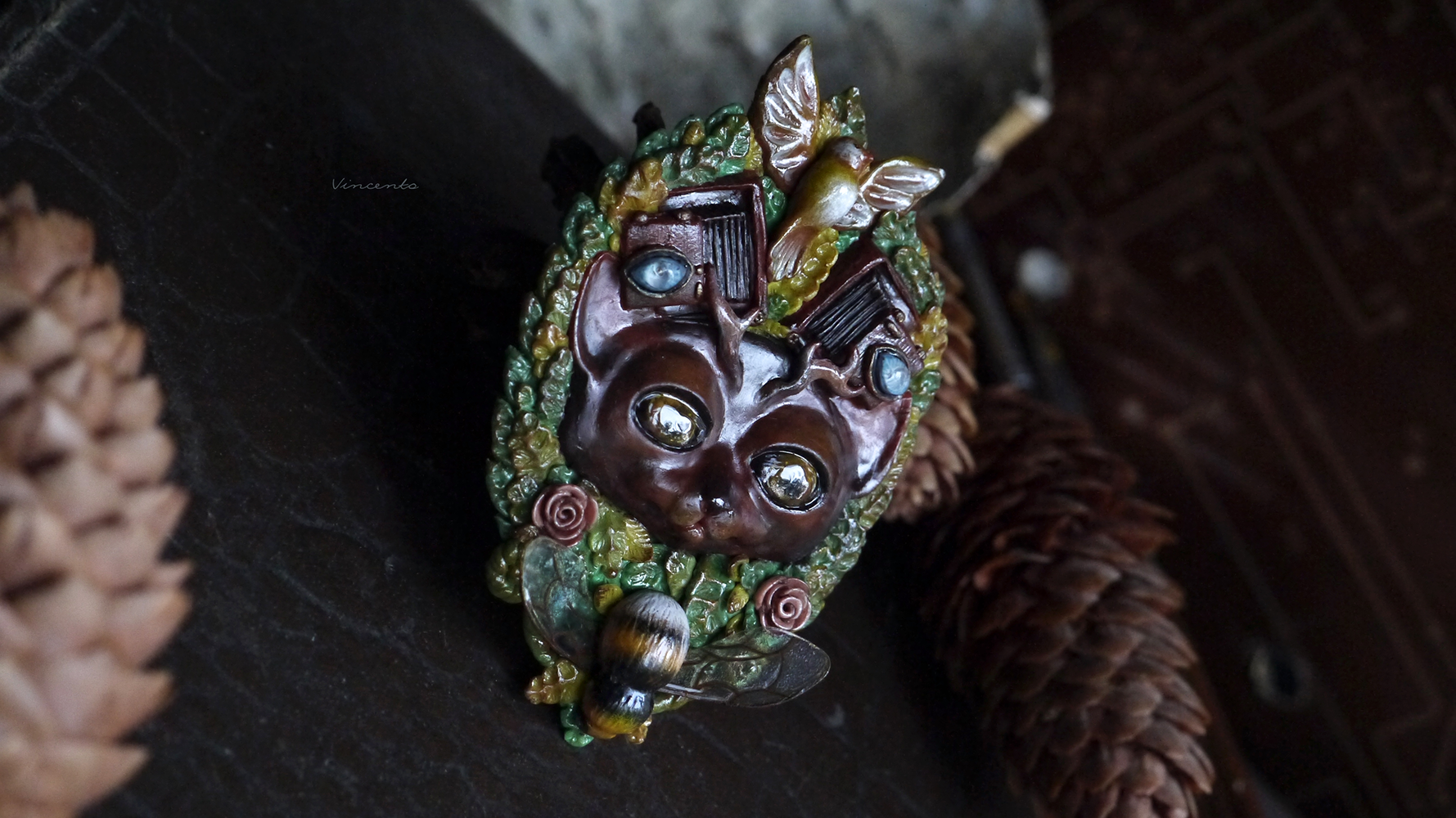 - Коллекционная брошь ручной работы в виде фантастического Лесного Духа - существа, напоминающего кота с оленьими рожками. Вот только это не единственная его "необычность"! У Духа на голове особые фотокамеры - старинные, тяжёлые, со складными пластинами... По легенде, они делают самые яркие и чёткие снимки, стоит только Духу моргнуть глазами.