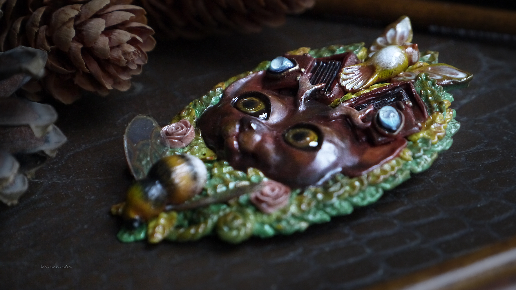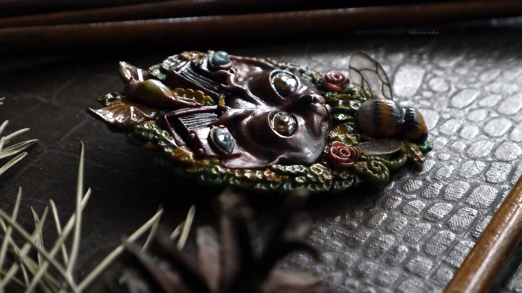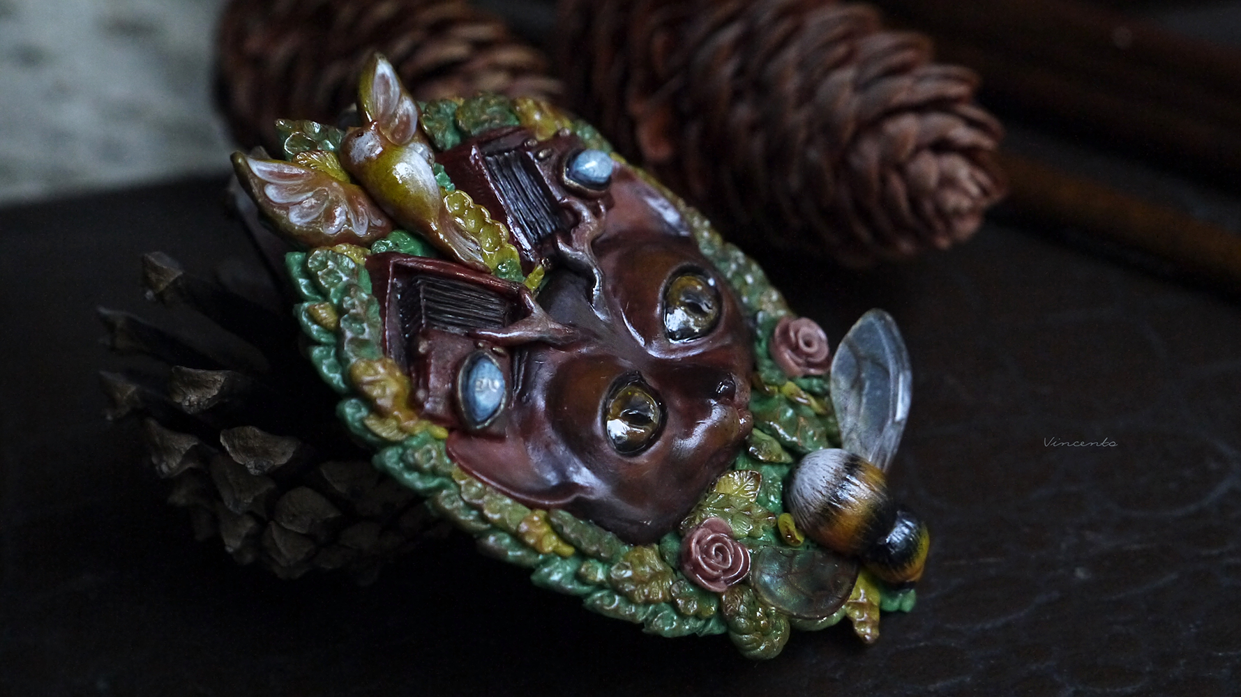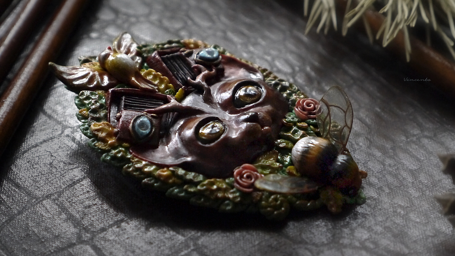 - Коллекционная брошь ручной работы в виде фантастического Лесного Духа - существа, напоминающего кота с оленьими рожками. Вот только это не единственная его "необычность"! У Духа на голове особые фотокамеры - старинные, тяжёлые, со складными пластинами... По легенде, они делают самые яркие и чёткие снимки, стоит только Духу моргнуть глазами.