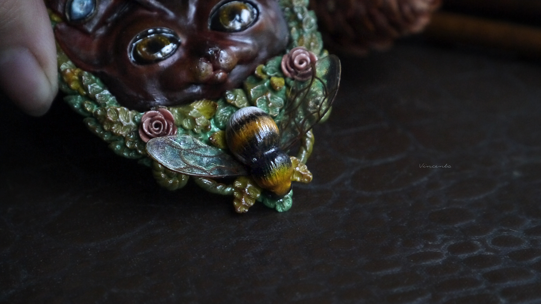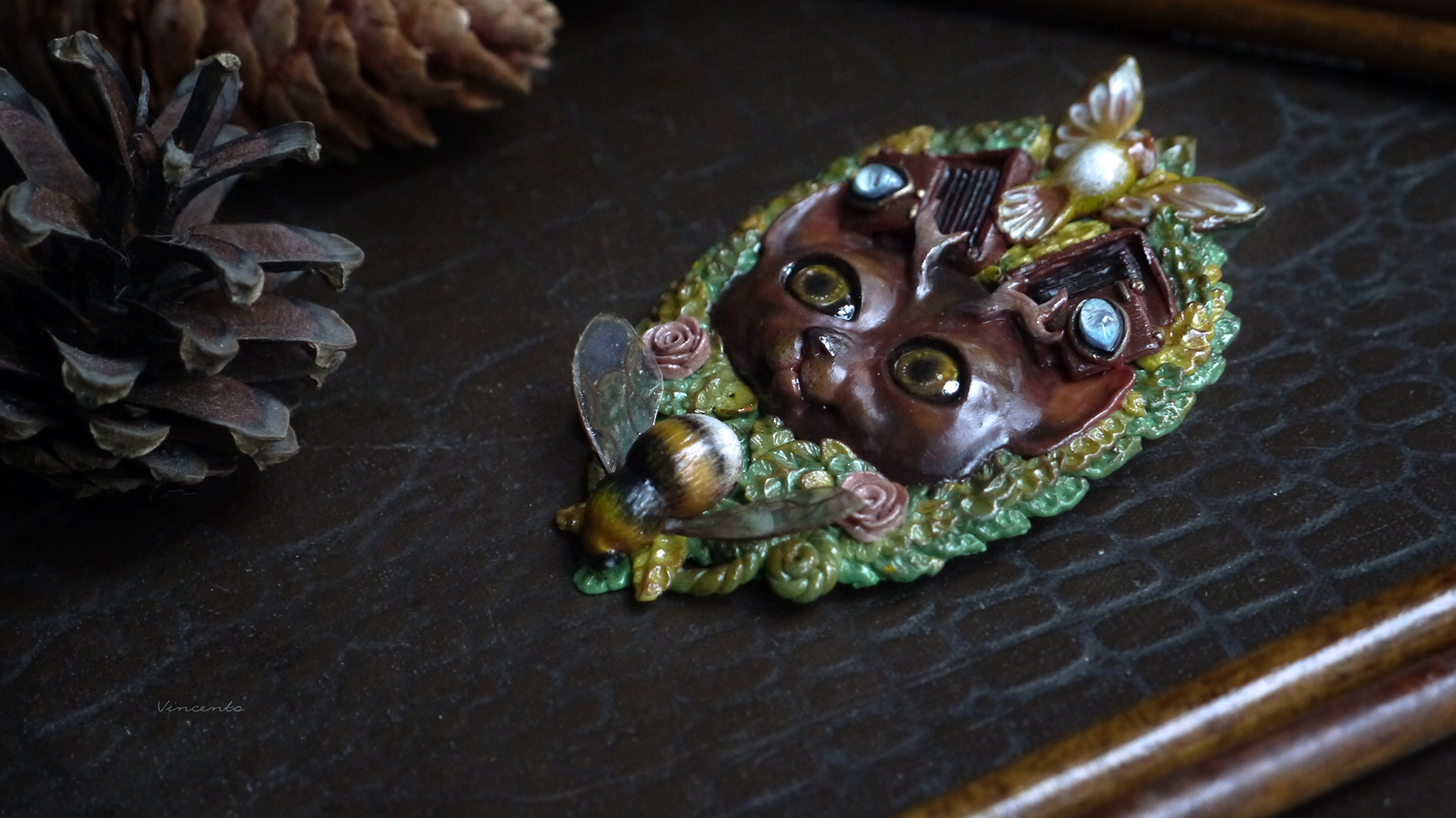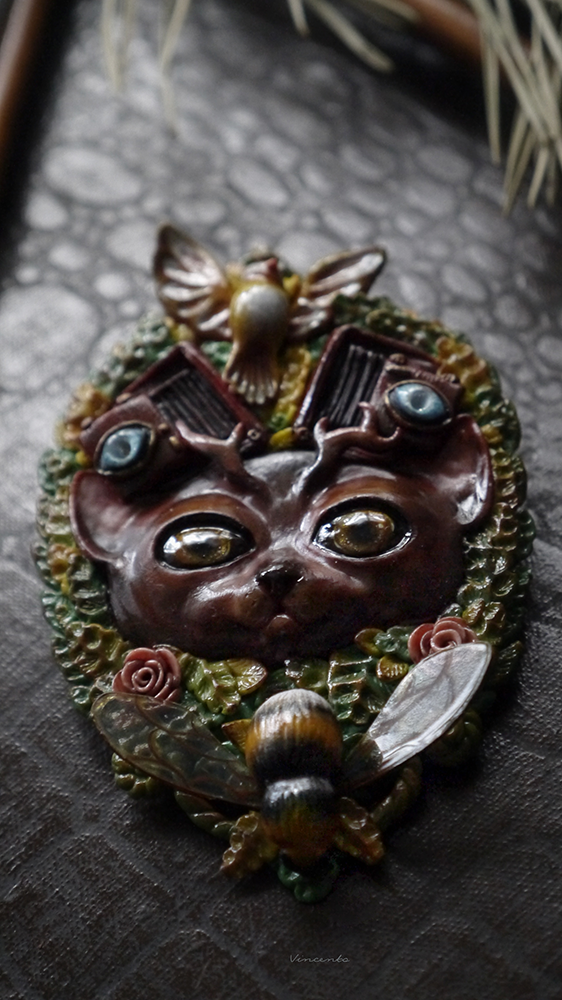 - В броши угадываются сразу несколько стилей: шмель, цветы и густые заросли кустарников - отголоски классического арт-нуво, кот же выполнен под влиянием стимпанка (именно поэтому он так напоминает ожившее творение какого-то гениального изобретателя).