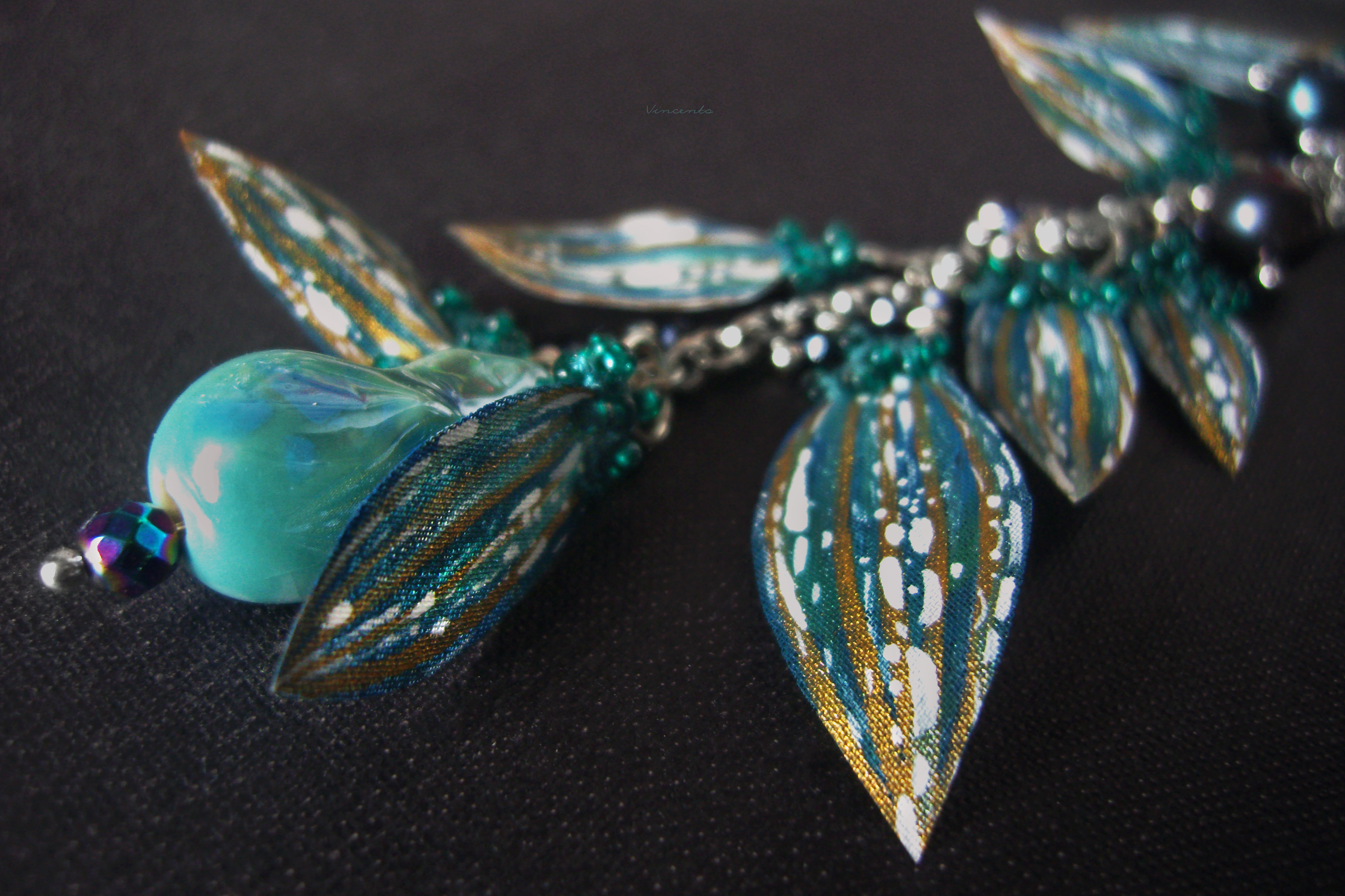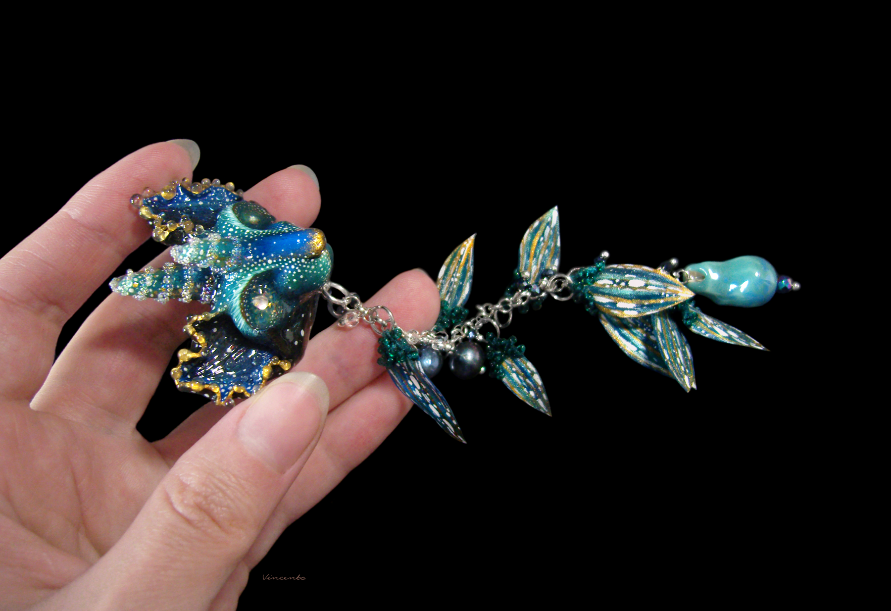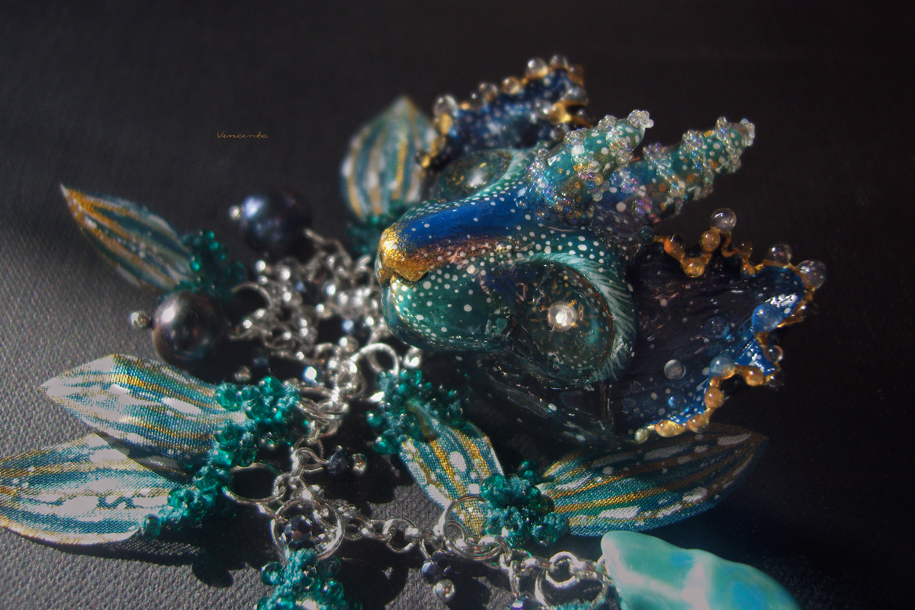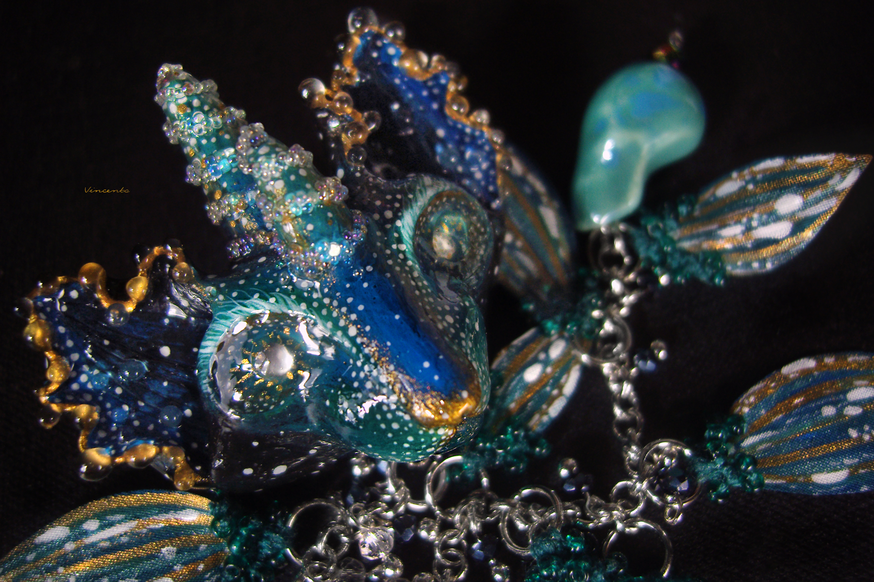 - Центральный элемент украшения — фигурка в виде лика глубоководного существа, древнего кота-дракона с белыми искрами в глазах (они сделаны на базе стекловидной массы, пигментов, акриловых кристаллов) и двумя остроконечными рогами с витыми узорами, будто бы выложенными крупицами радужного песка (микробисер "mystique") с самого дна океана... Его ушки усыпаны прозрачными каплями, словно холодными брызгами солёных волн...
