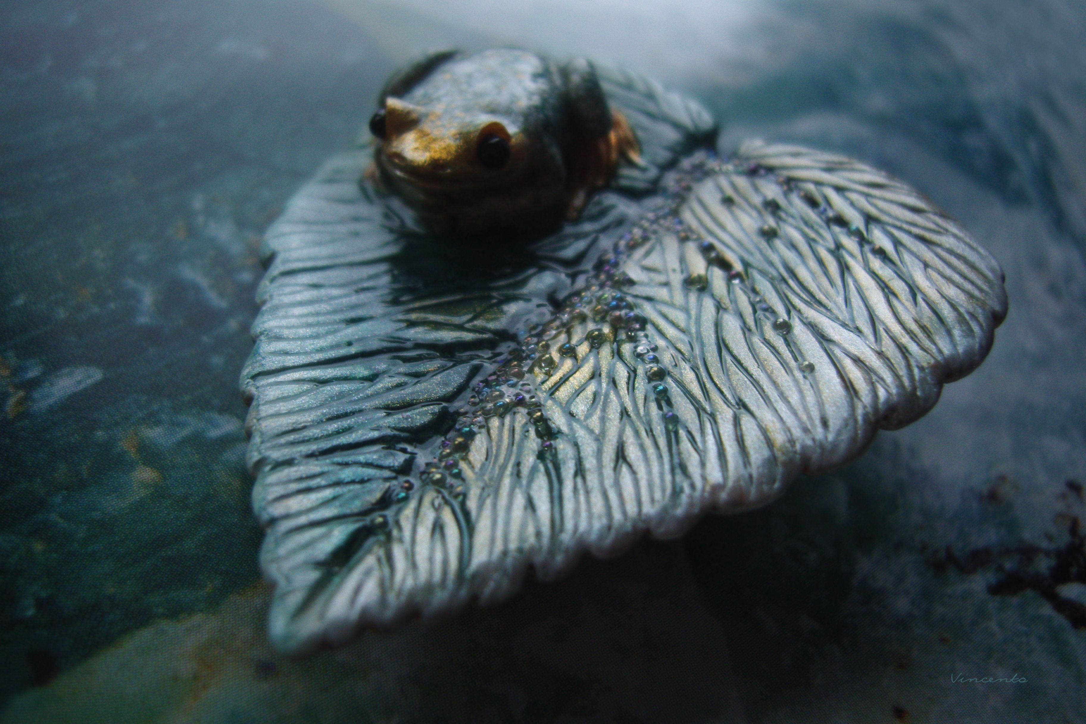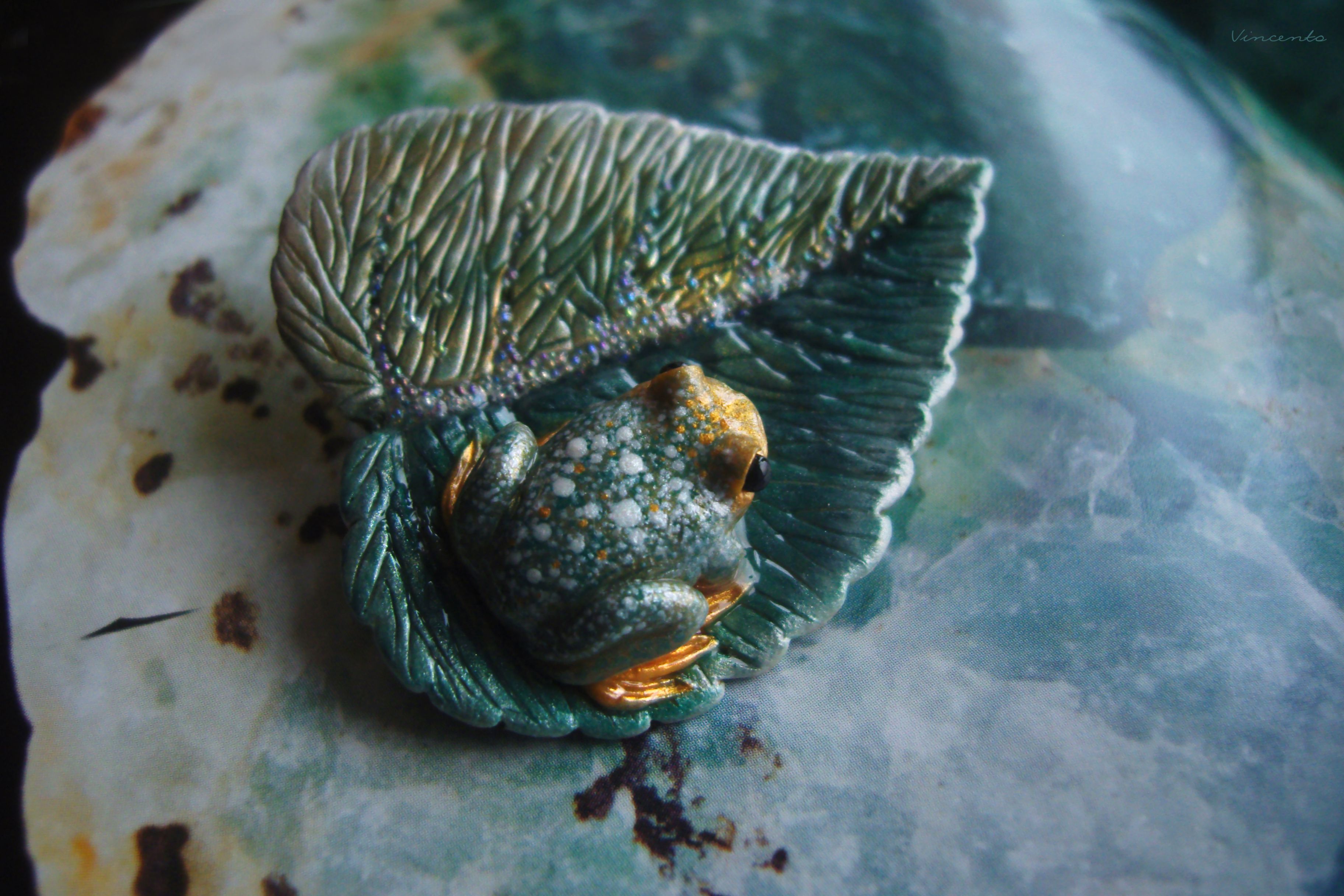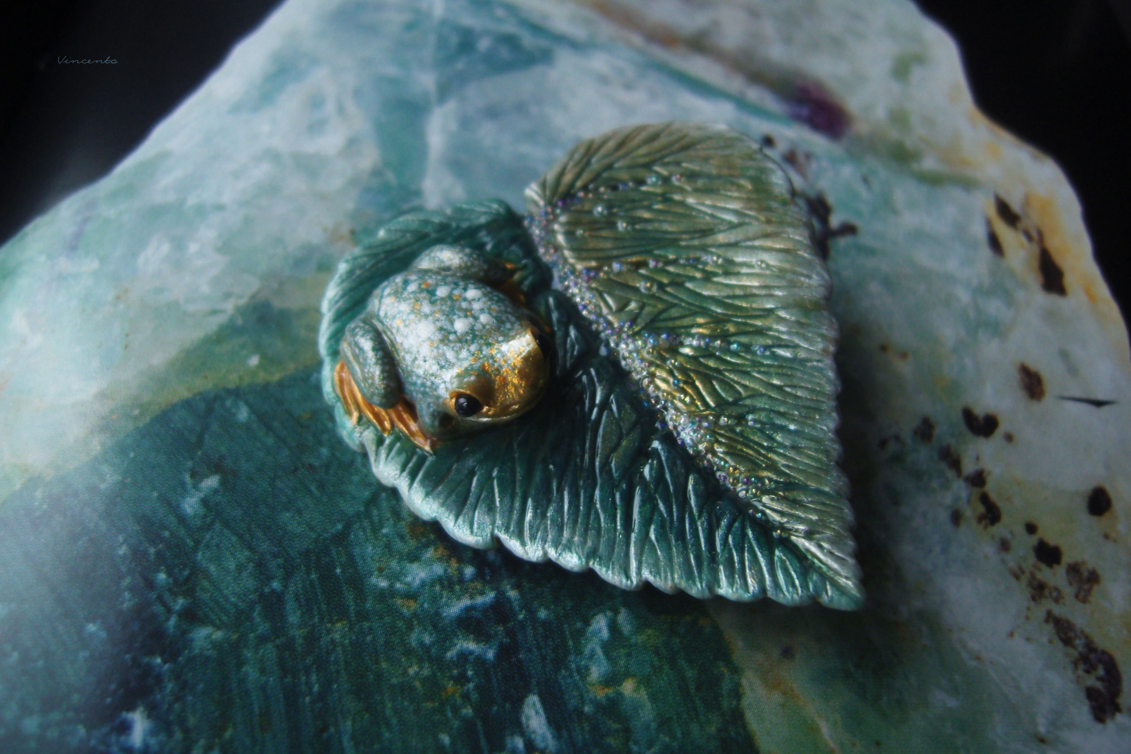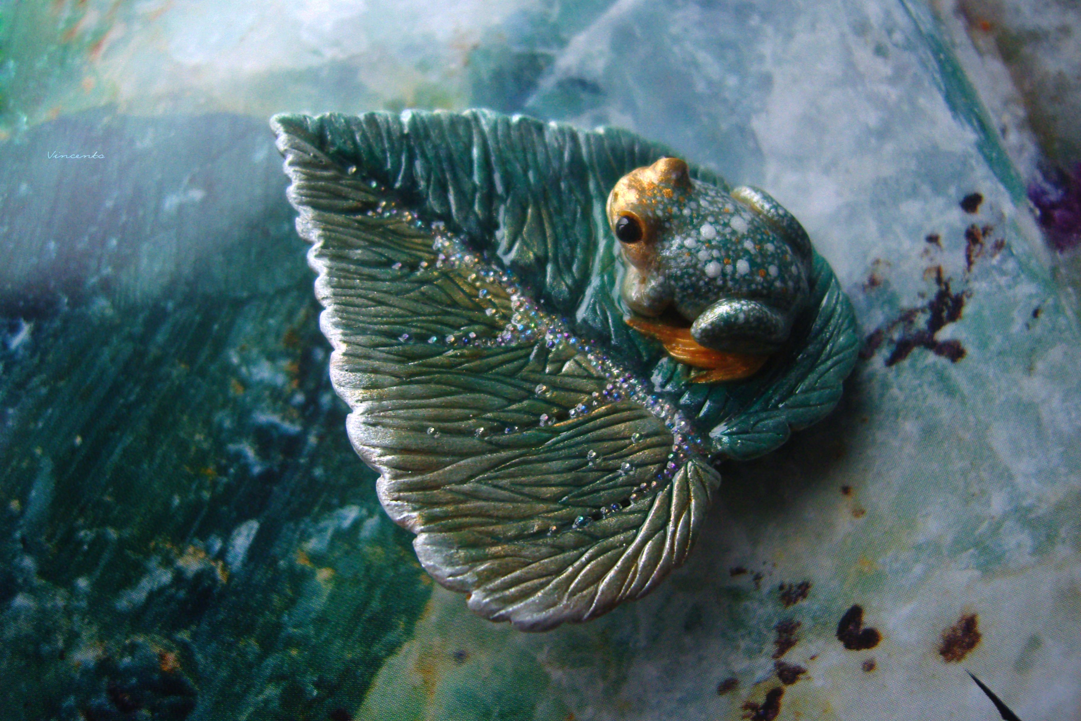 - Изумрудно-золотая брошь в виде принцессы-лягушки на изящном фэнтезийном листе, стремящемся прямо в сердце Сентября, на окраину осеннего королевства...