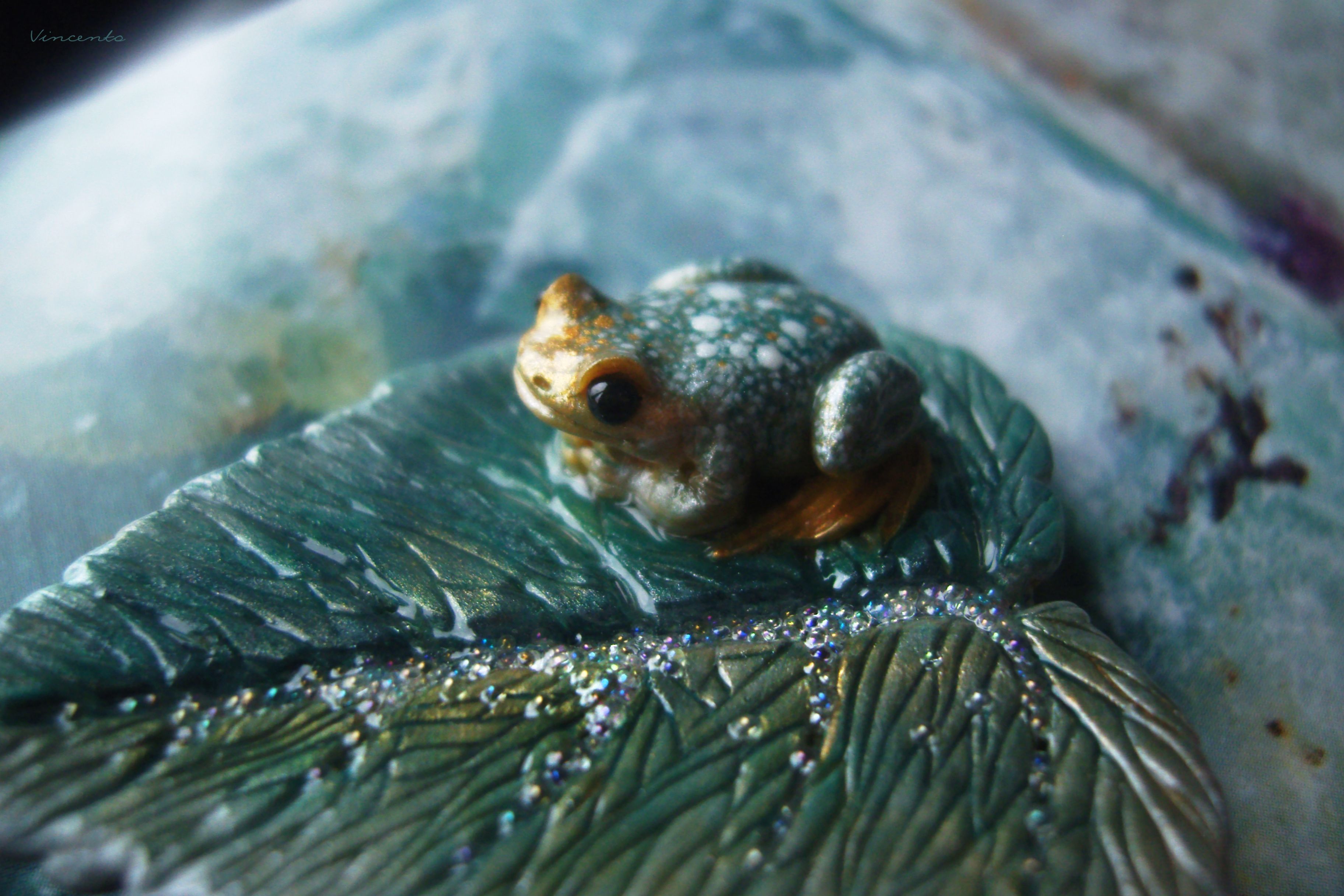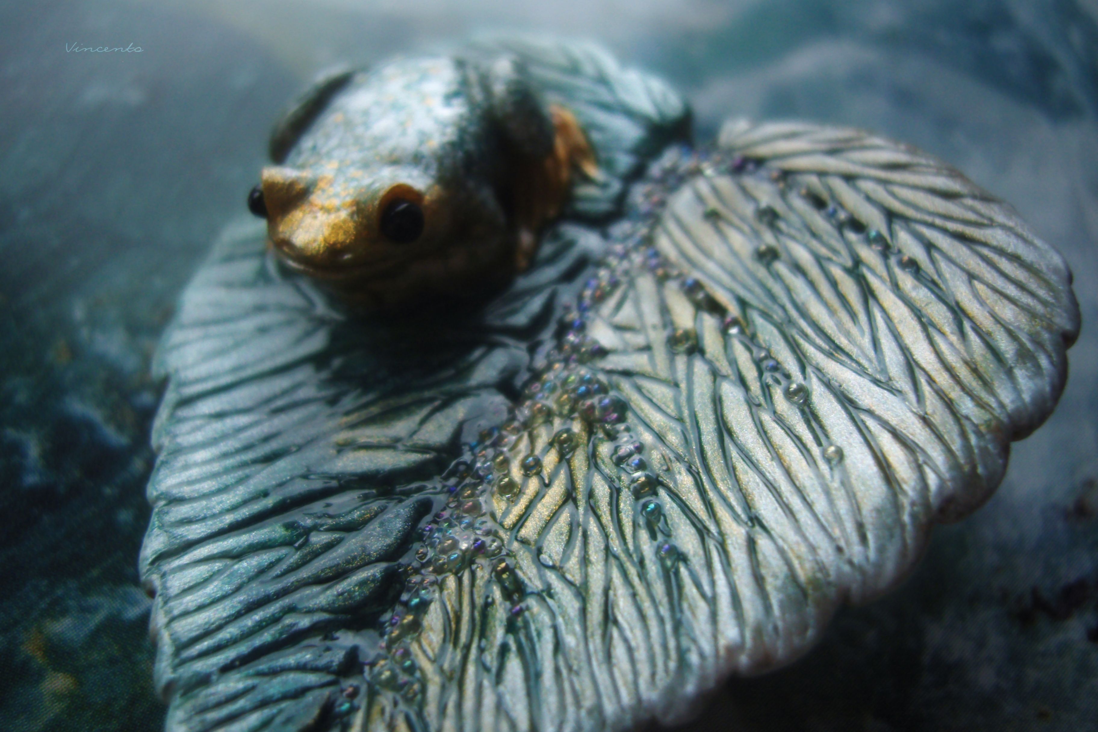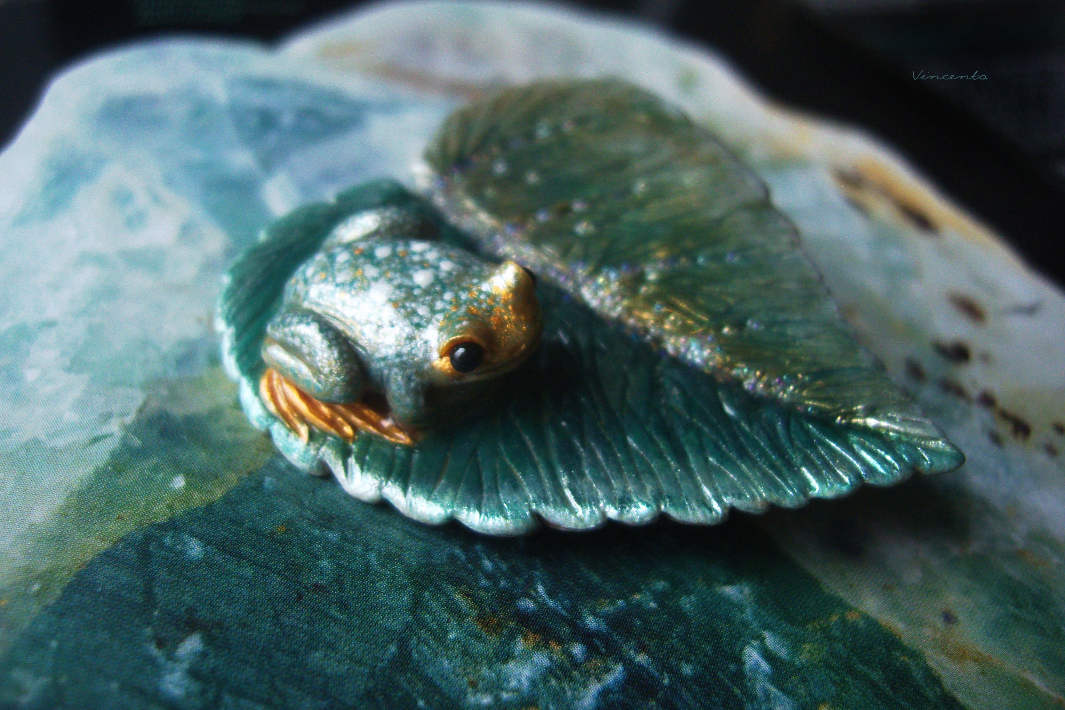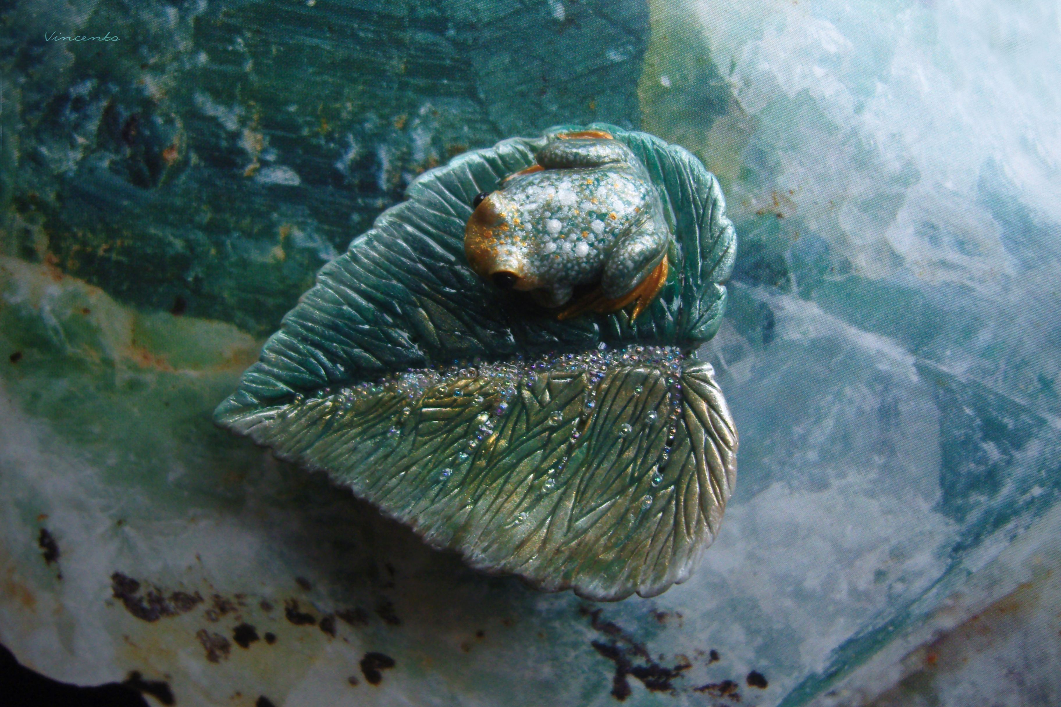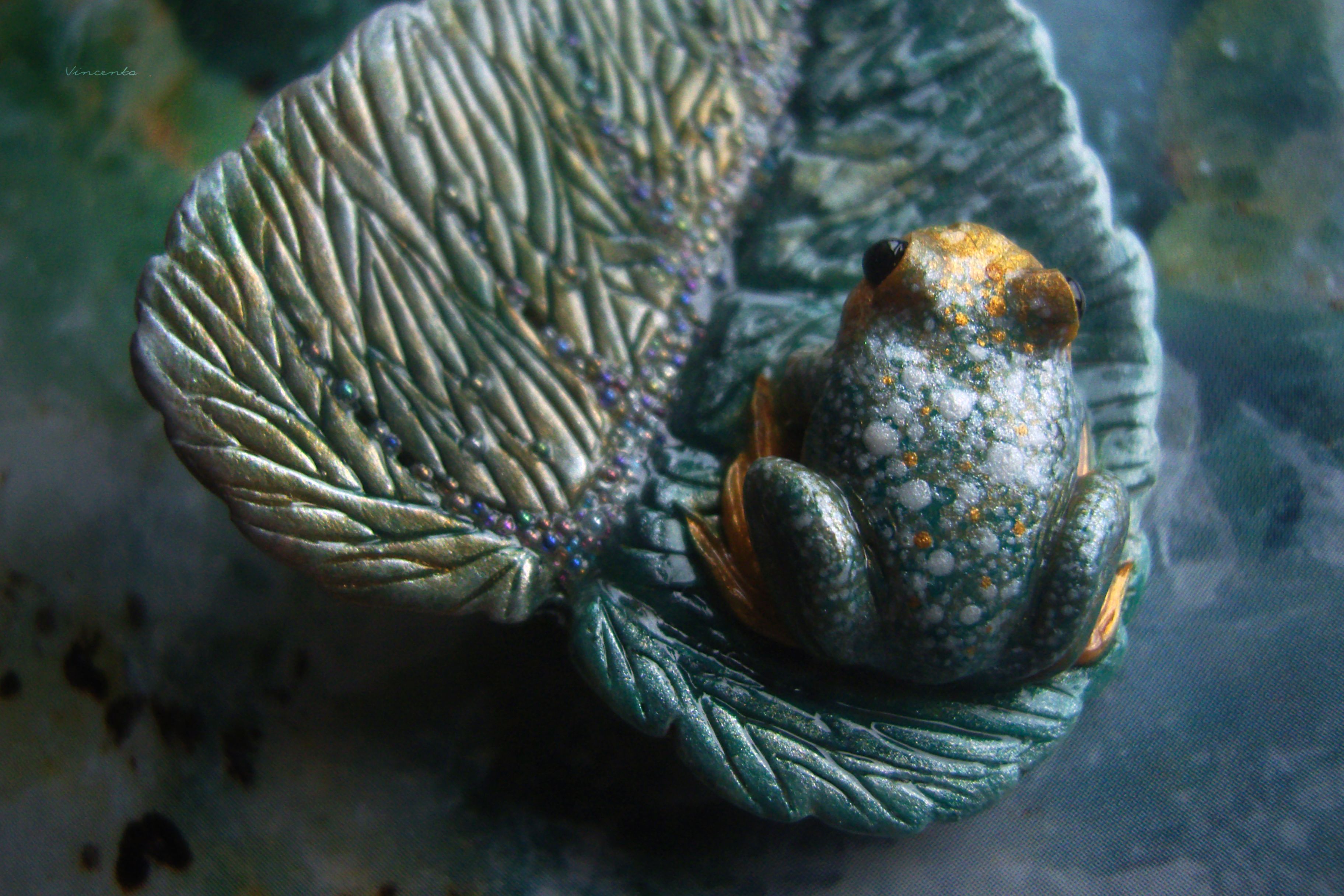 - Изумрудно-золотая брошь в виде принцессы-лягушки на изящном фэнтезийном листе, стремящемся прямо в сердце Сентября, на окраину осеннего королевства...