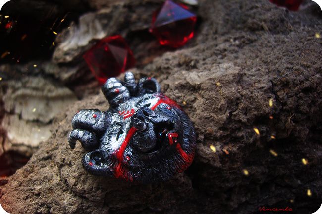 - Брошь выполнена полностью вручную в смешанной технике на основе термоглины и папье-маше, без использования штампов, молдов и каких-либо шаблонов. Расписана и тонирована светоустойчивыми красками в оттенках тлеющего уголька (чёрный, мерцающий тон словно припорошен светло-серым пеплом, а огненные всполохи рисуют раскалённые, ярко-алые магические символы).