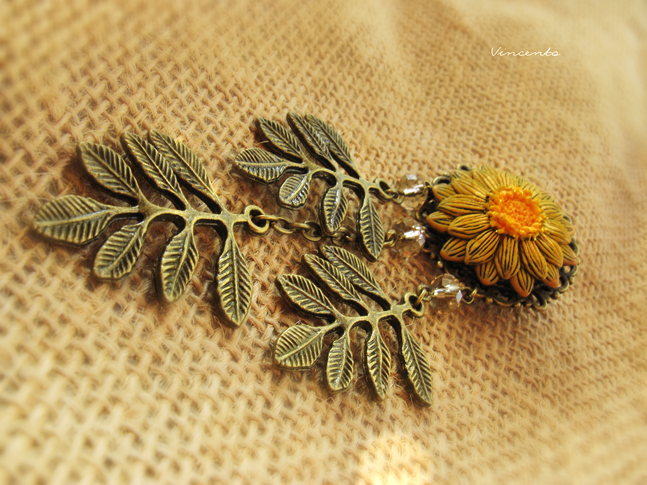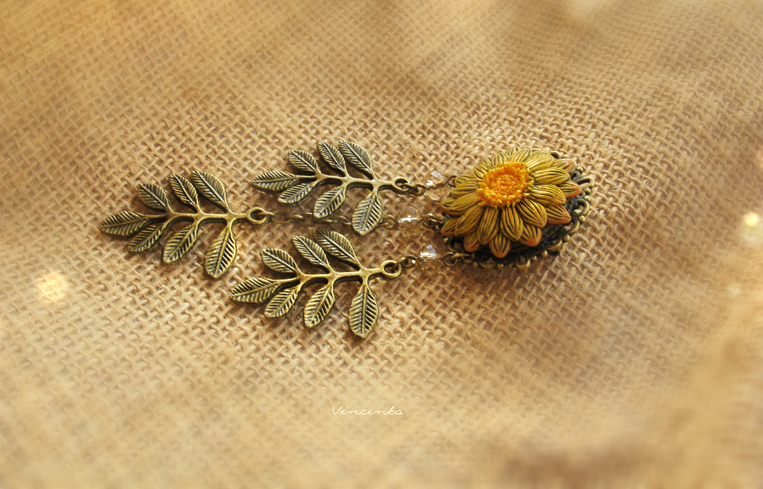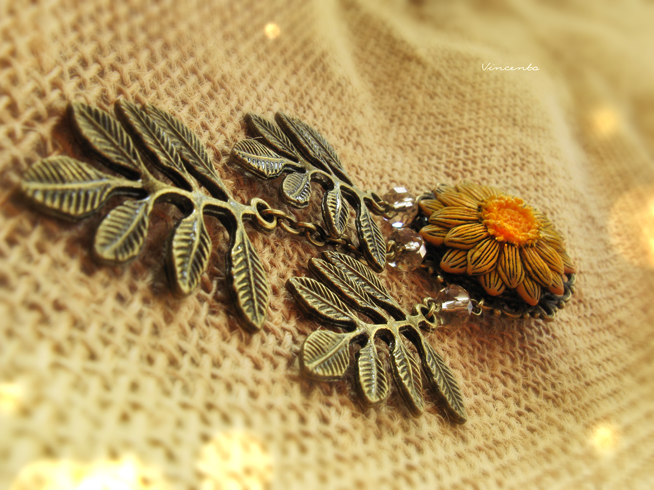 - Оригинальная брошь в стиле кантри в виде солнечно-жёлтого цветка с подвесками-листьями и мерцающими хрустальными бусинами.