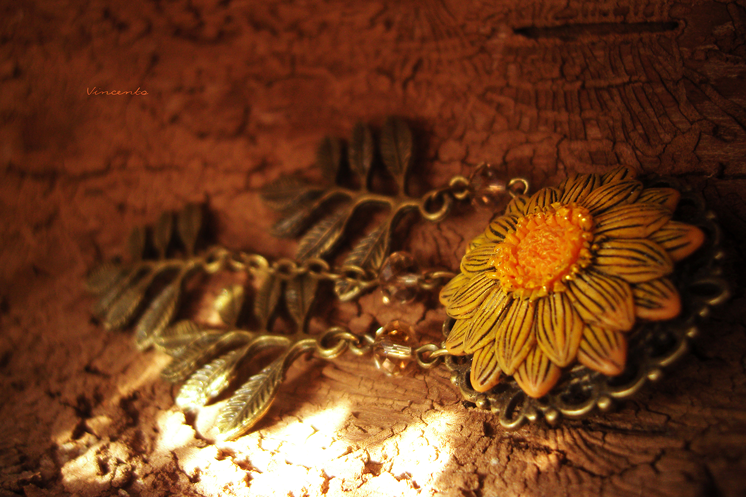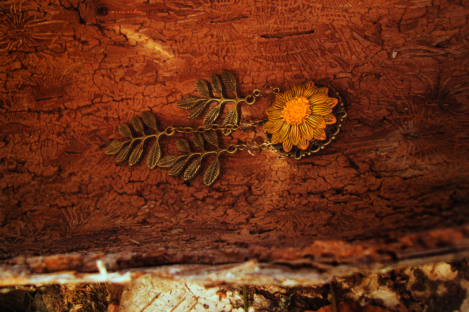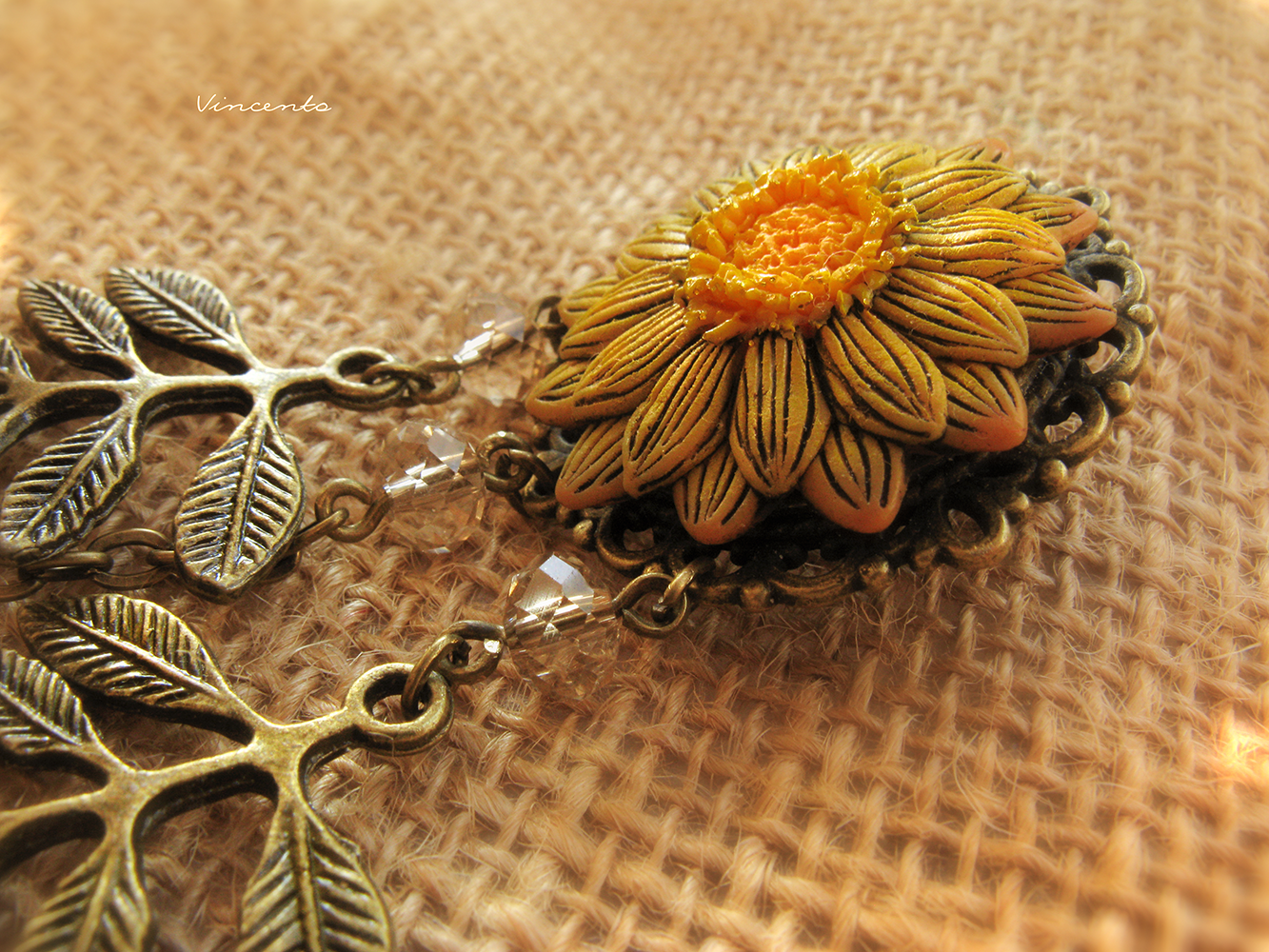 - Оригинальная брошь в стиле кантри в виде солнечно-жёлтого цветка с подвесками-листьями и мерцающими хрустальными бусинами.
