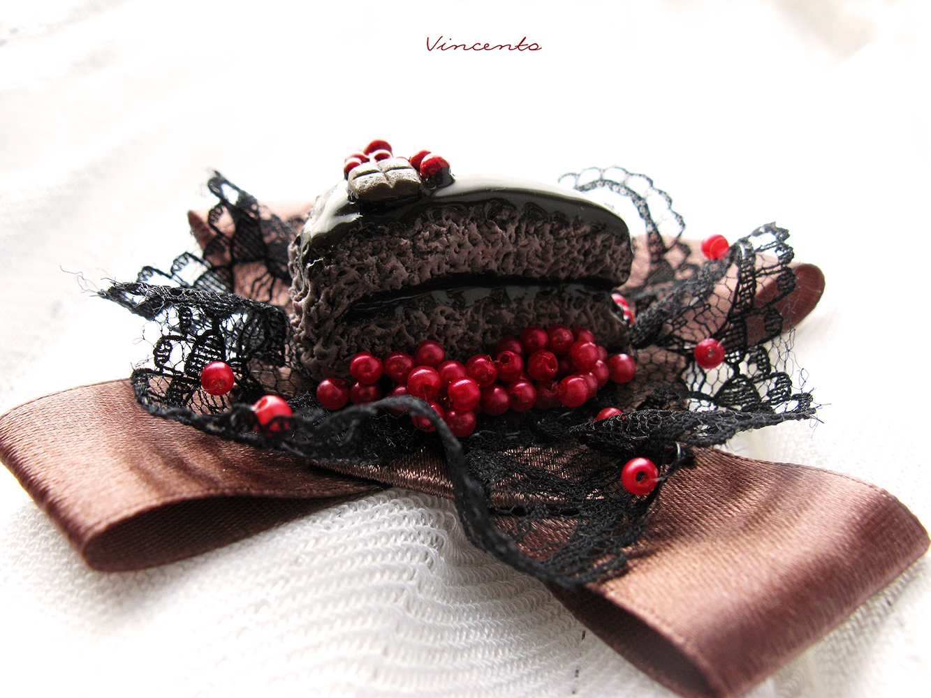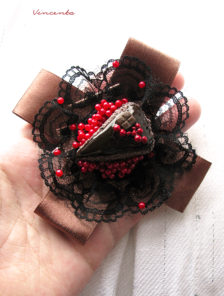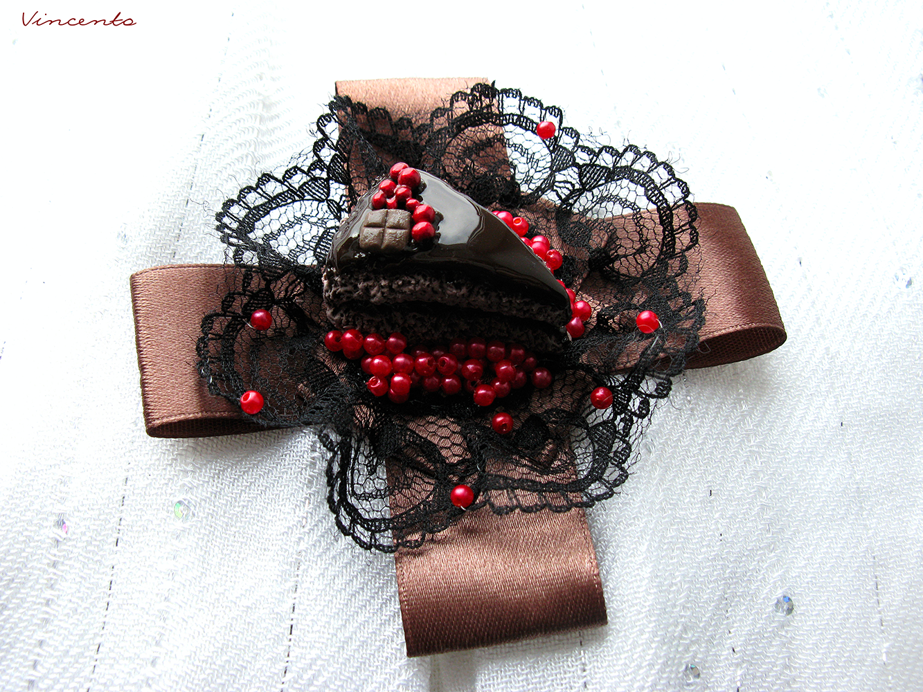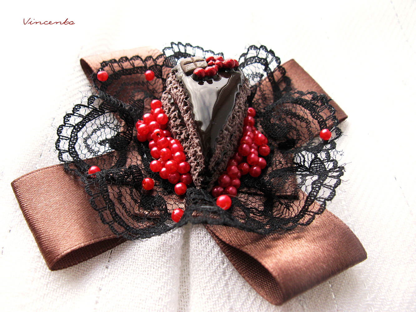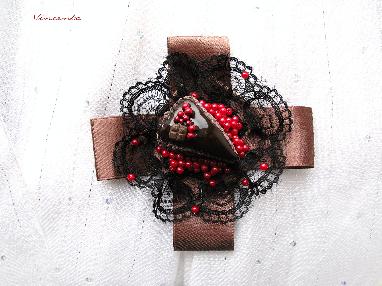 - Поклонницам шоколада и всяческих шоколадных вкусностей обязательно понравится необычная брошь в виде аппетитного кусочка шоколадного торта, украшенного красными ягодами и плиткой шоколадки!.. Так и хочется потихоньку лизнуть этот вкусный густой шоколадный крем, покрывающий бисквит...