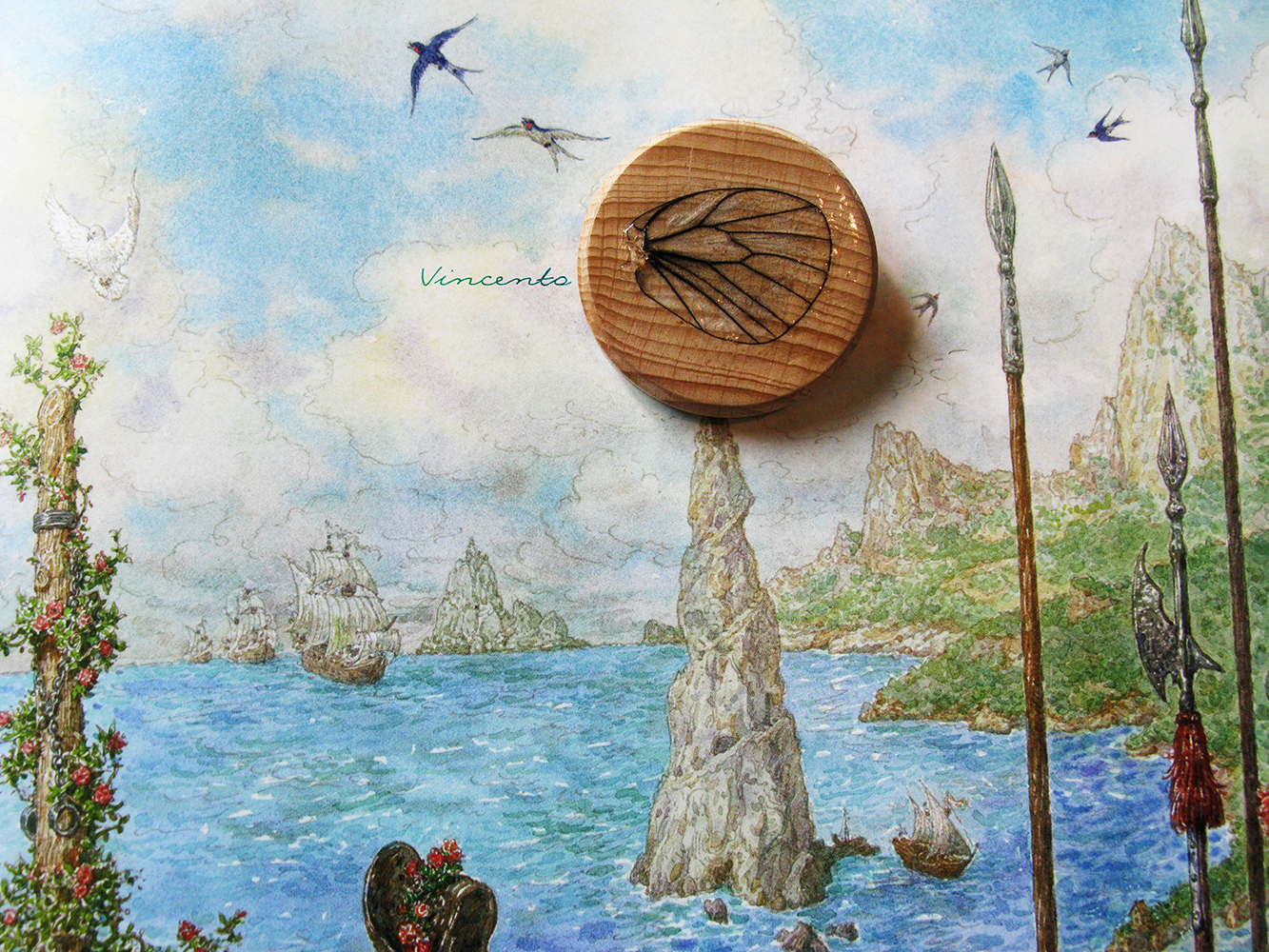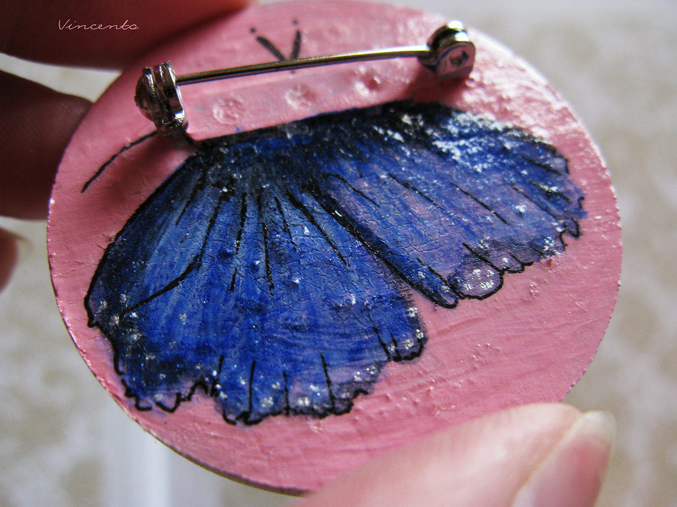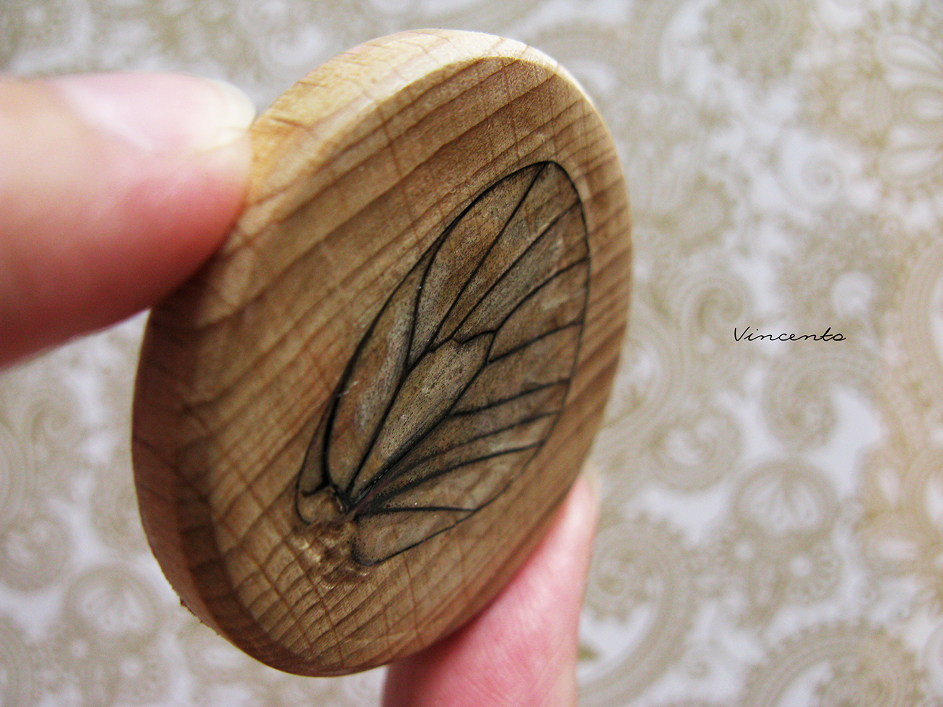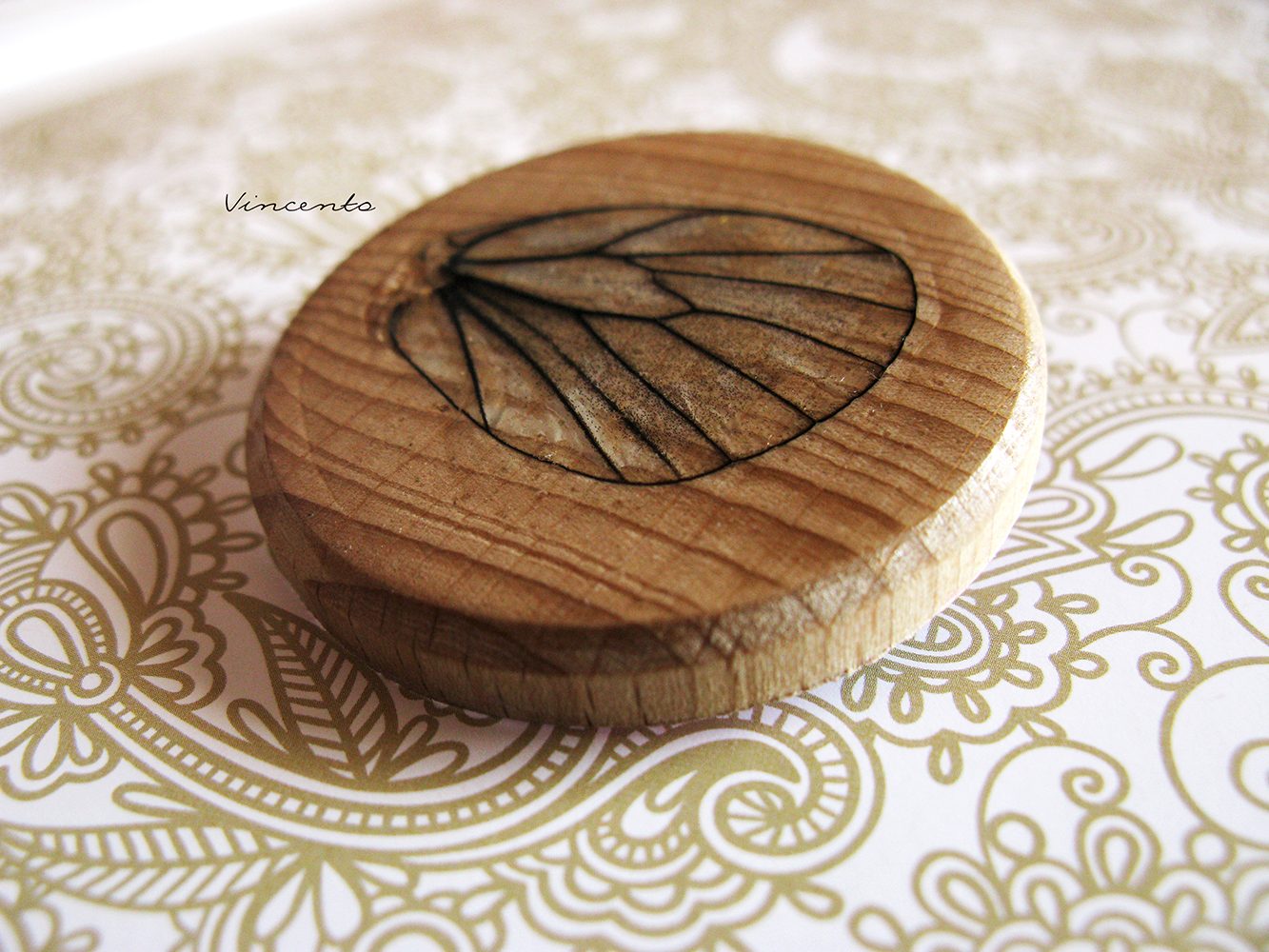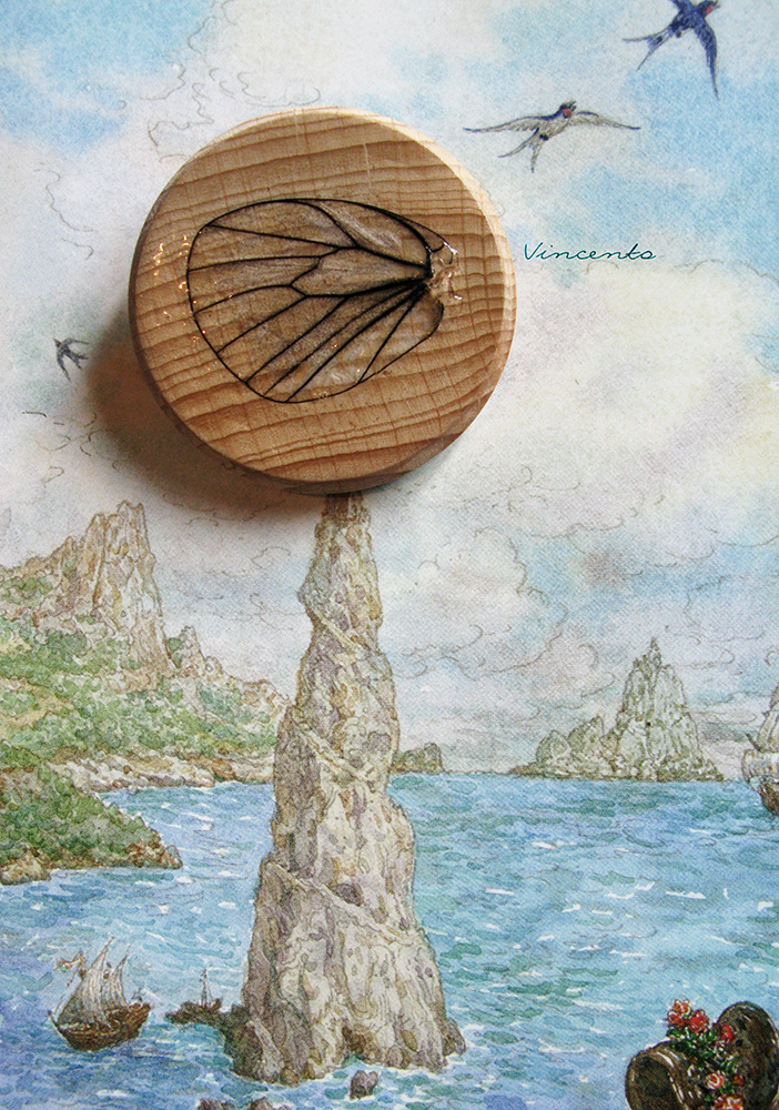 - Материалы: бук, крыло бабочки, стекловидная масса, лак на водной основе, металлическая фурнитура, акриловые краски. Размер - 4,3 см.
