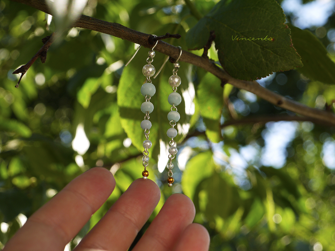 - Длинные, нежные серьги с молочно-голубым кошачьим камнем и бусинками жемчуга.