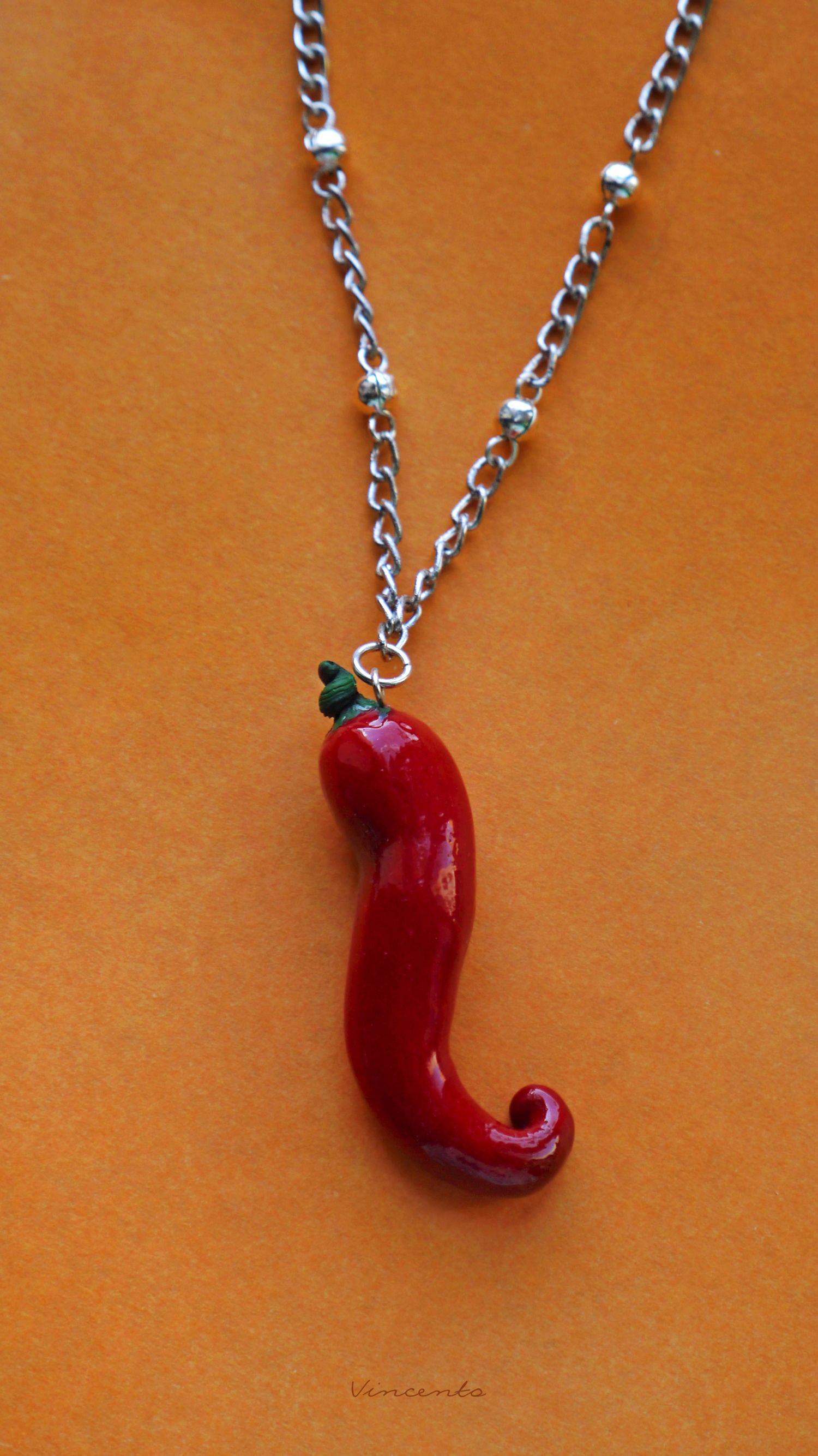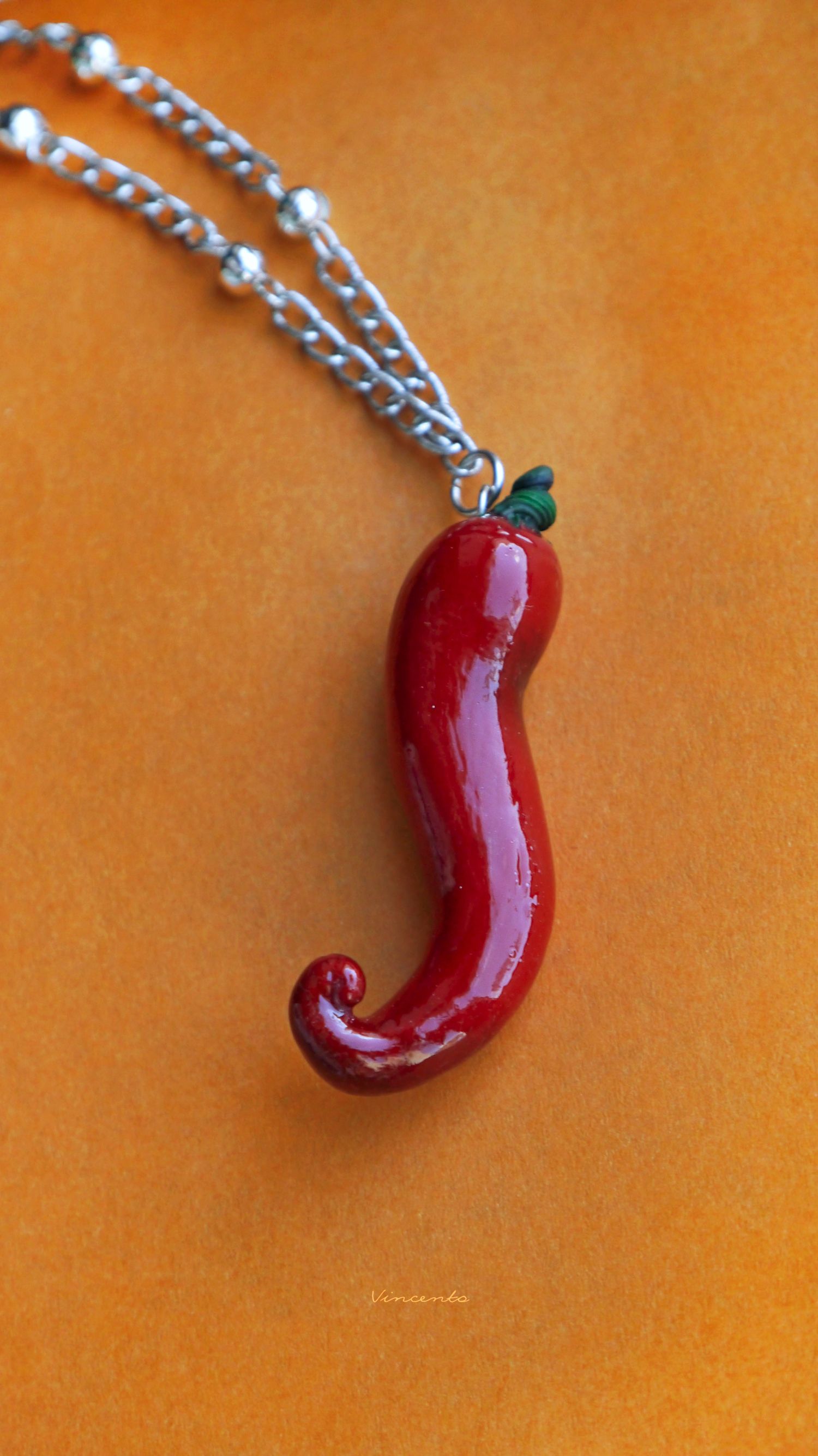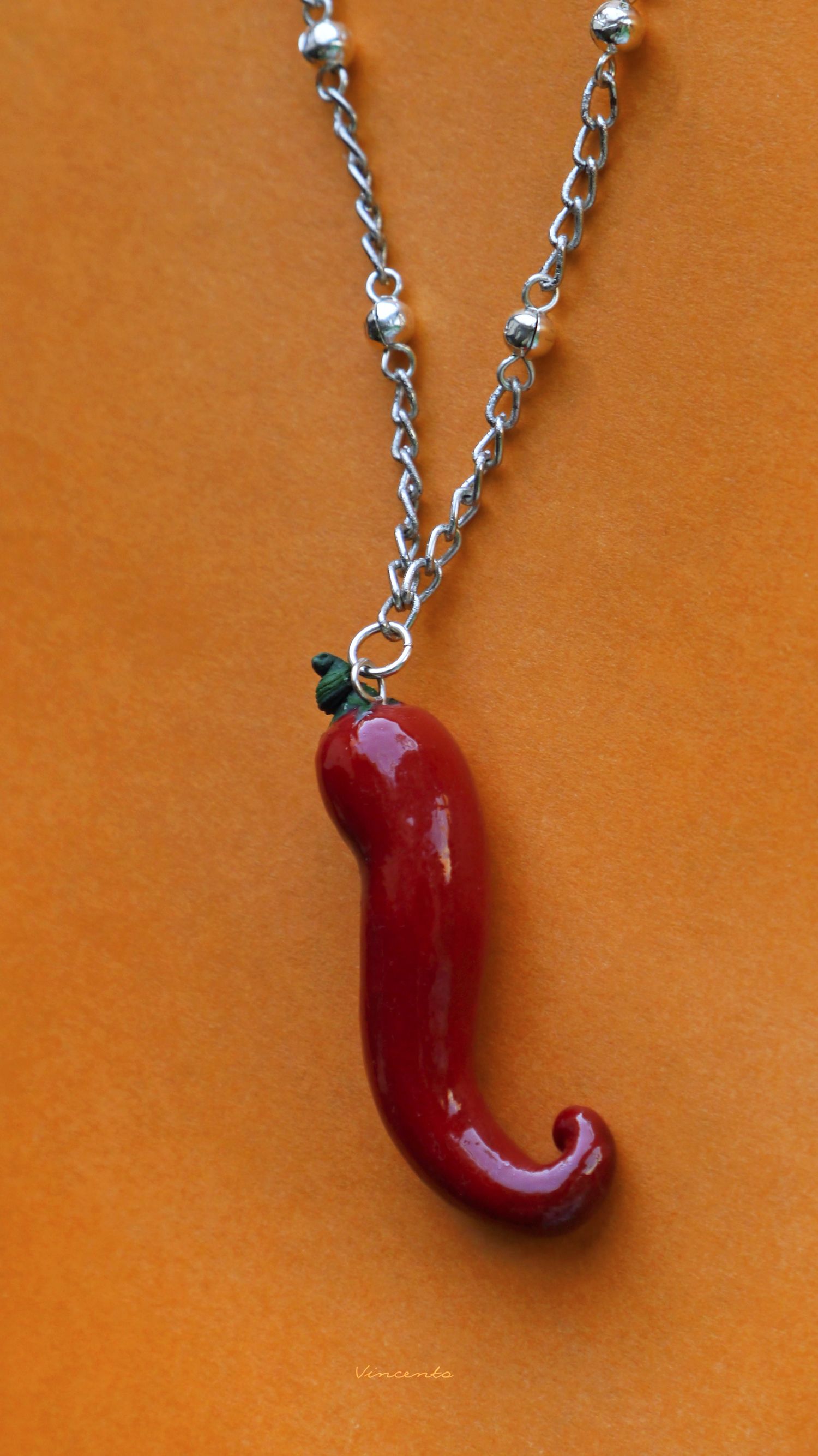 - Миниатюрный кулончик в виде пикантного, ярко-алого перца чили с закрученным кончиком и зелёным черенком.