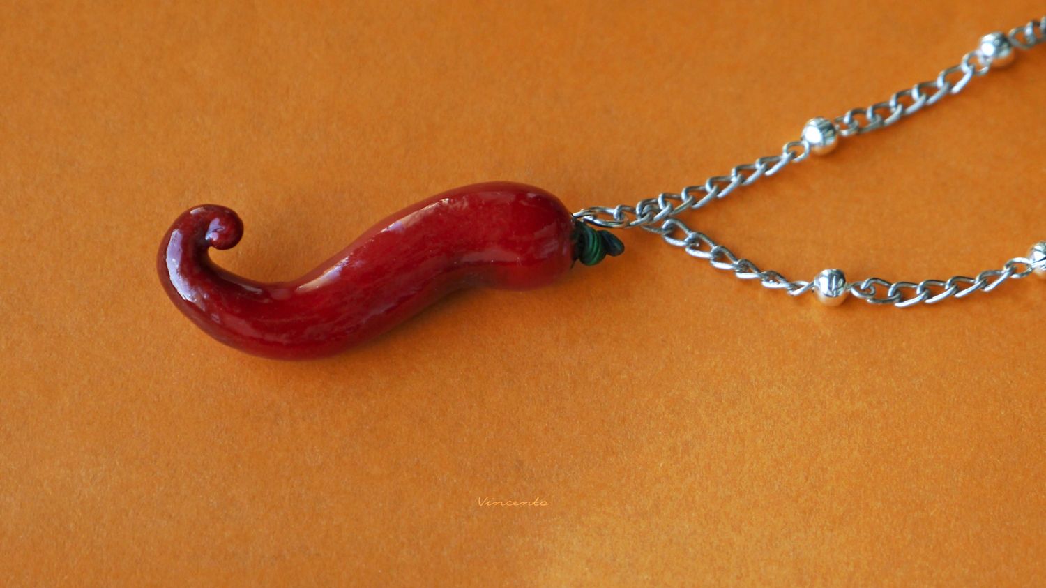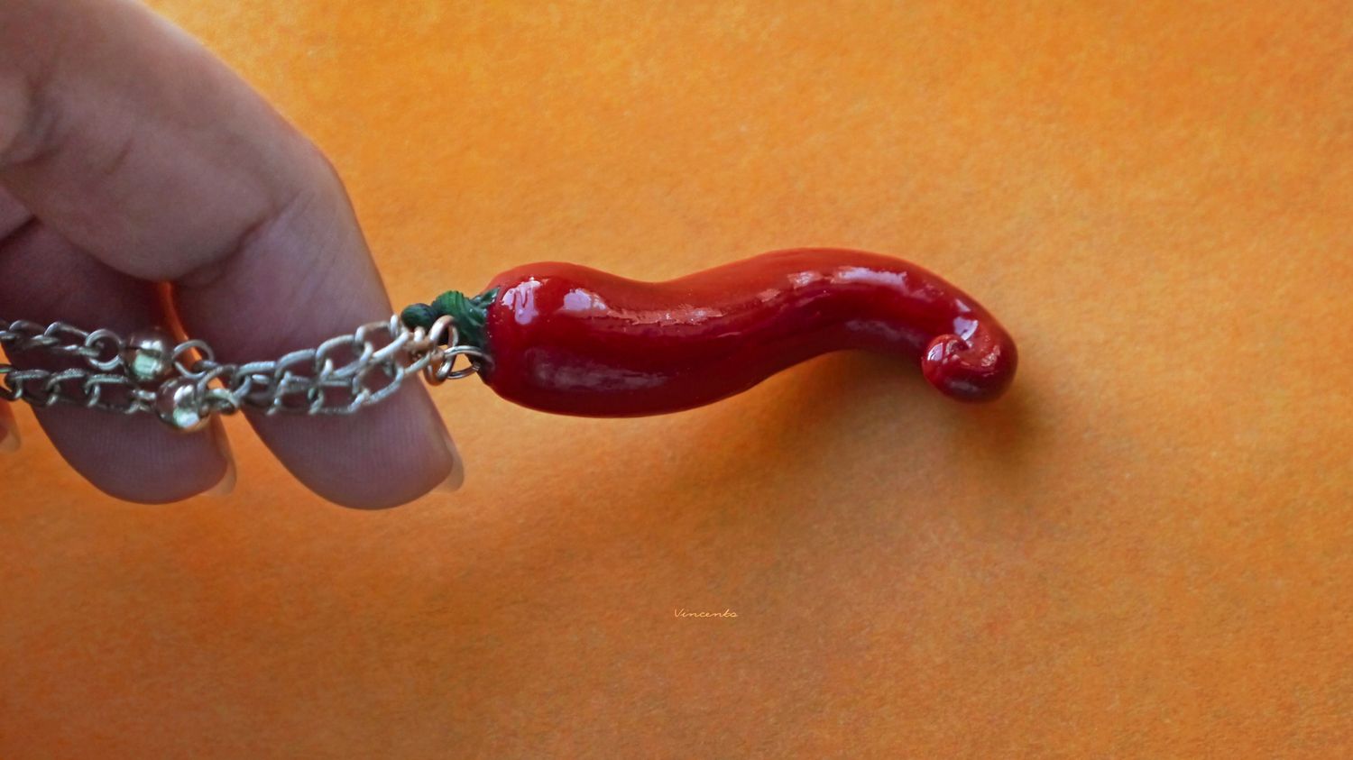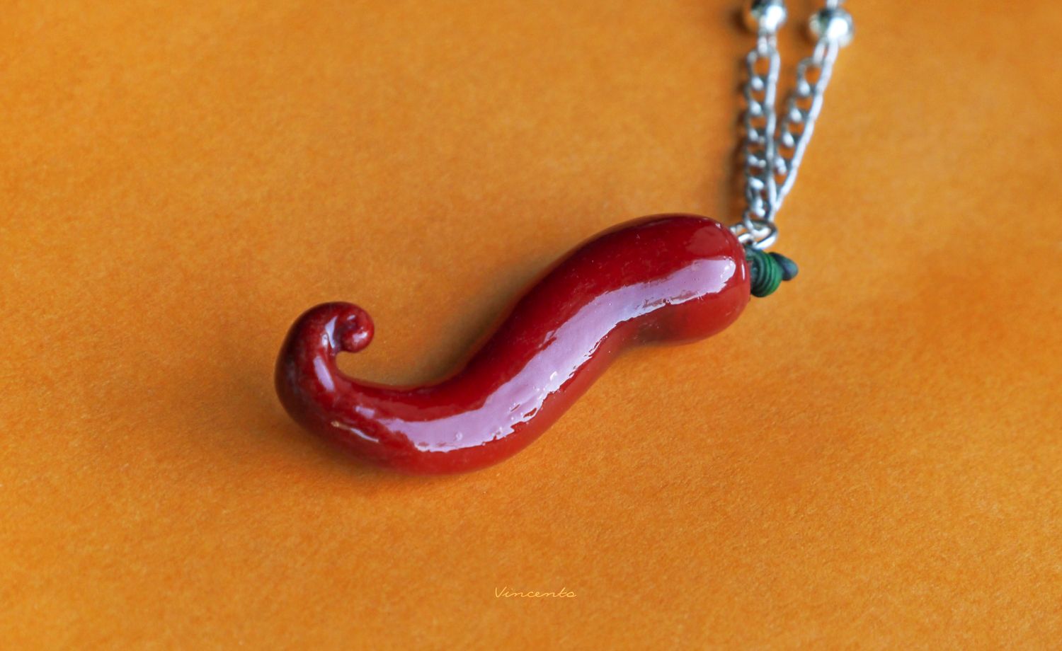 - Миниатюрный кулончик в виде пикантного, ярко-алого перца чили с закрученным кончиком и зелёным черенком.