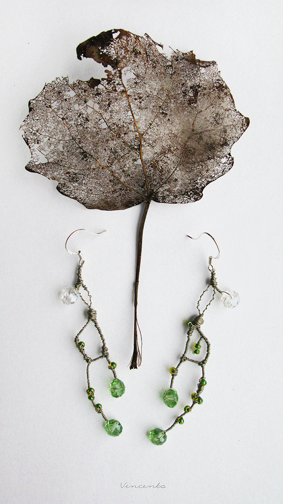- Плетёные серьги в эльфийском стиле "Капли утренней росы" из мягкой металлической проволоки (можно при желании корректировать форму), с хрустальными нежно-салатовыми и прозрачными бусинами и зелёным с глубоким золотистым отливом чешским бисером. Длина с замочком - около 8 см.