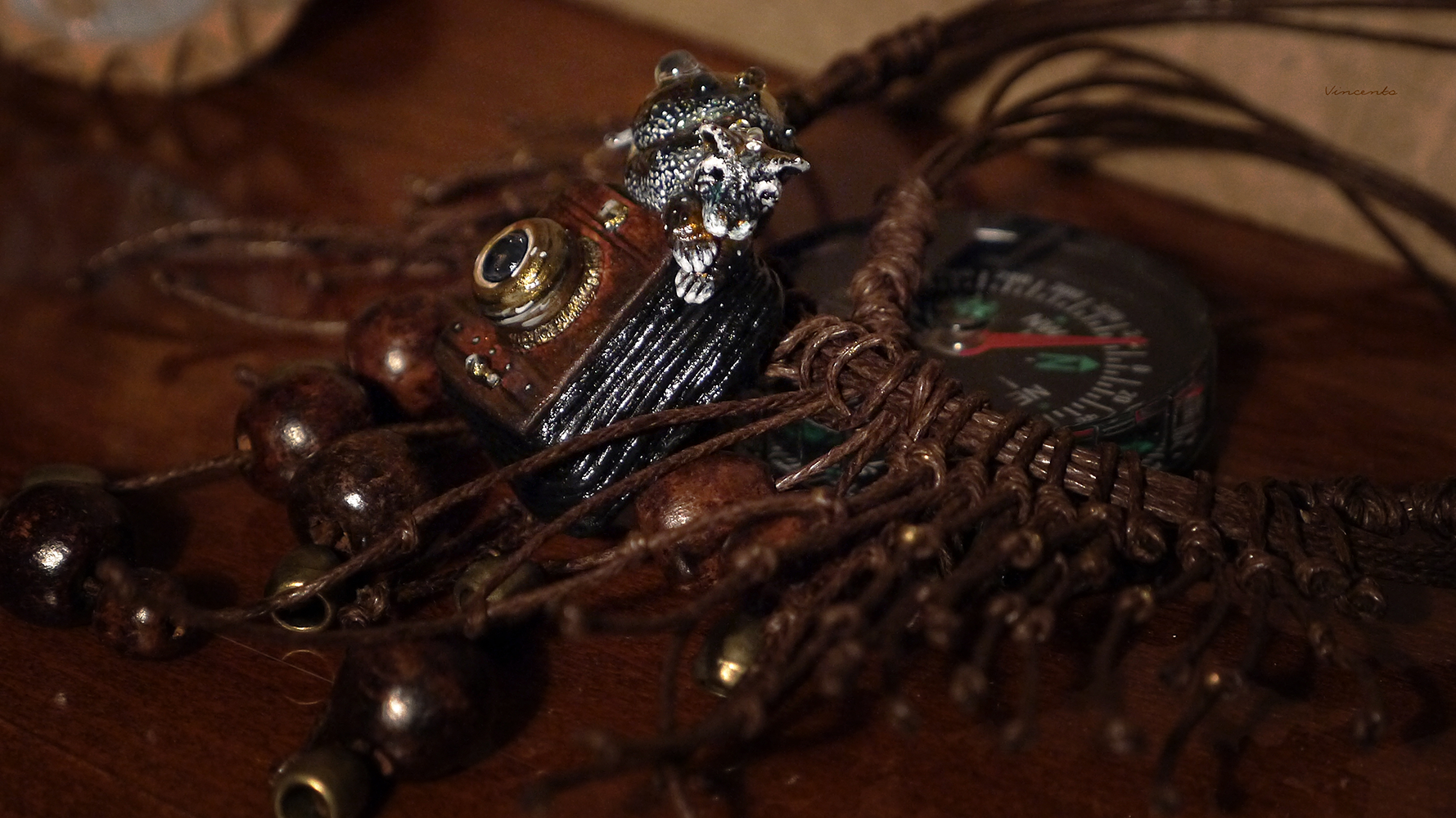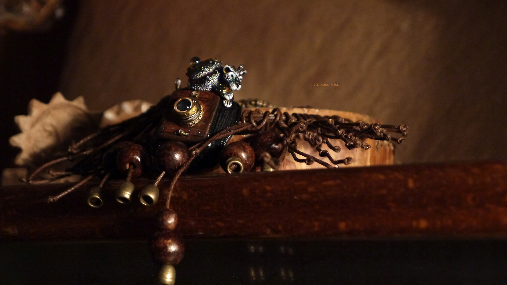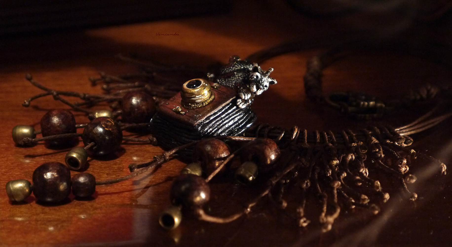 - Фотоаппарат подвешен на колье, сплетённое из вощёных шнуров и имитирующее веточки дерева. Все такие "веточки" подвижно закреплены, что позволяет менять расстояние между ними и создавать множество различных образов!