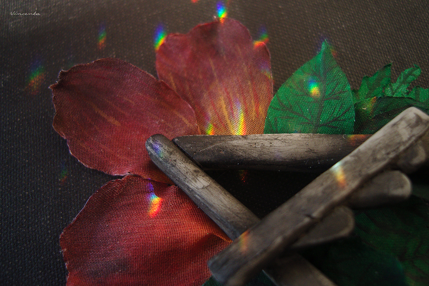 - Здесь символически переплетаются формы и образы: обветшалые осколки древнего артефакта складываются в треугольник, символ единения времён и материй, а полупрозрачные лепестки чайной розы напоминают о хрупкости мира...