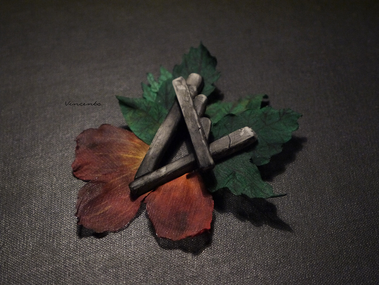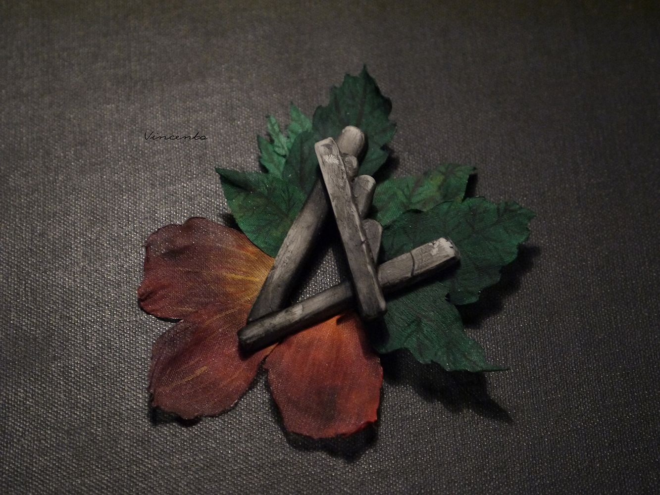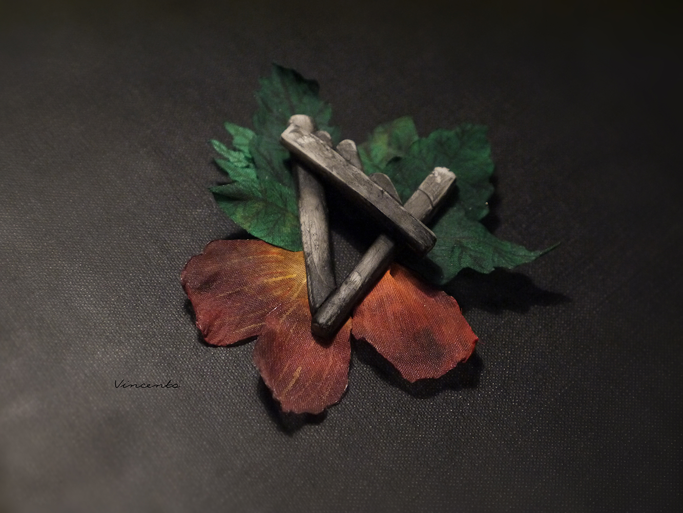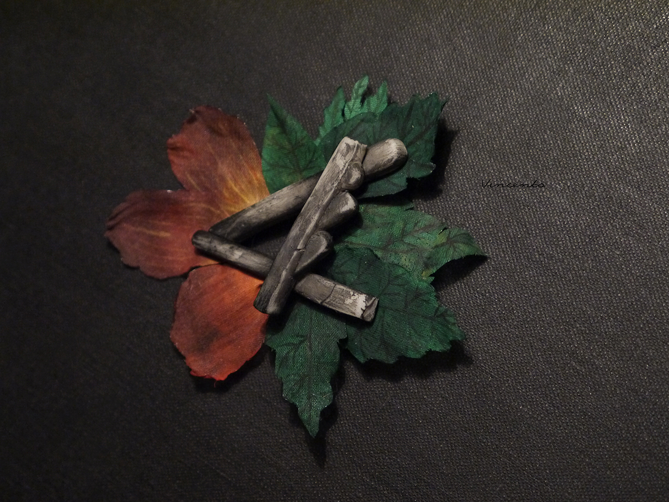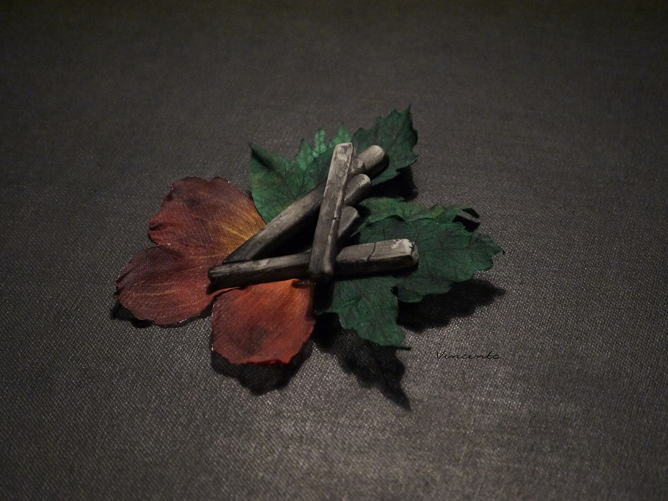 - Серые фрагменты артефакта выполнены без использования каких-либо штампов или молдов полностью вручную, а лепестки и листья розы - из расписанного вручную шёлка.