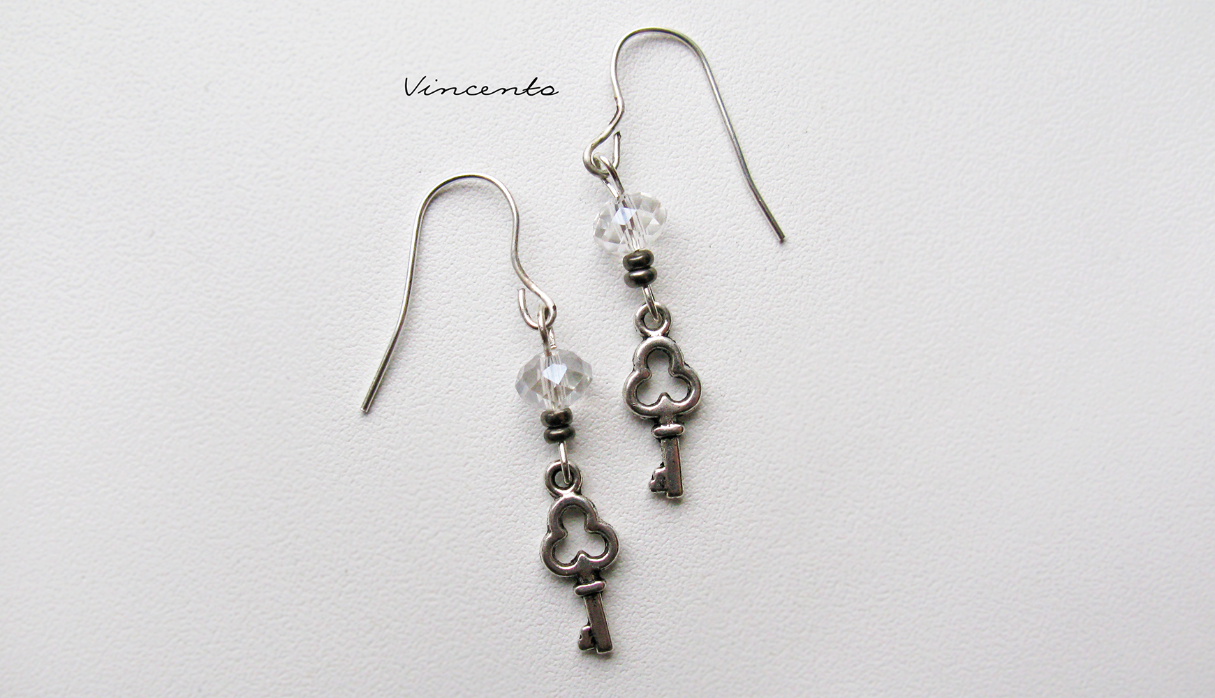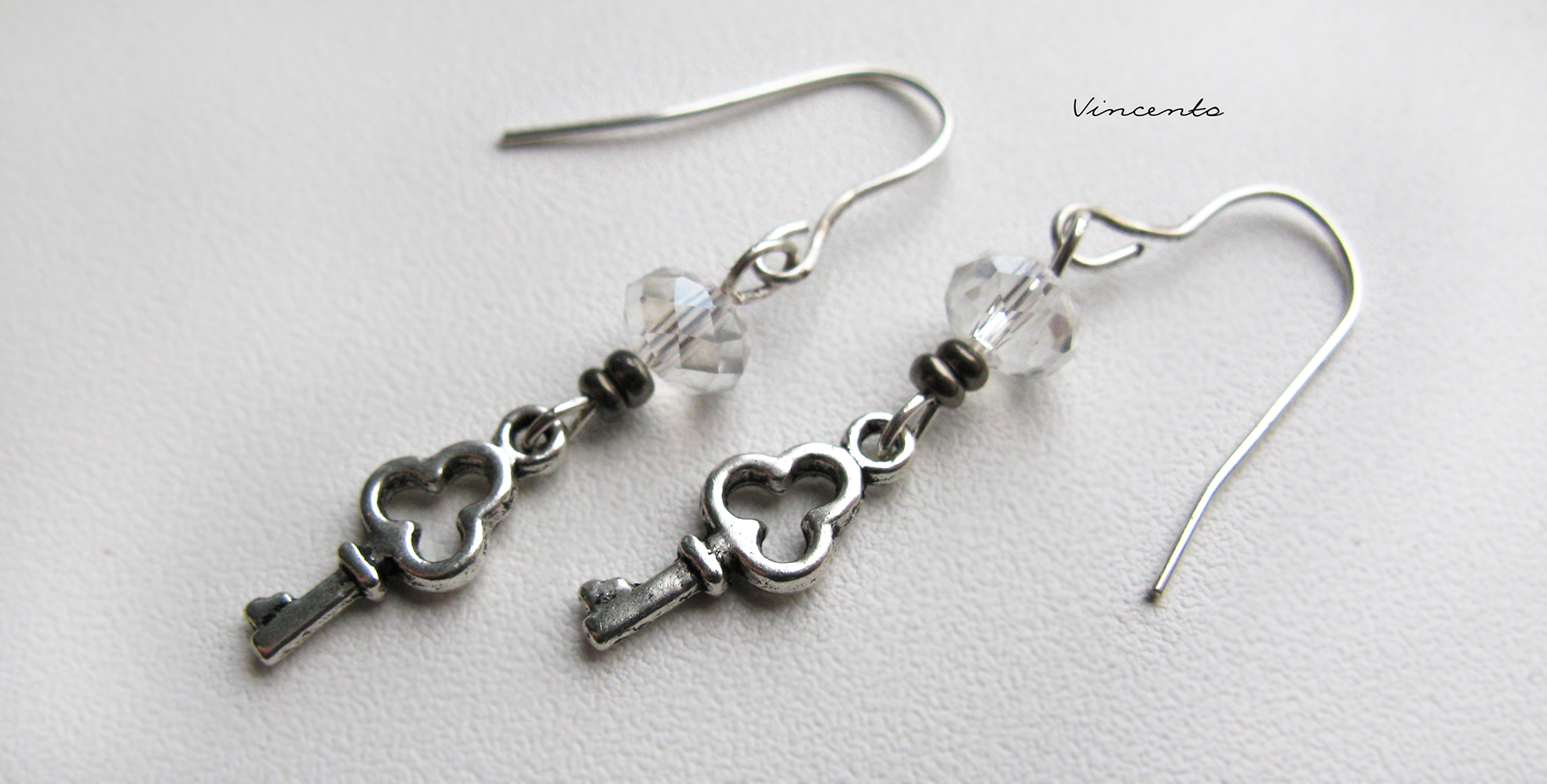 - Аккуратные, маленькие серьги-ключики с бисером (цвет - имитация гематита) и прозрачными хрустальными бусинами. Металлический замочек. Длина - около 4 см.