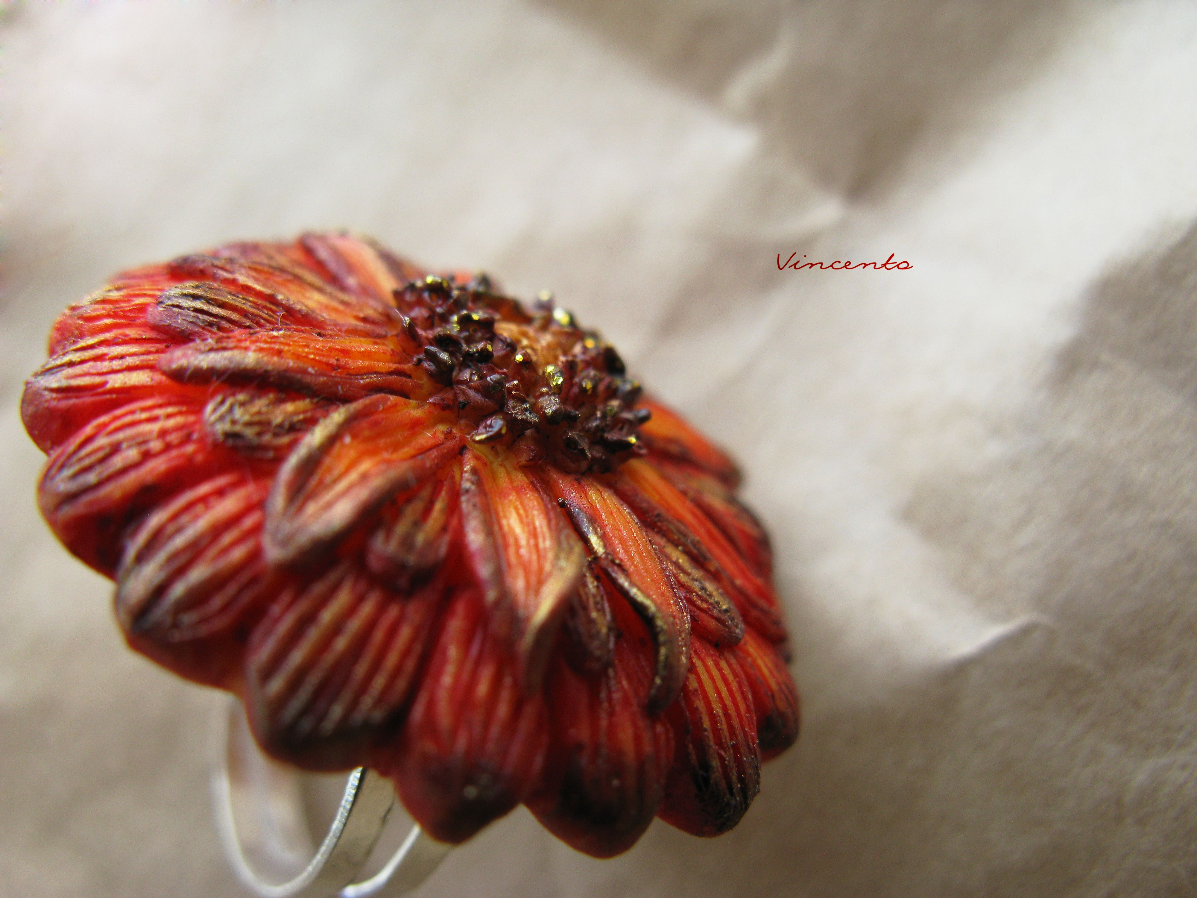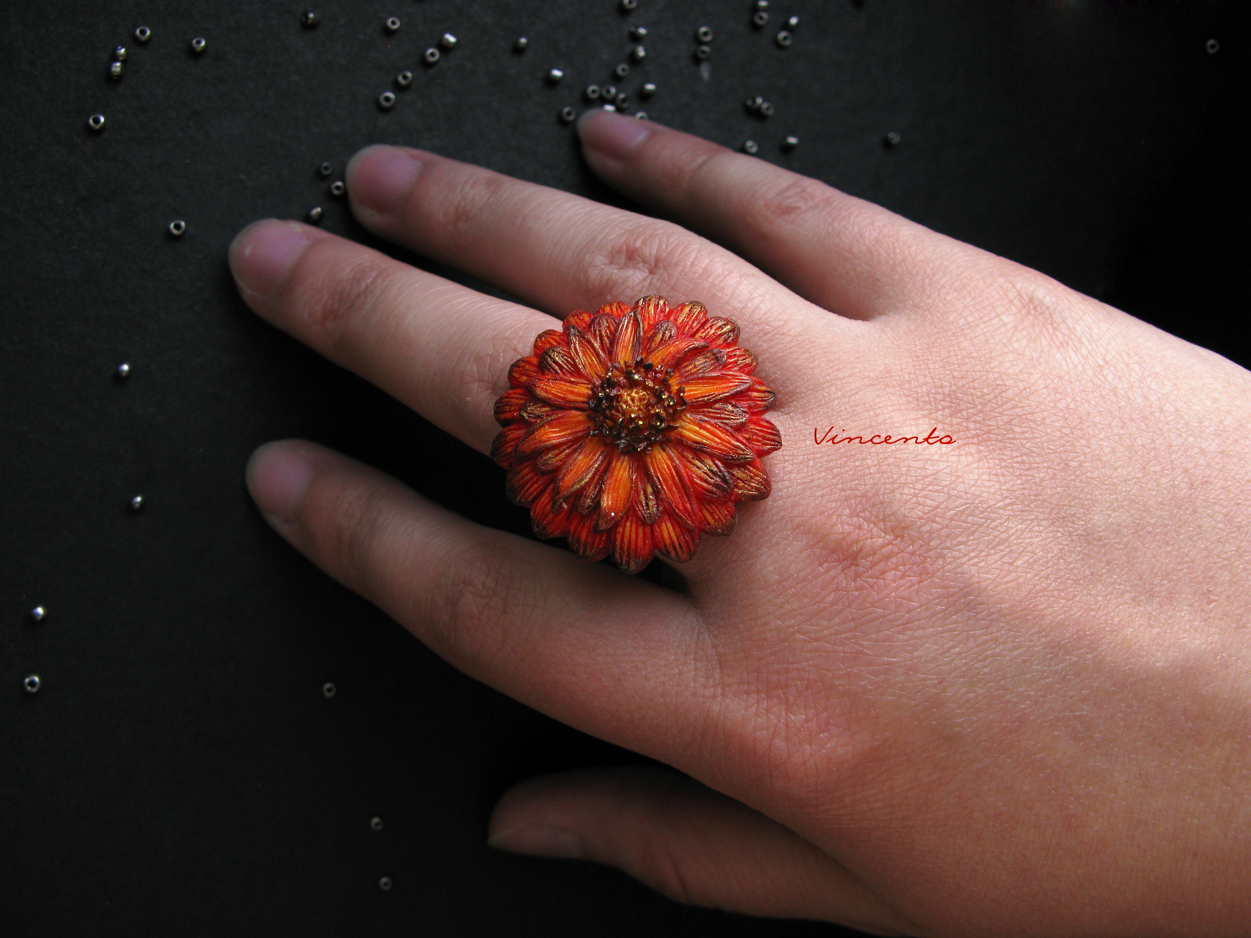 Кольцо-цветок "Календула" из термоглины - летнее оранжевое украшение