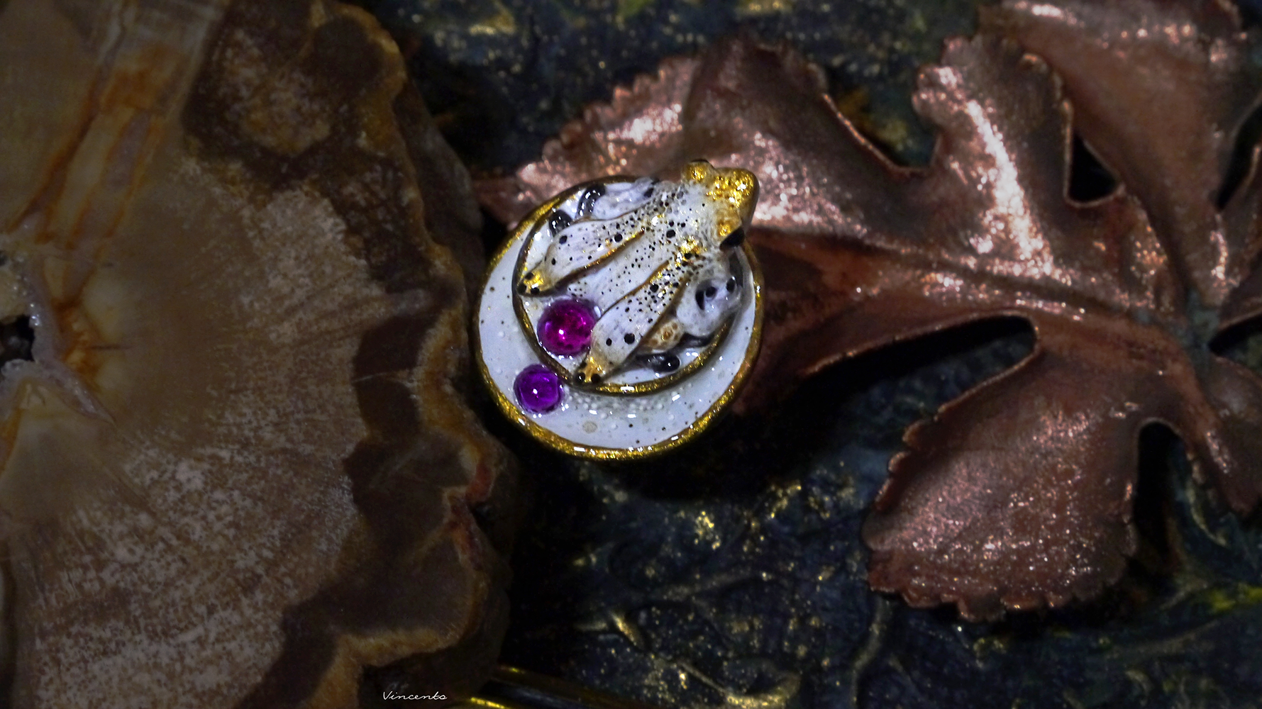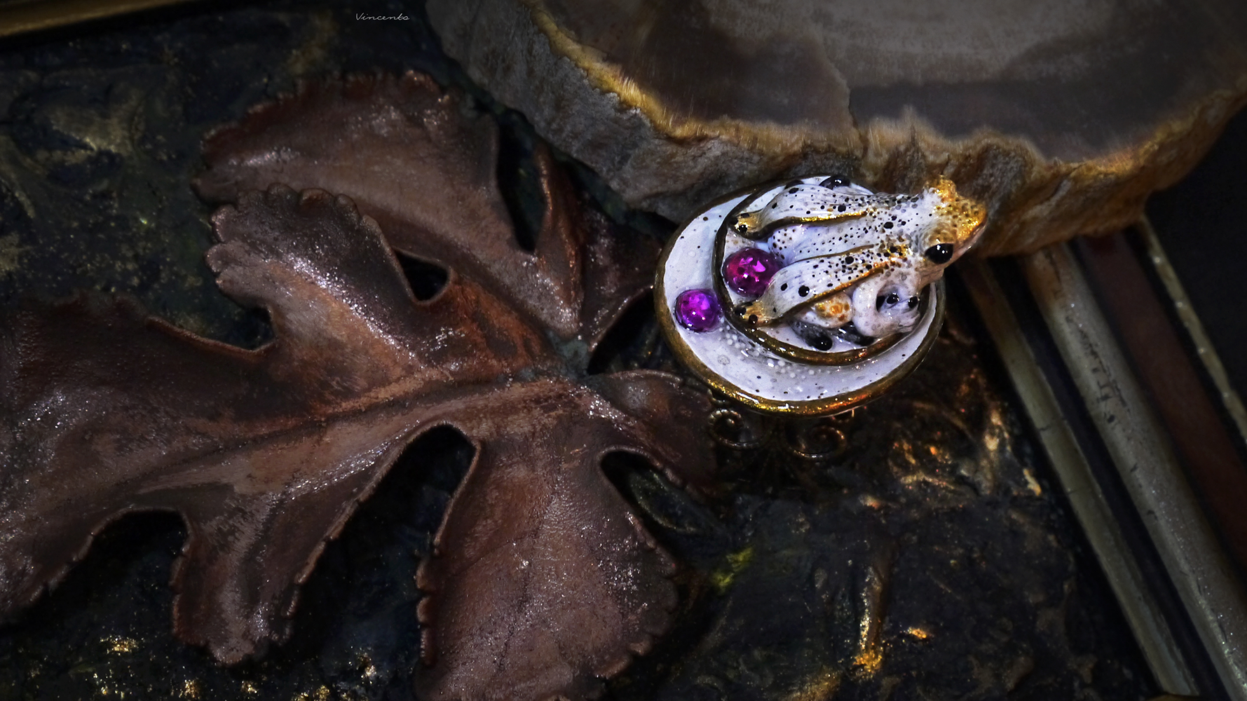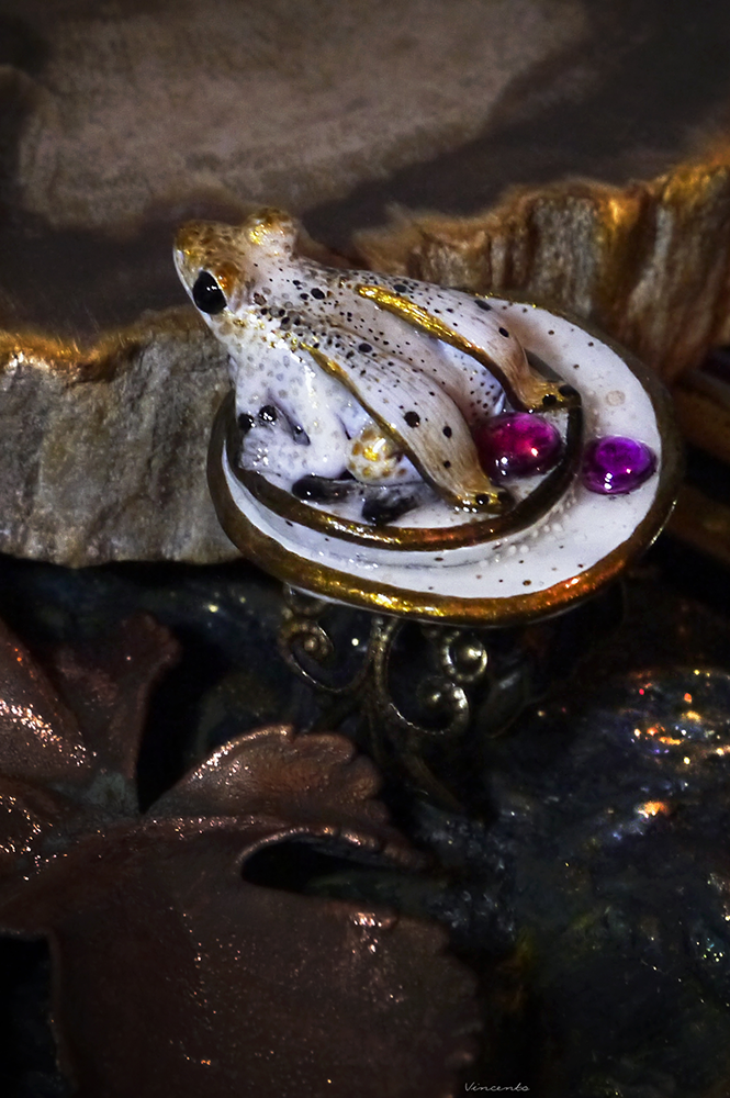 - Волшебное колечко в технике скульптурной миниатюры в виде крошечного лягушачьего Светлячка Кваквази с двумя камешками натурального родолита.