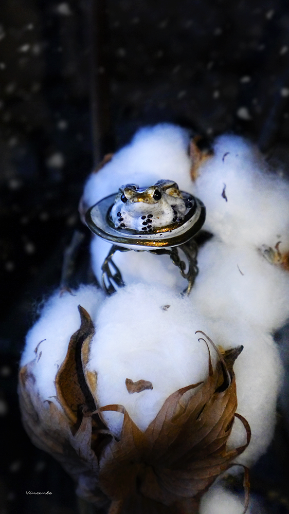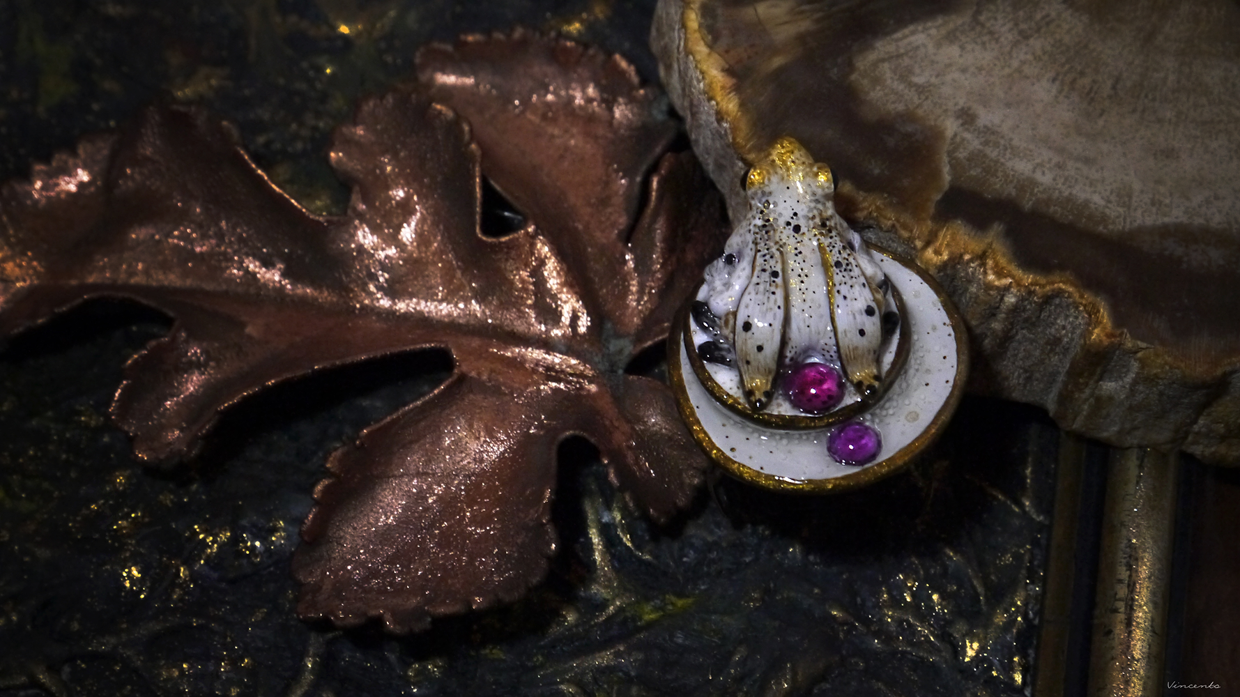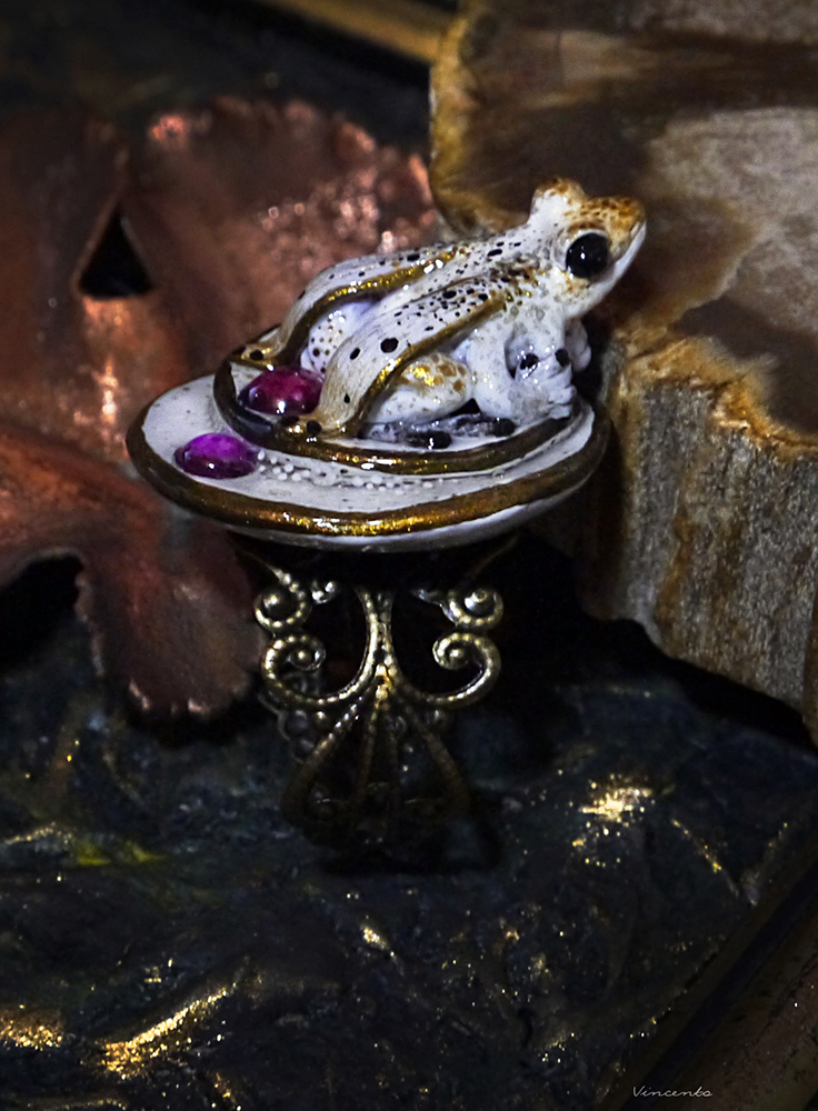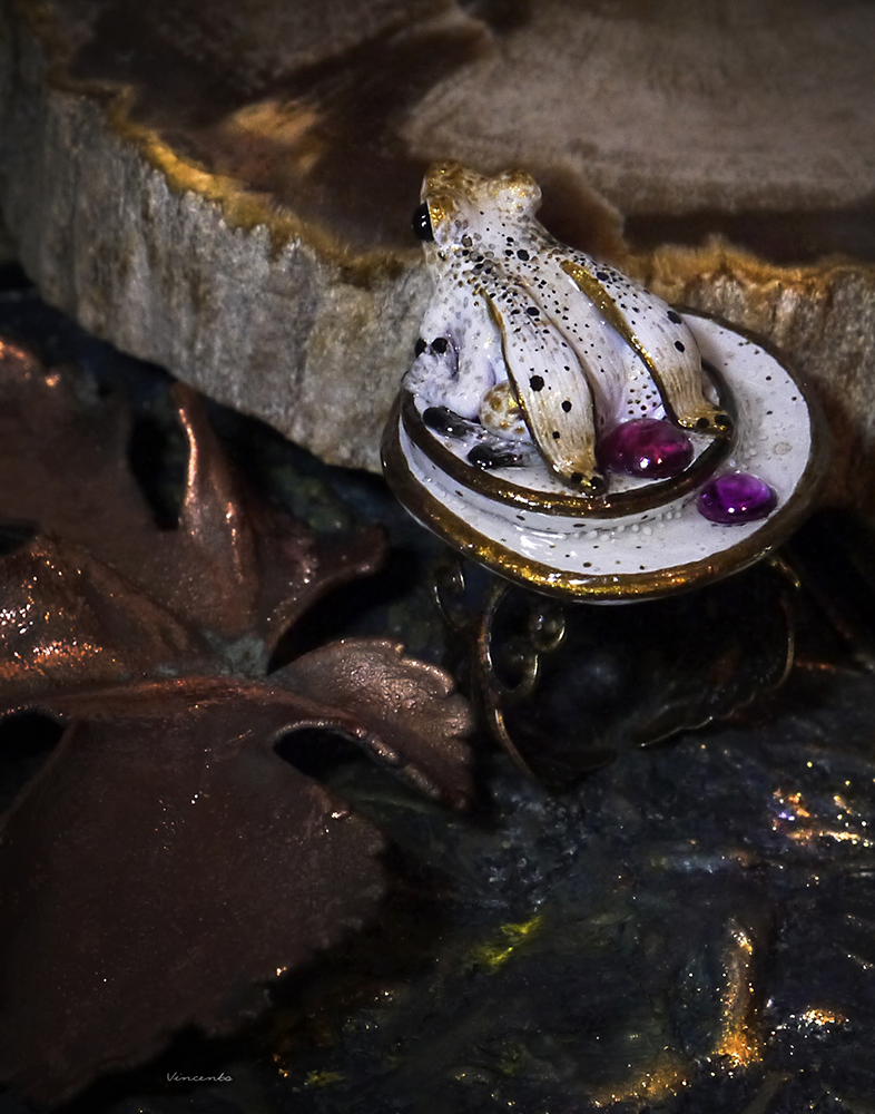 - Цветовая гамма лягушки построена на бело-золотых тонах, тонировка чёрным и оттенками серого. А насыщенные, винные родолиты оживляют весь облик колечка, делая его ещё более нарядным и сказочным.
