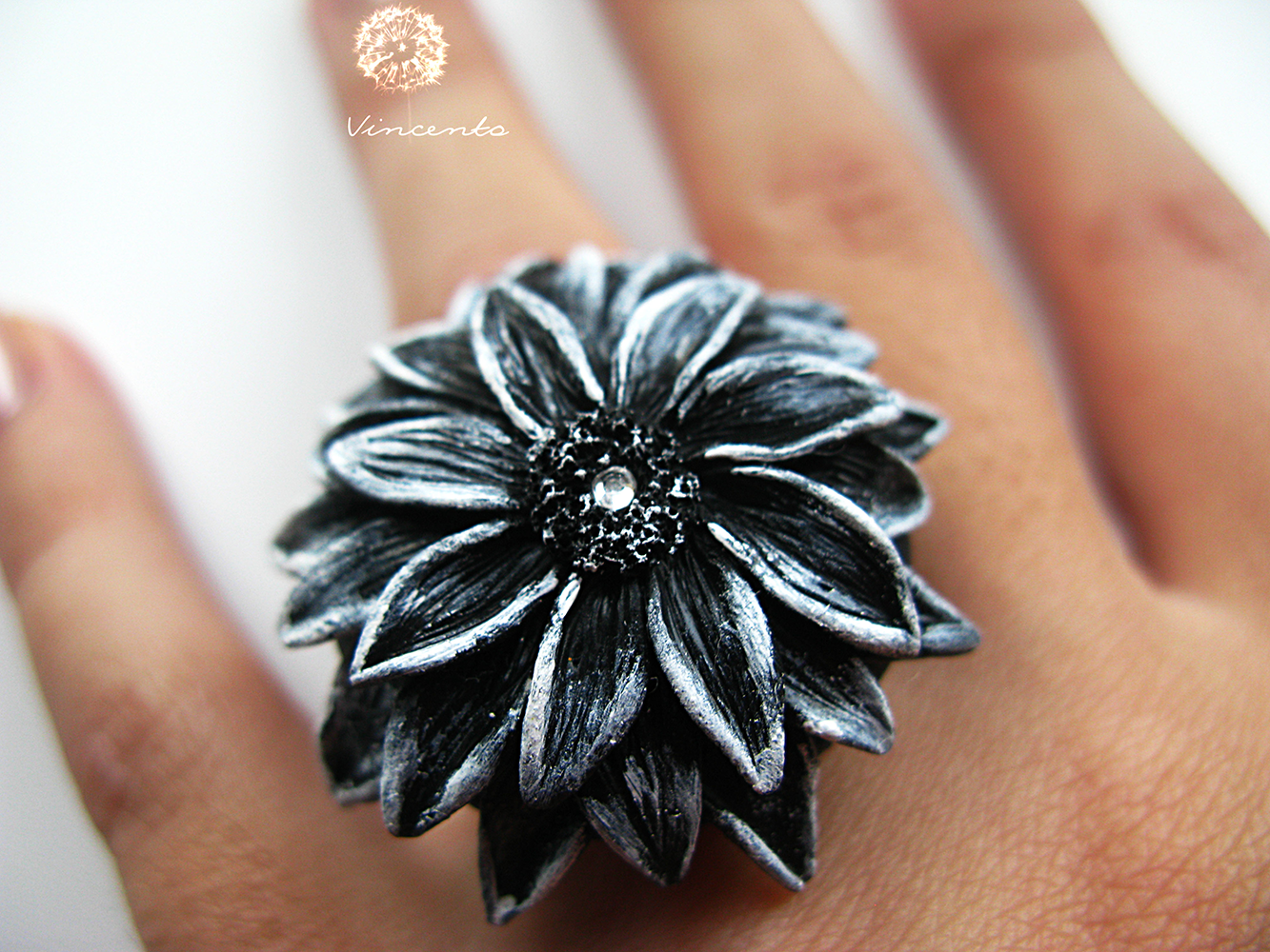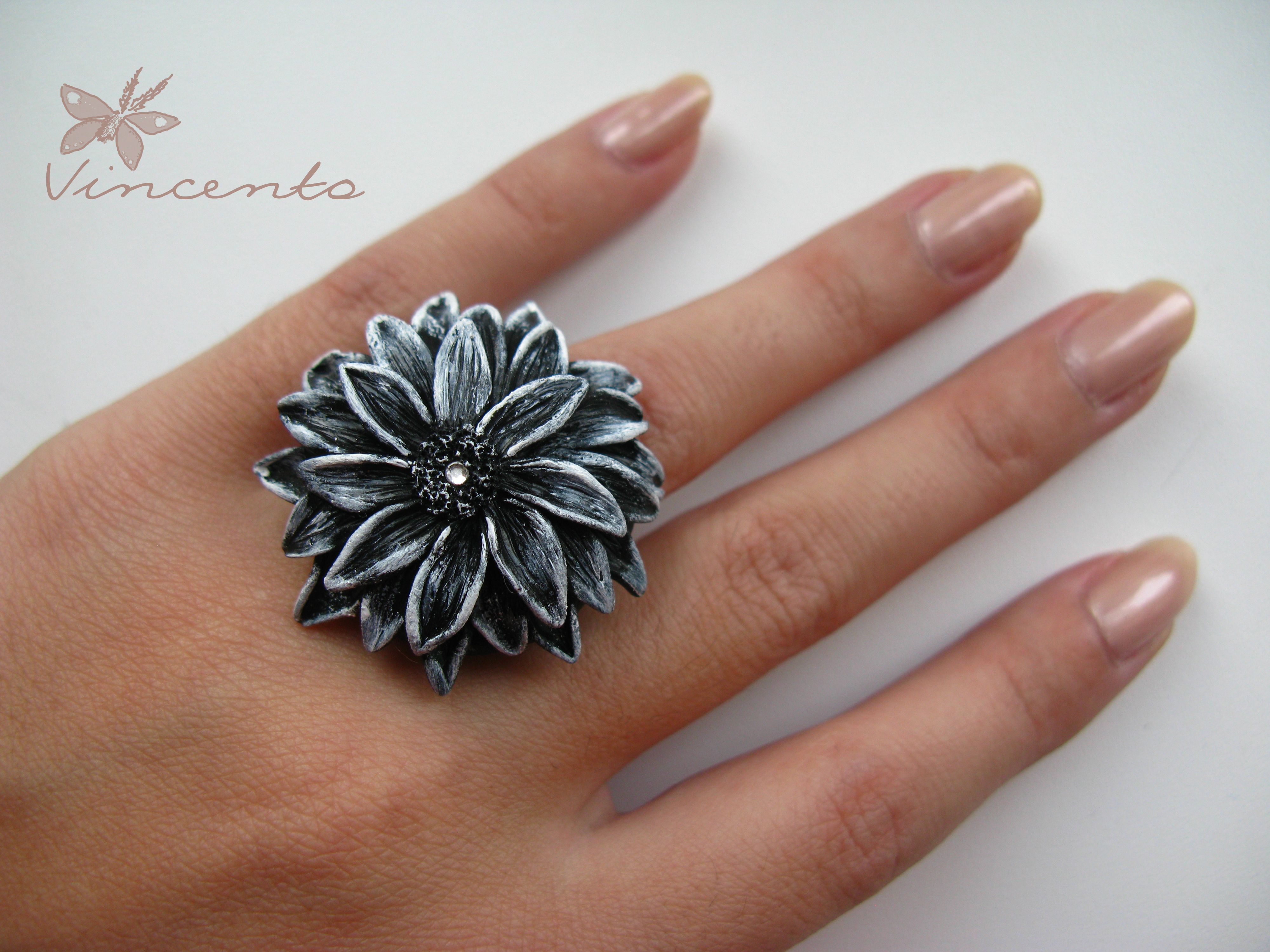 - Очень эффектное кольцо-цветок в чёрно-белой цветовой гамме.