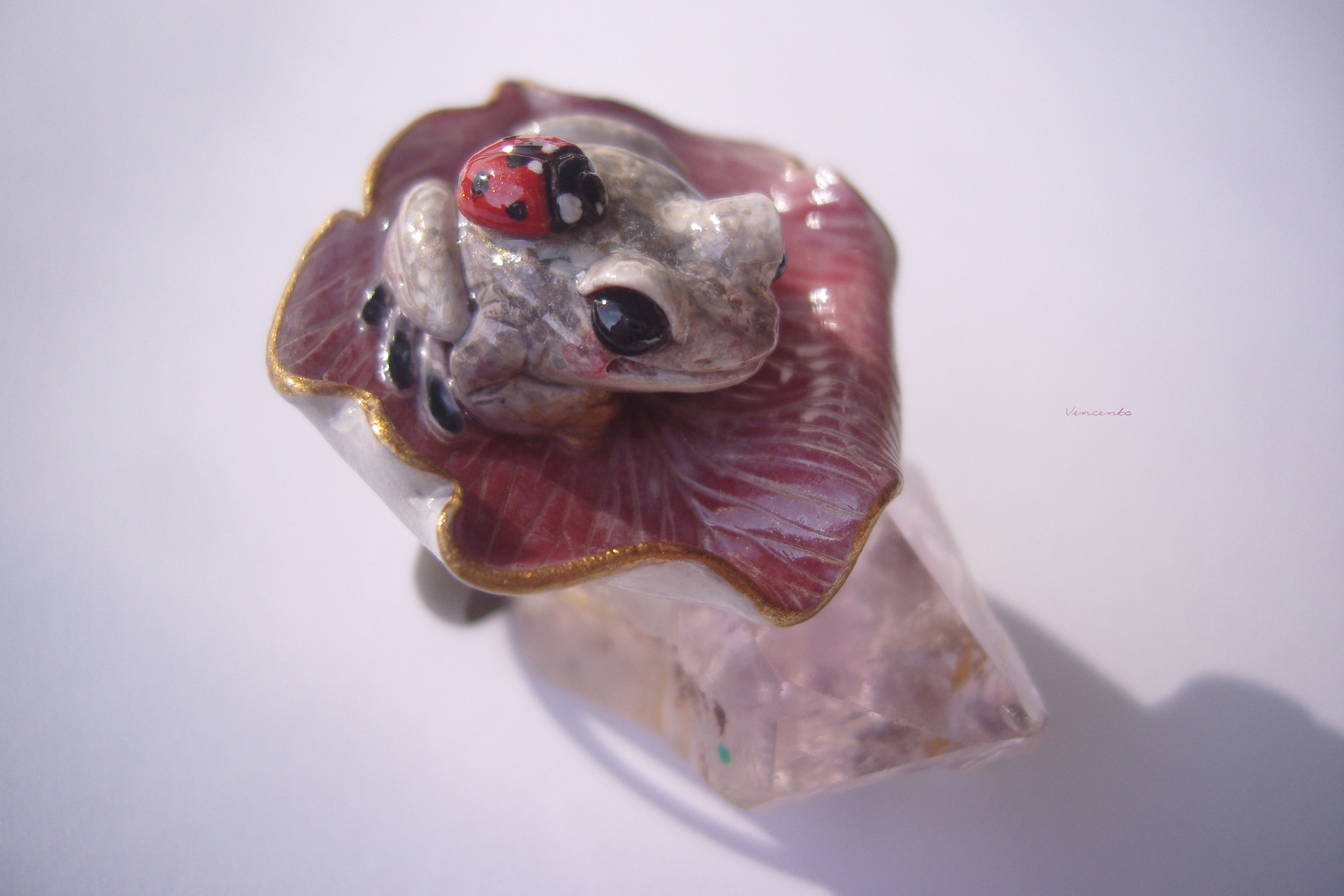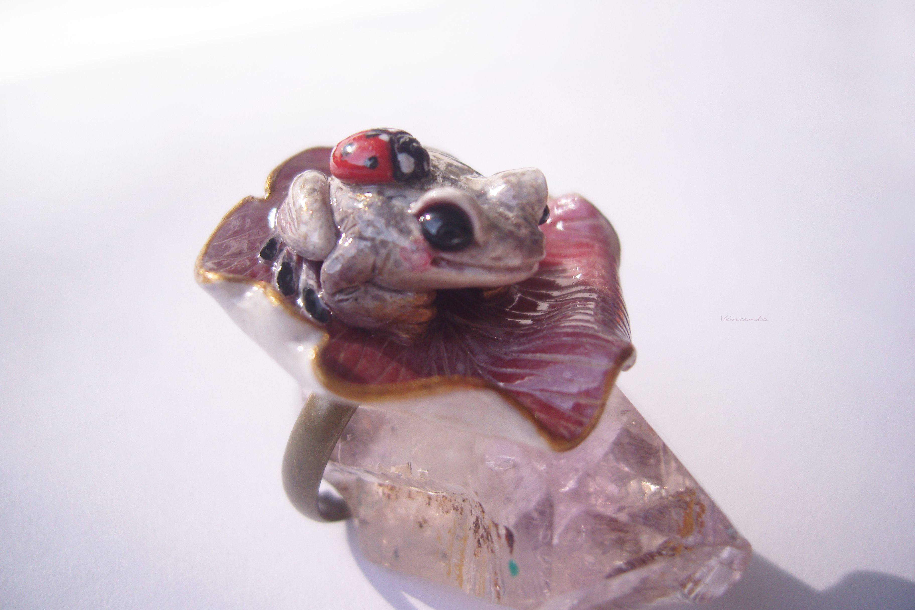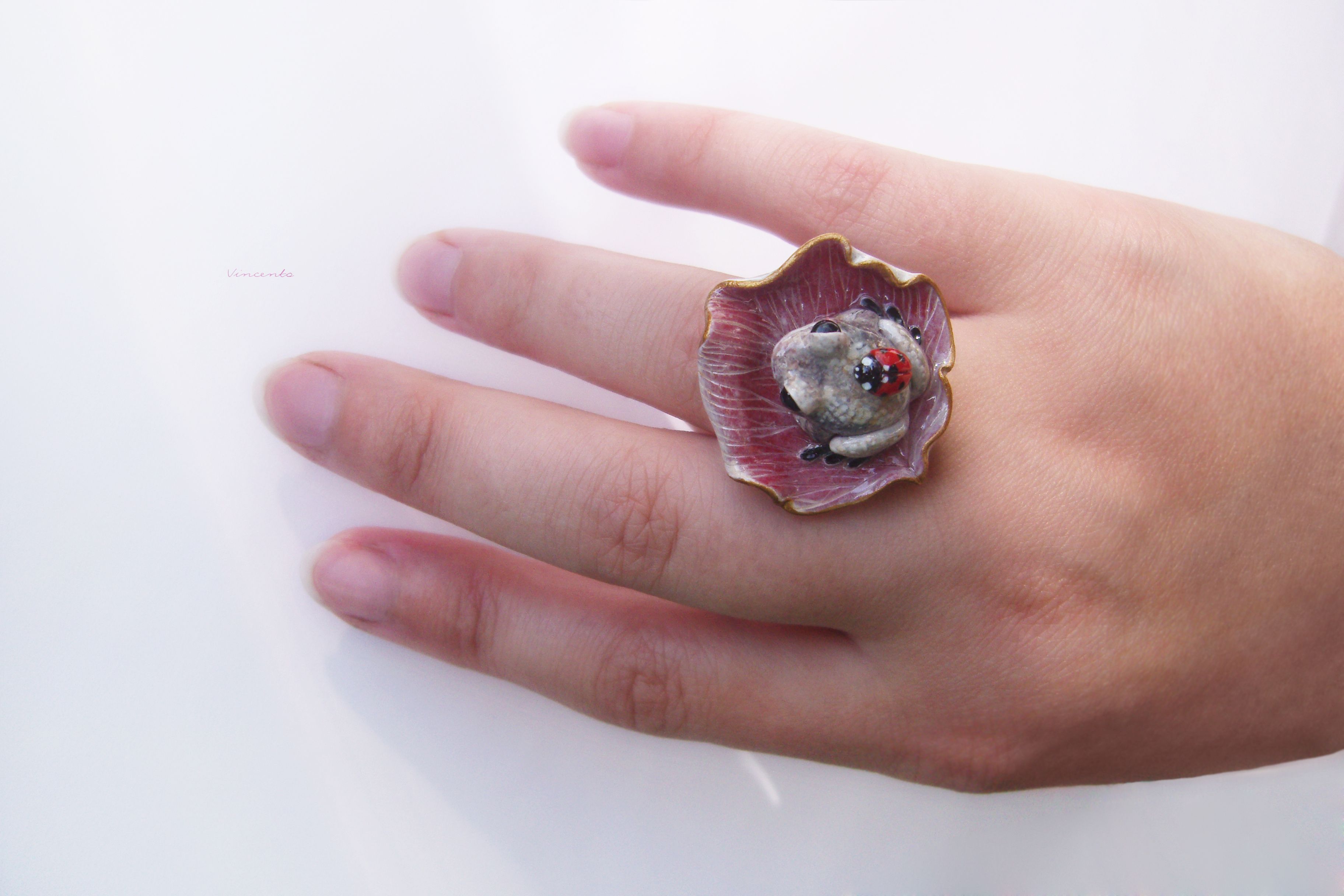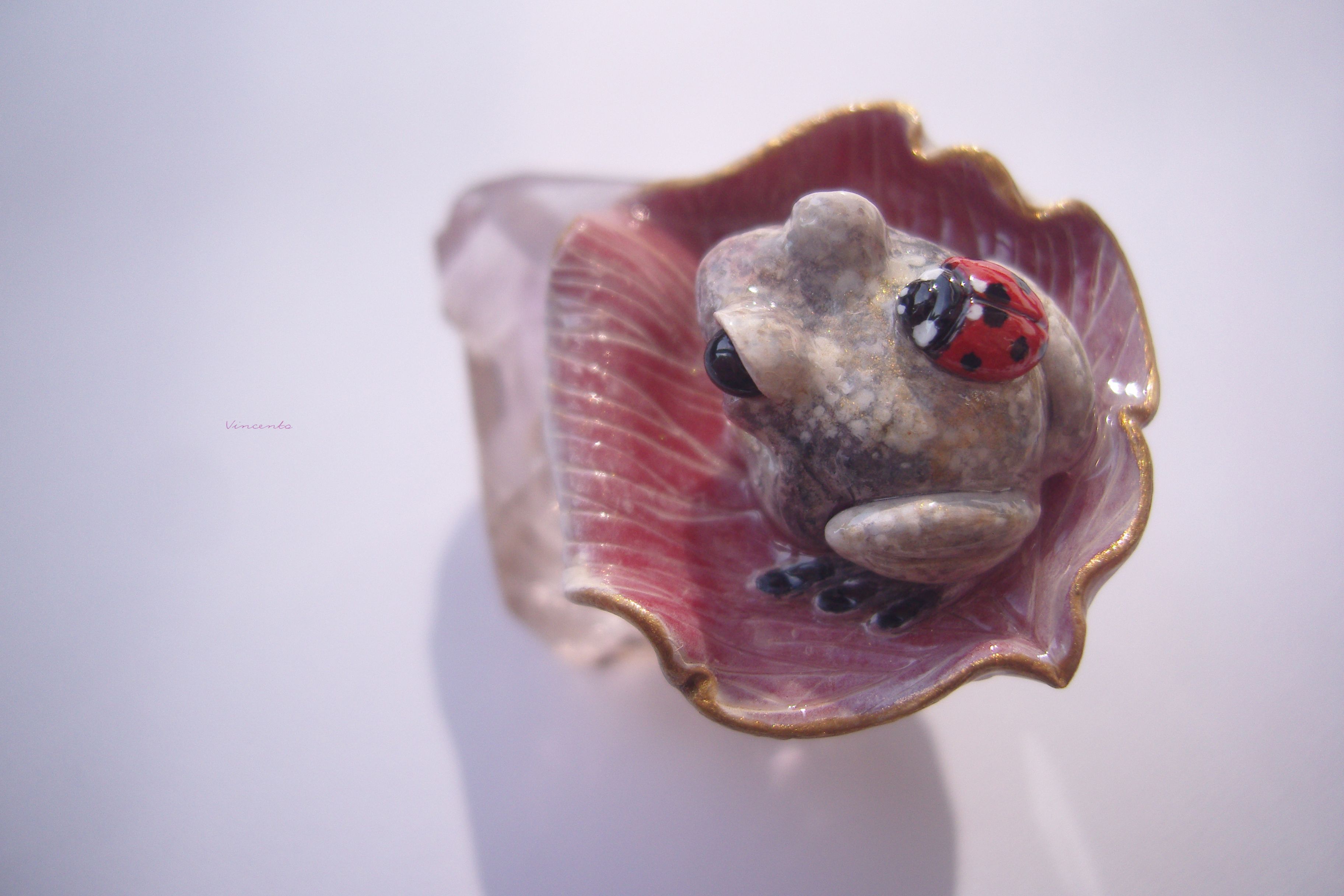 - Нежное, по-летнему романтичное колечко в виде зачарованной принцессы-лягушки Смеяны с ярко-красной божьей коровокой