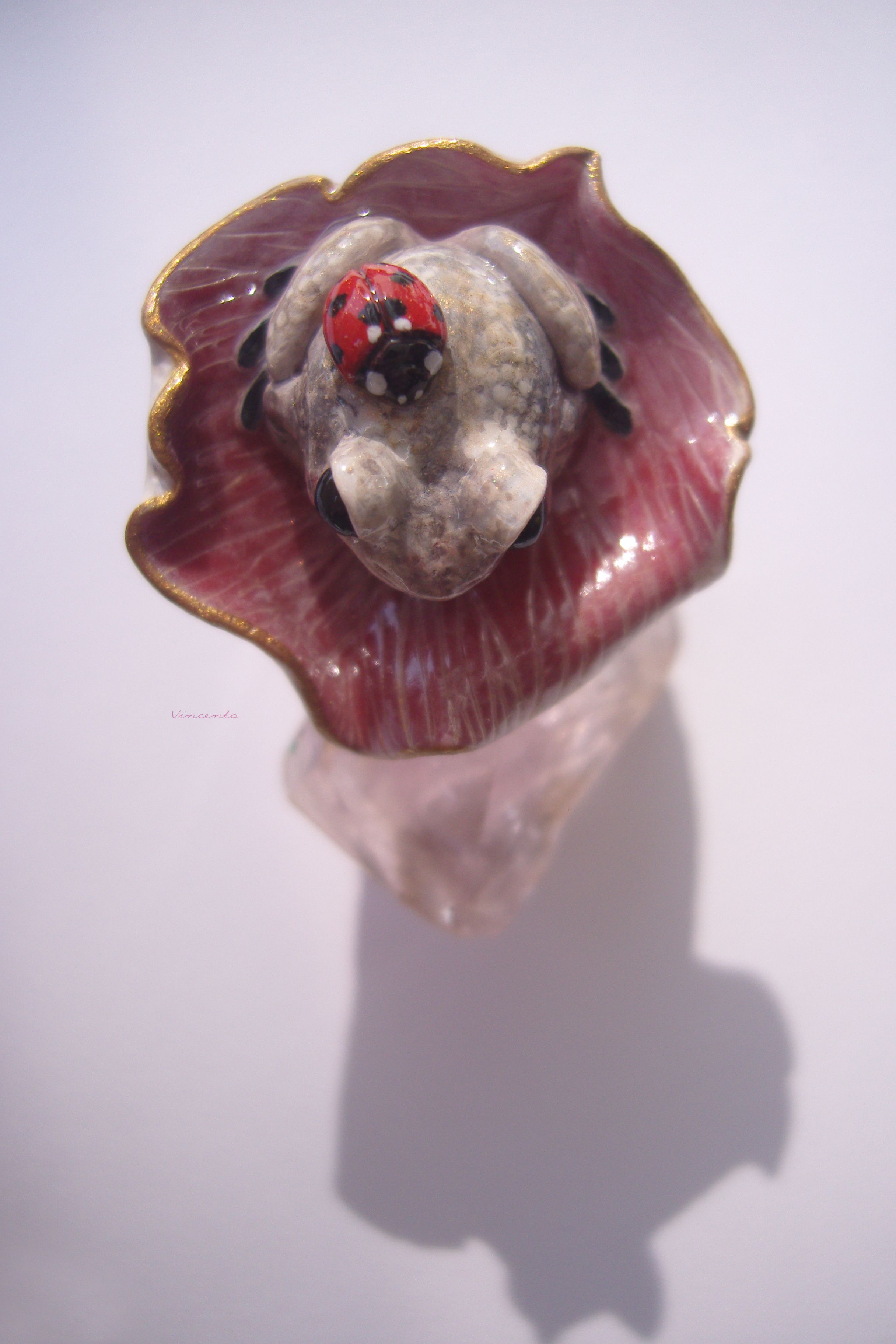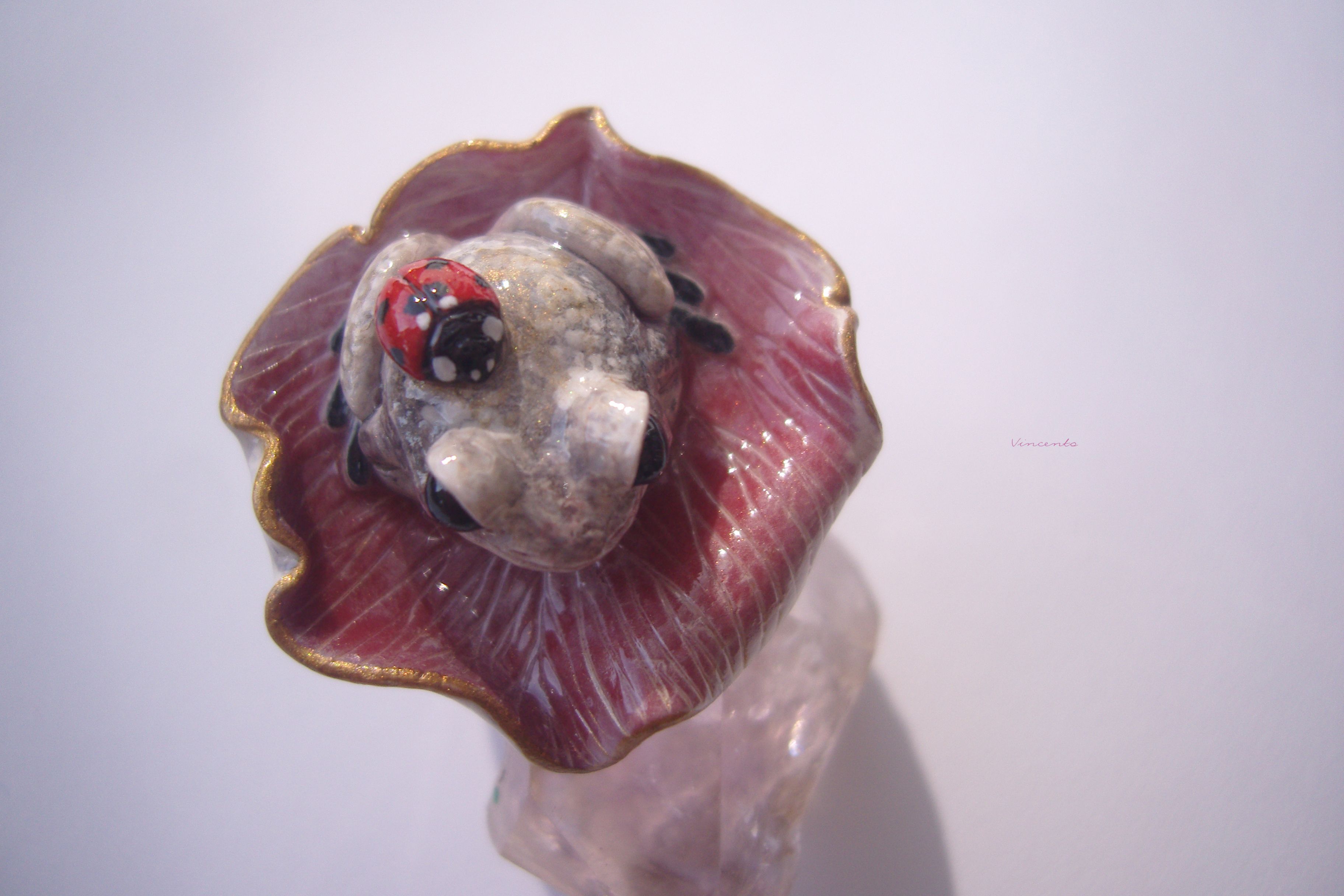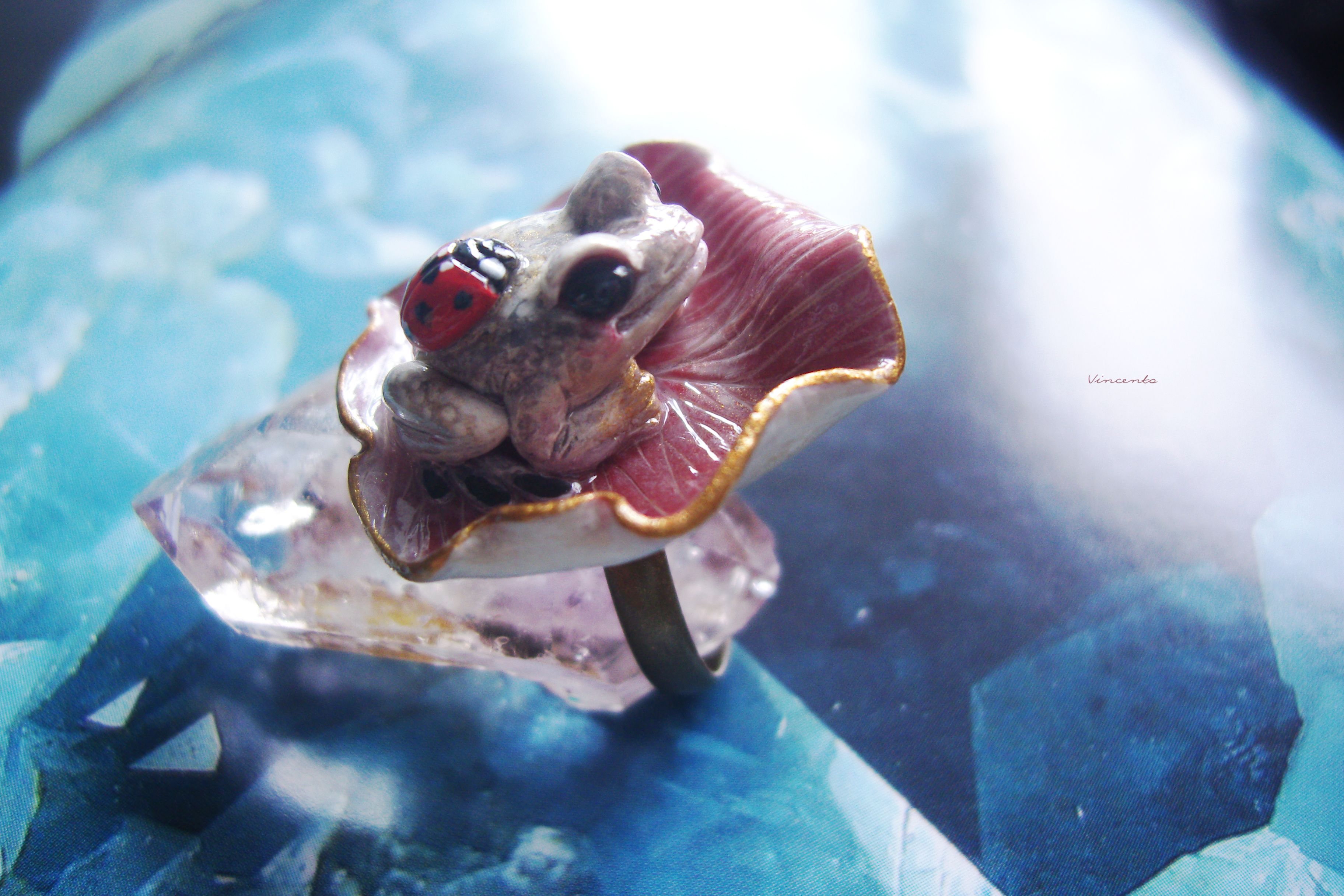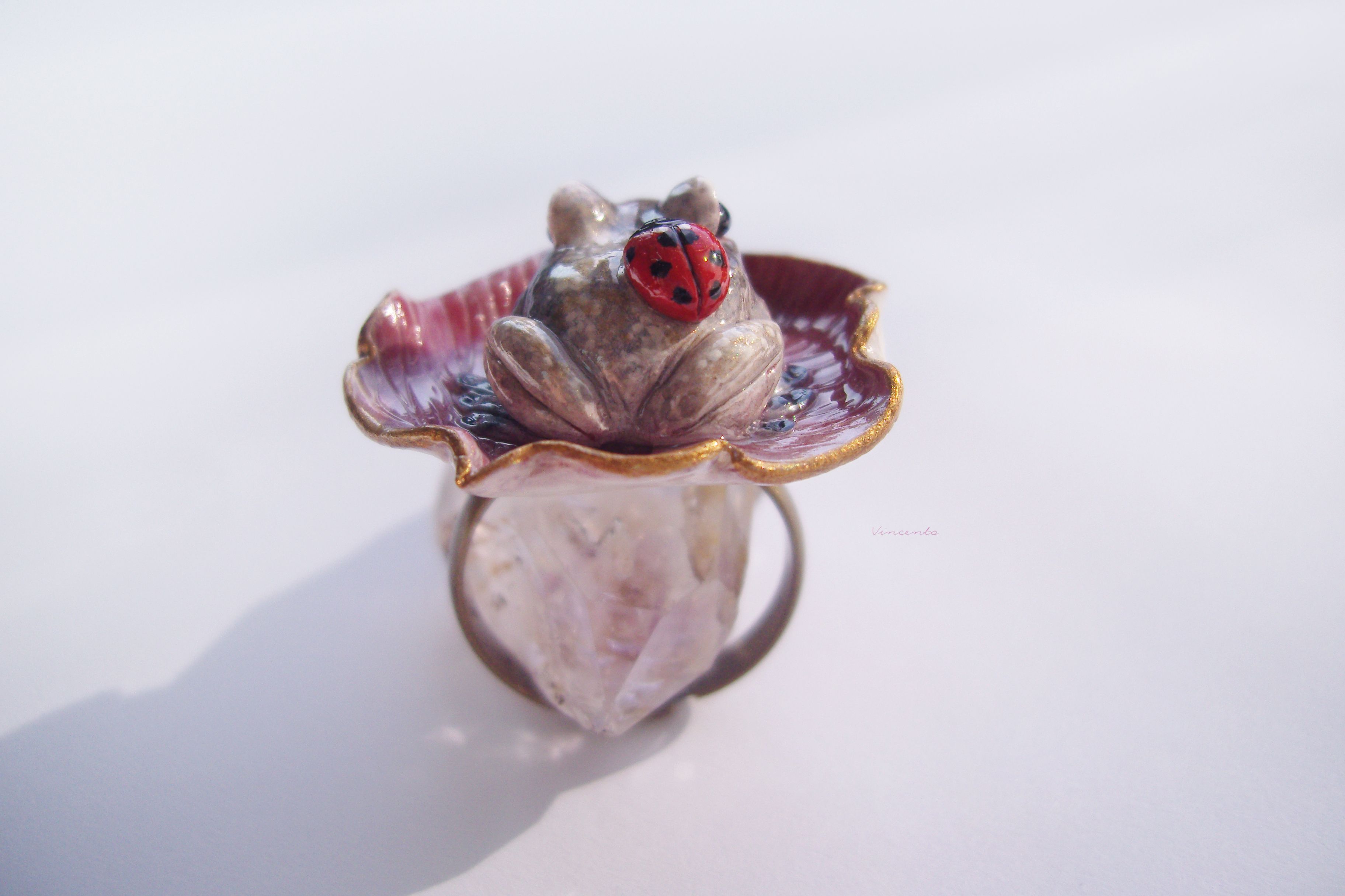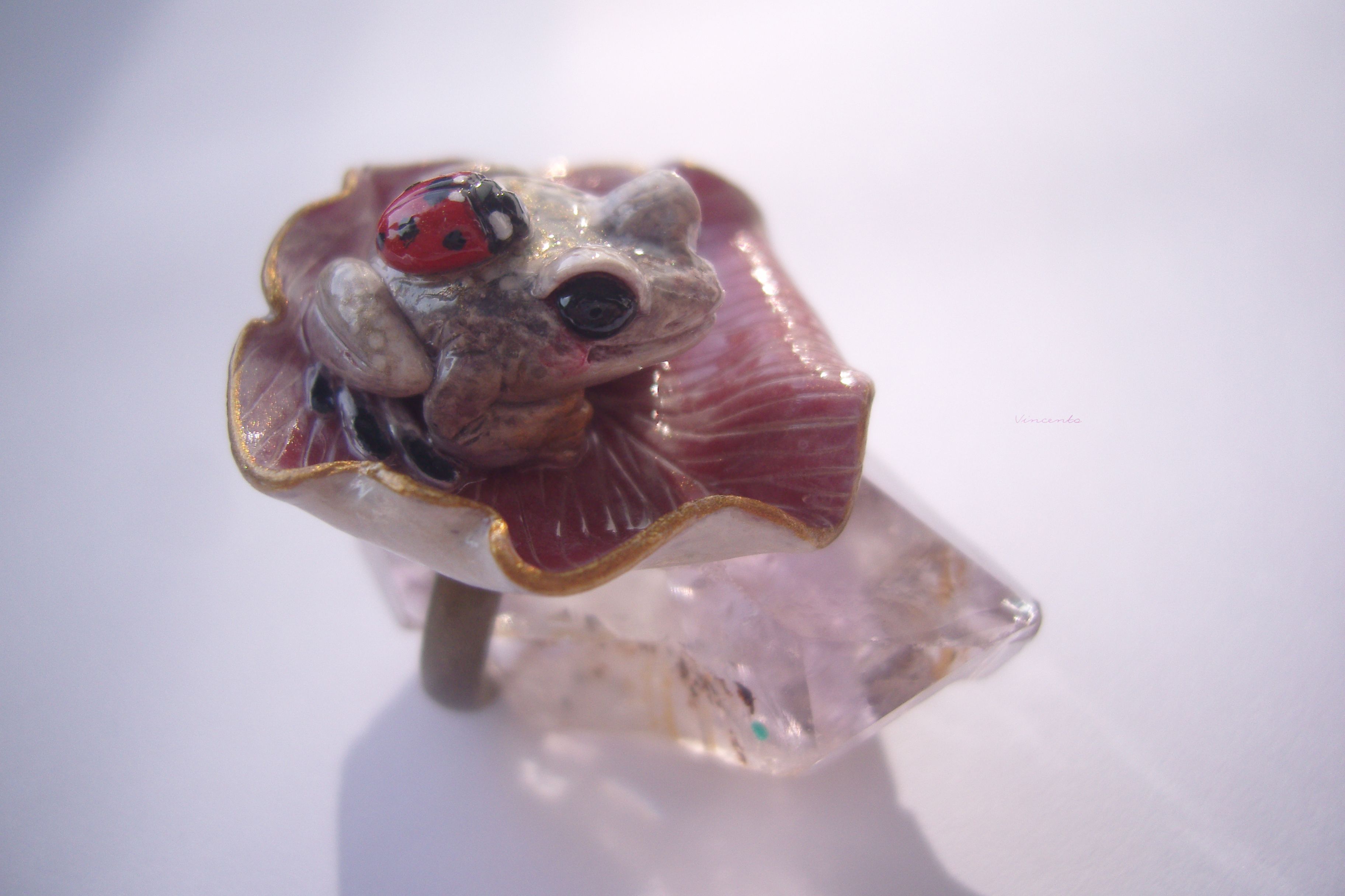 - Нежное, по-летнему романтичное колечко в виде зачарованной принцессы-лягушки Смеяны с ярко-красной божьей коровокой