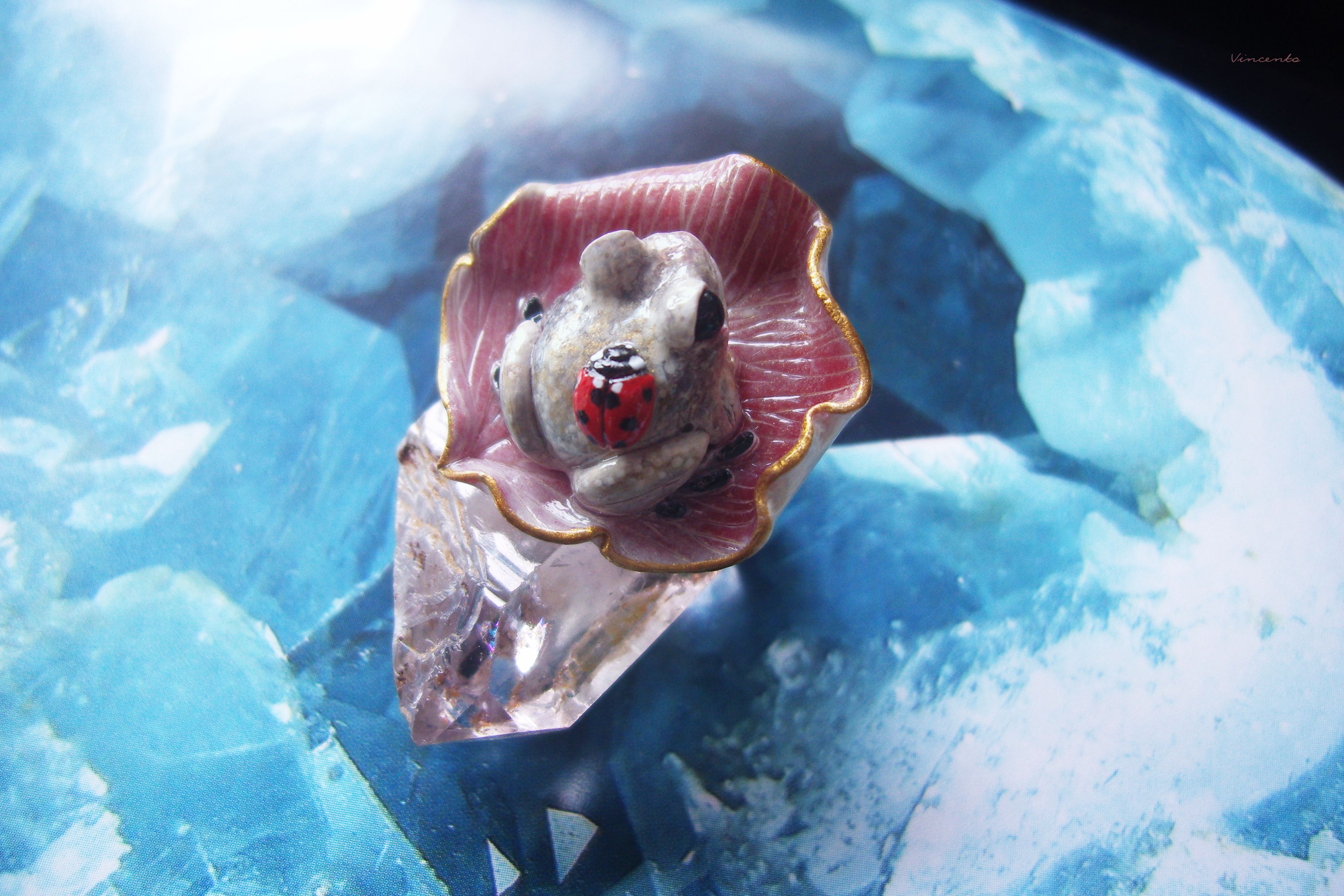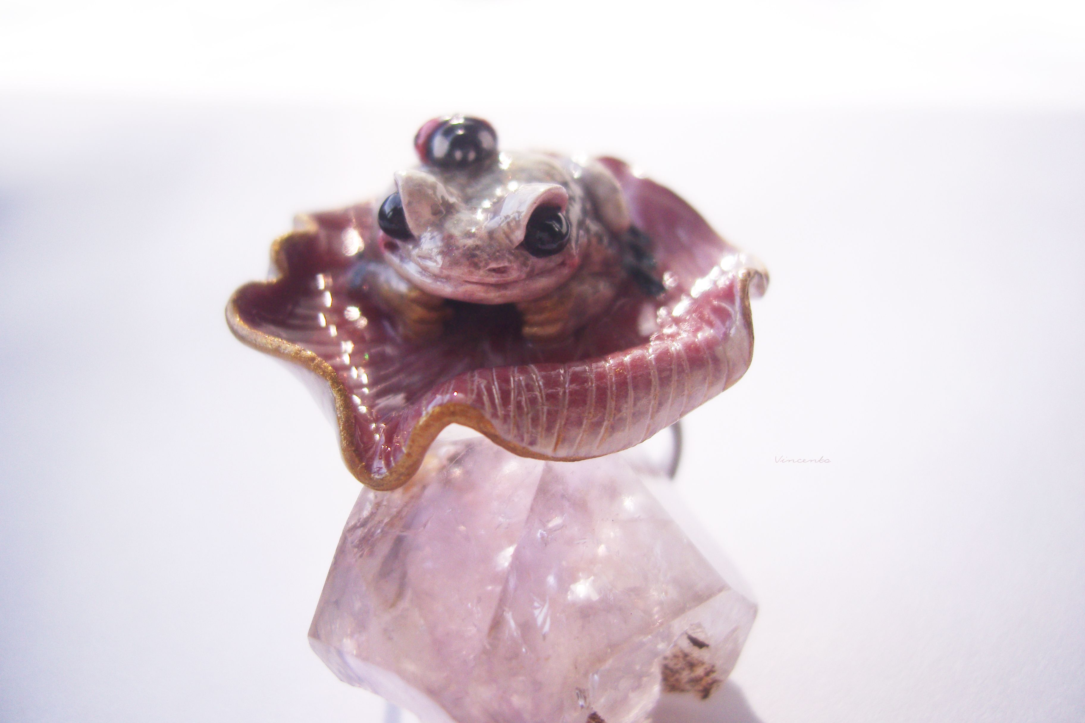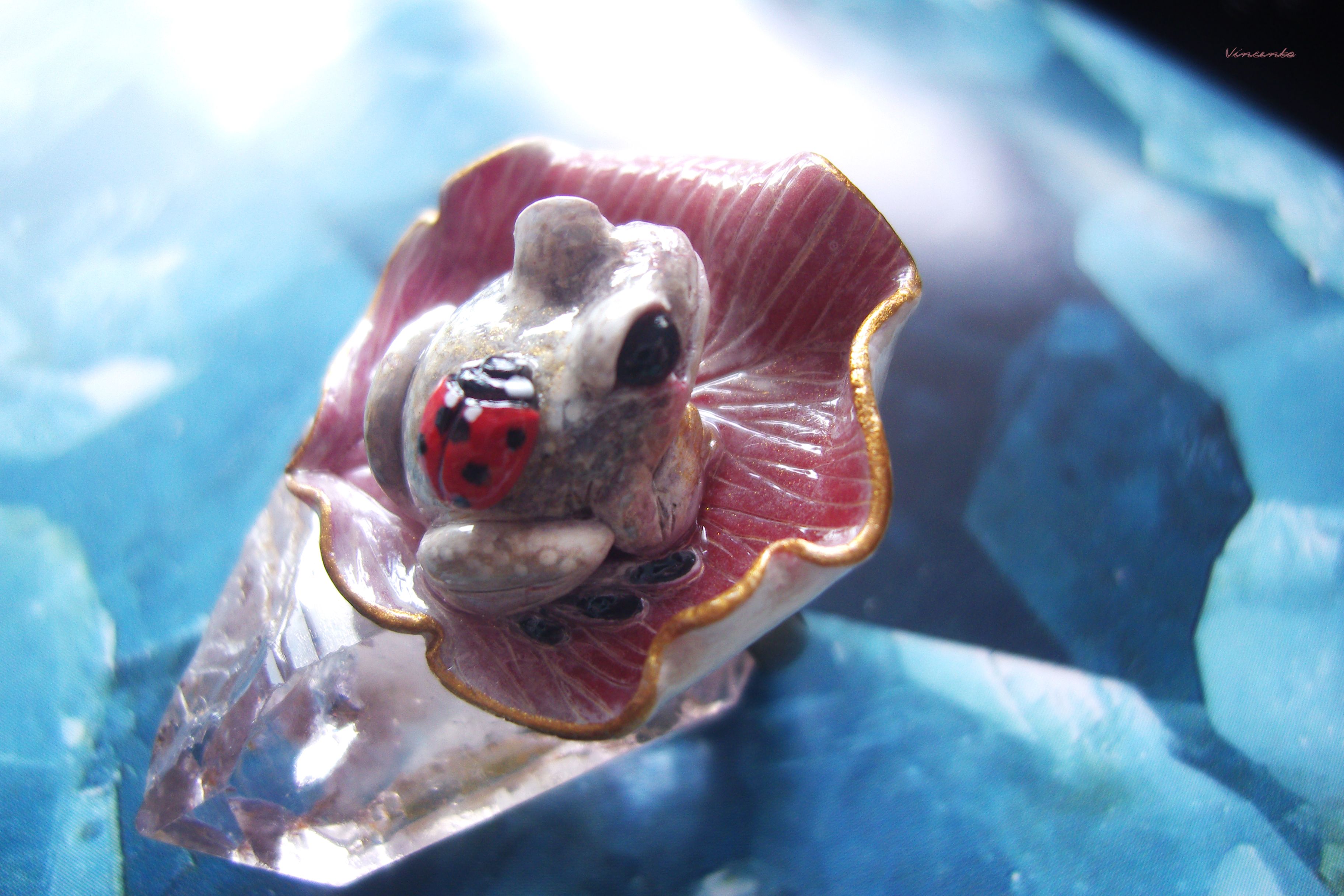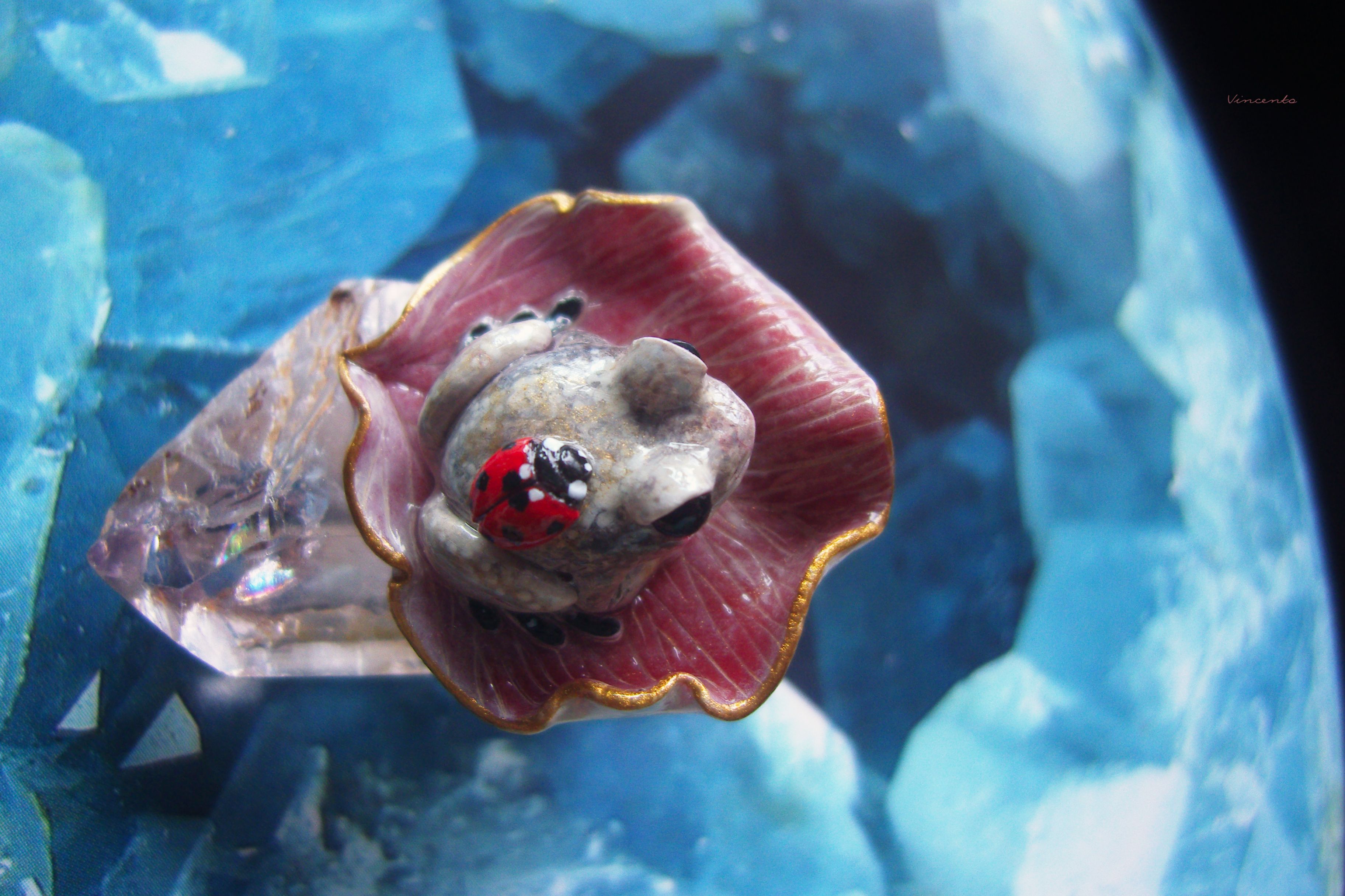 - Нежное, по-летнему романтичное колечко в виде зачарованной принцессы-лягушки Смеяны с ярко-красной божьей коровокой