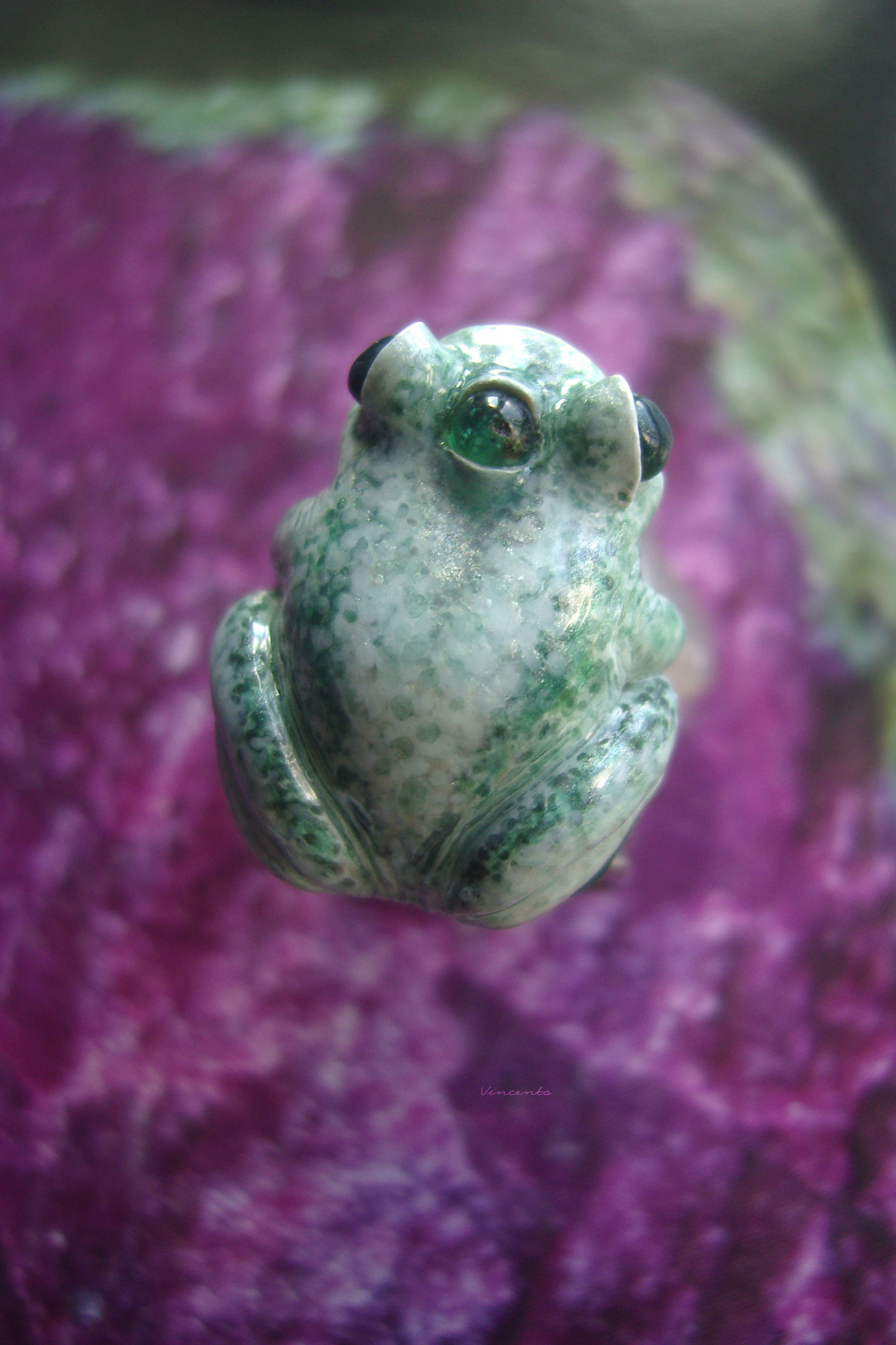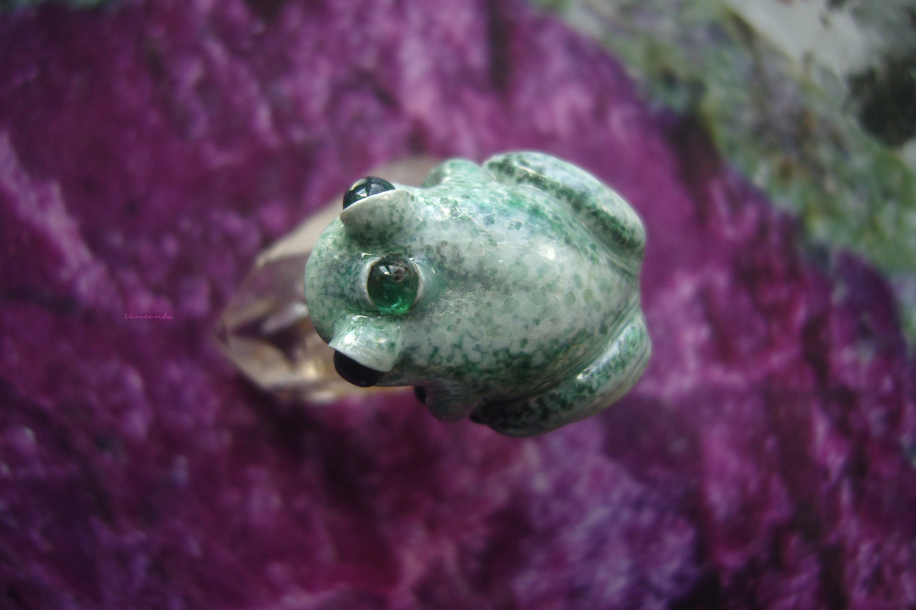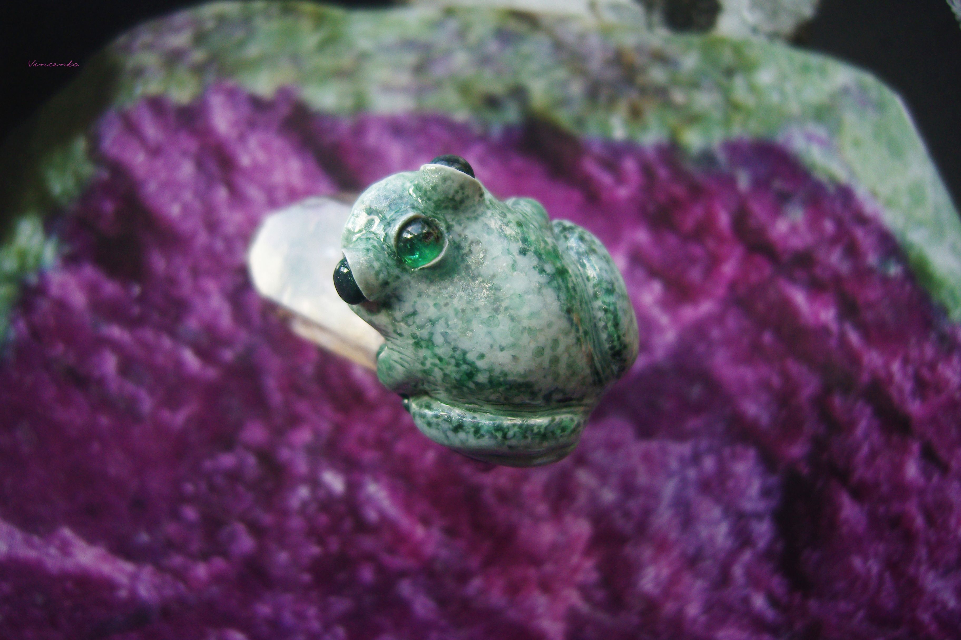 - Третий глаз нашей мифической лягушки — камешек натурального изумруда, фактурного, с неровной поверхностью и вкраплениями породы.