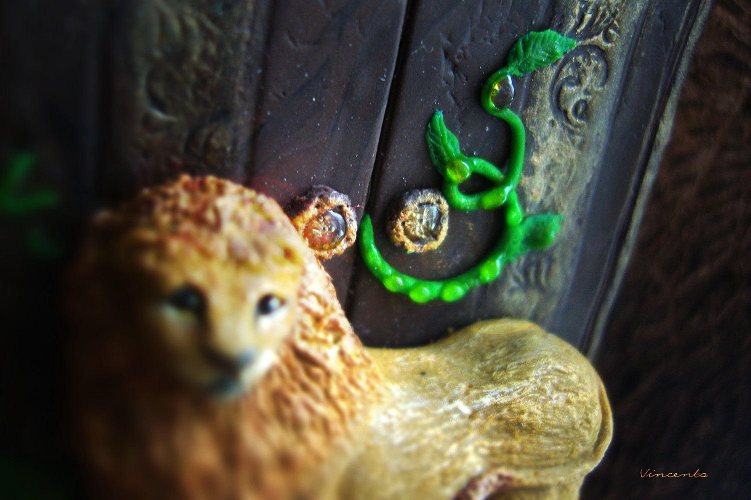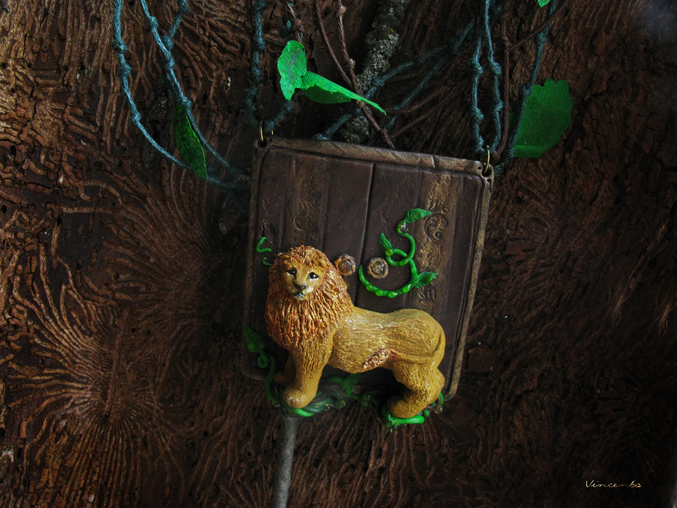 - В центре - подвеска в виде царственного льва Аслана. Позади него - старинный шкаф, дверцы которого поросли лесными травами с капельками прозрачной росы...