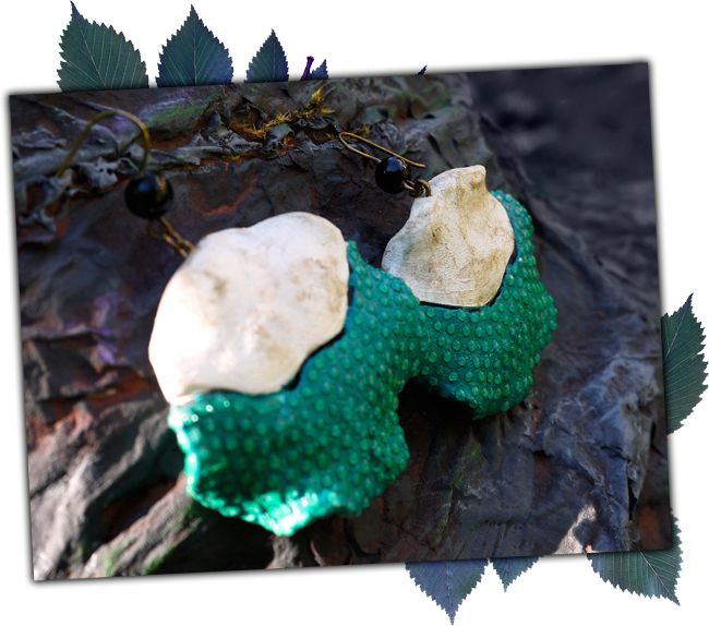 - Серьги, аналогичные центральному элементу колье, круглые, разделённые надвое, словно кромка леса и рассветное небо линией горизонта, покрытые россыпью прозрачных росинок, дополнены гладкими чёрными бусинами. Может, это обычное чёрное дерево... А может, древние артефакты, сдерживающие силы ночных духов...